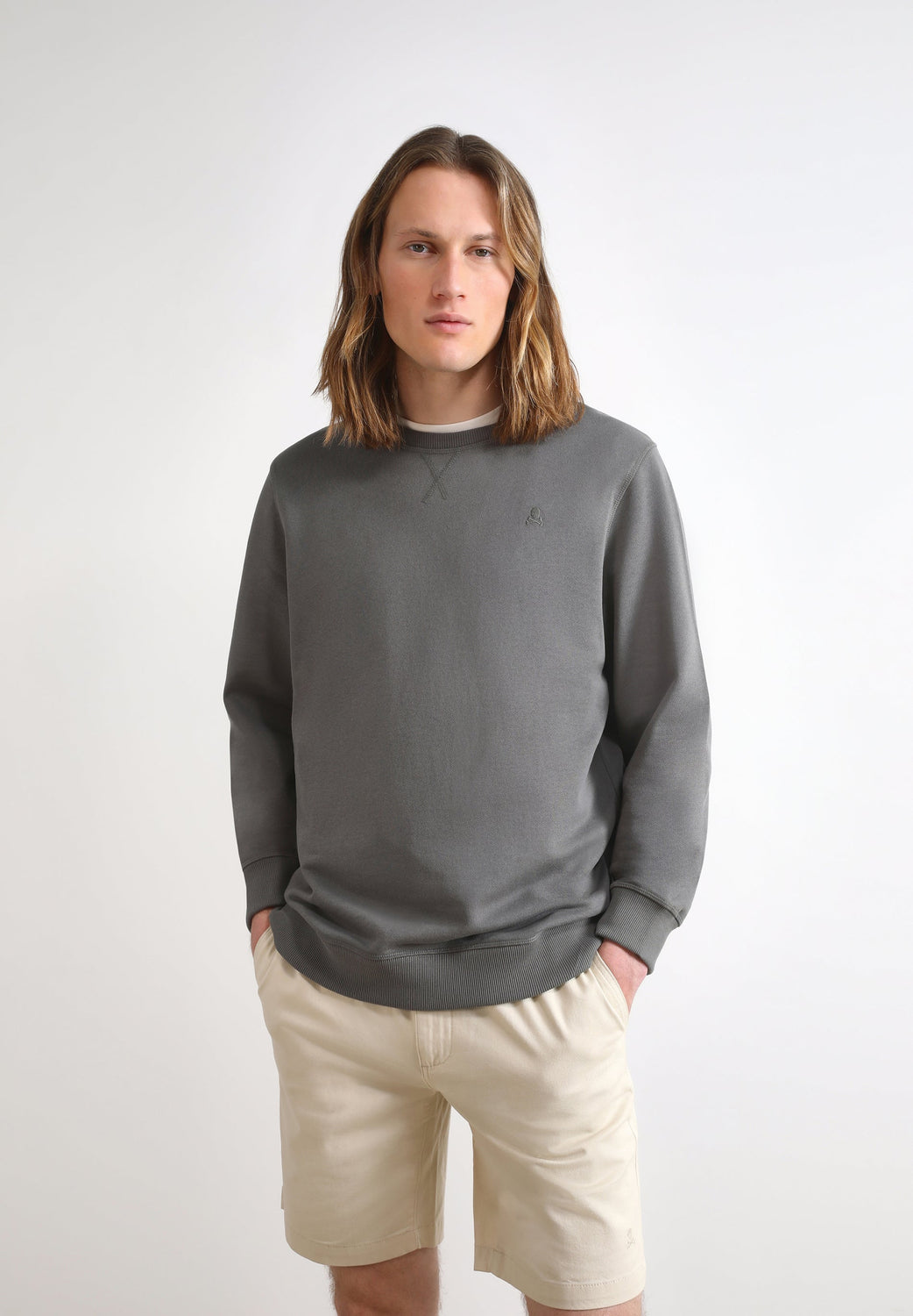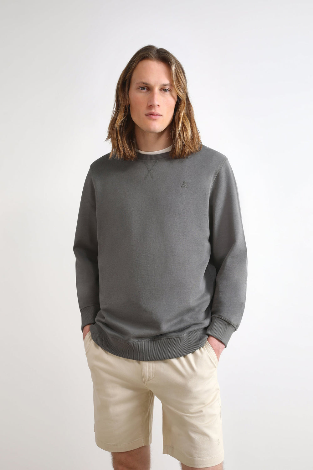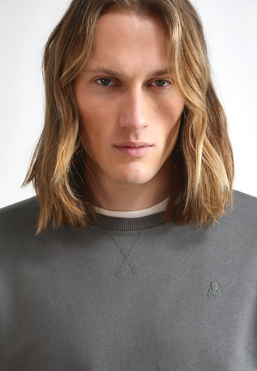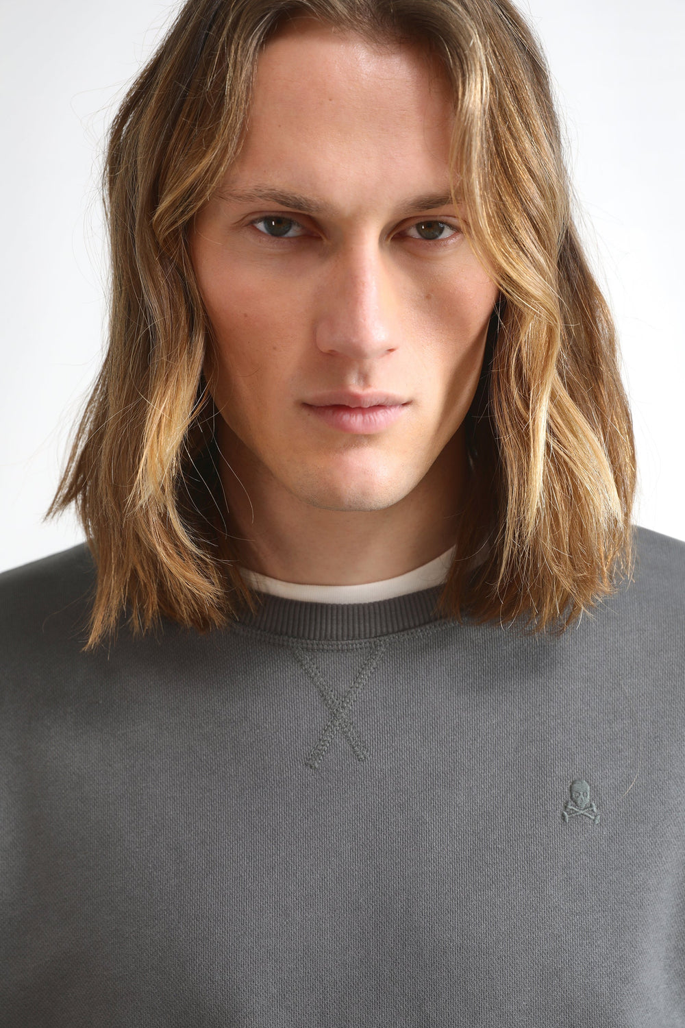 • Calavera bordada a tono en el pecho.