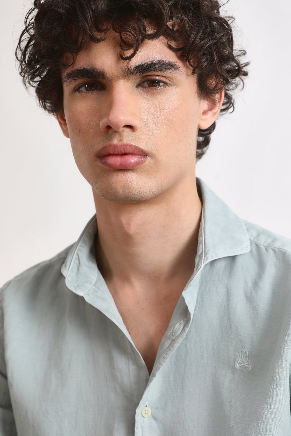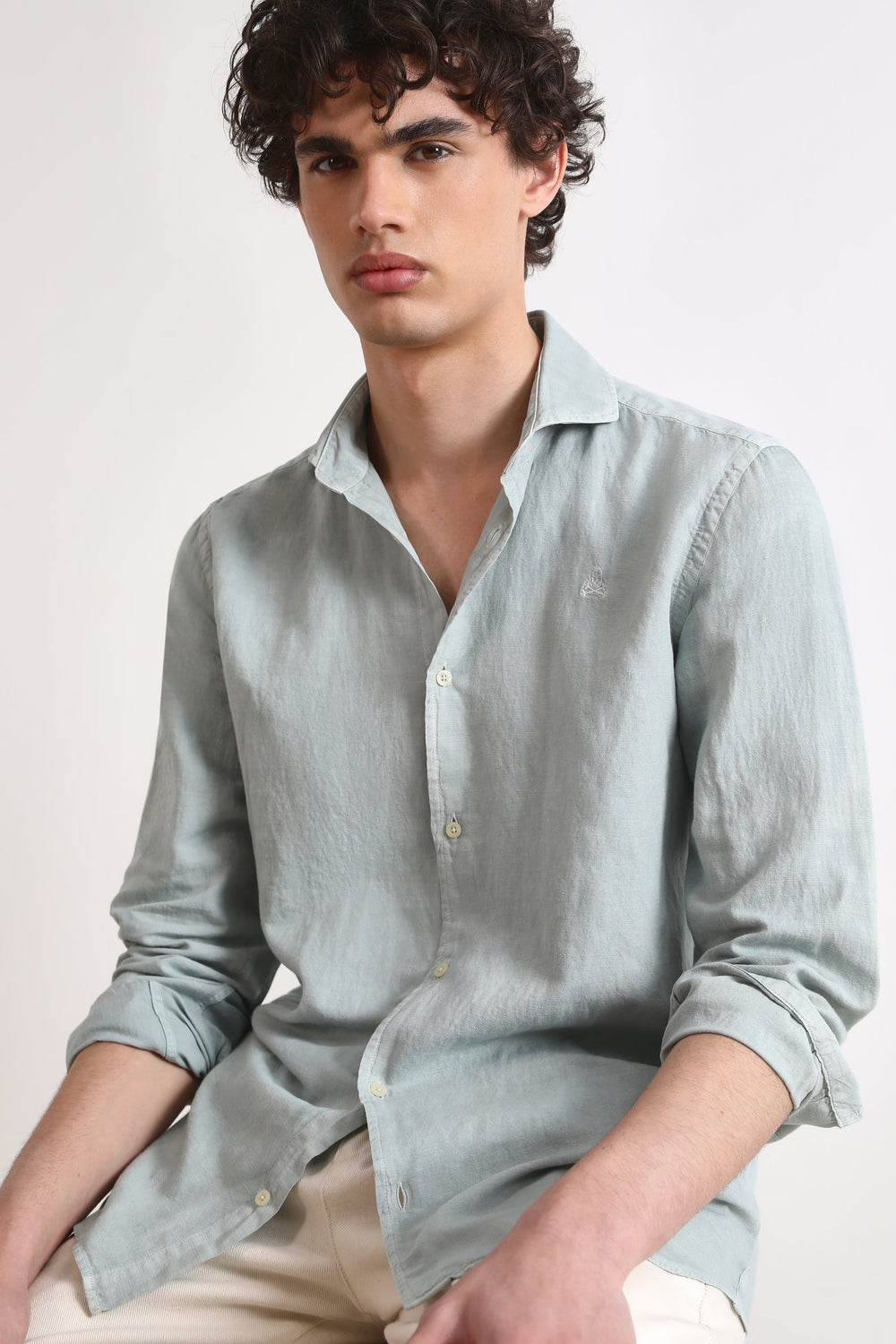 Camisa lino con calavera bordada a tono.