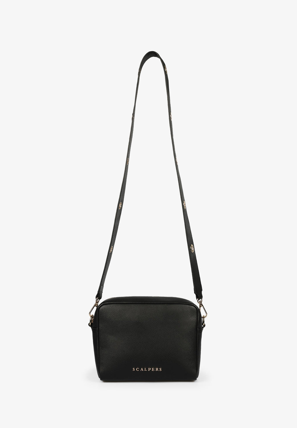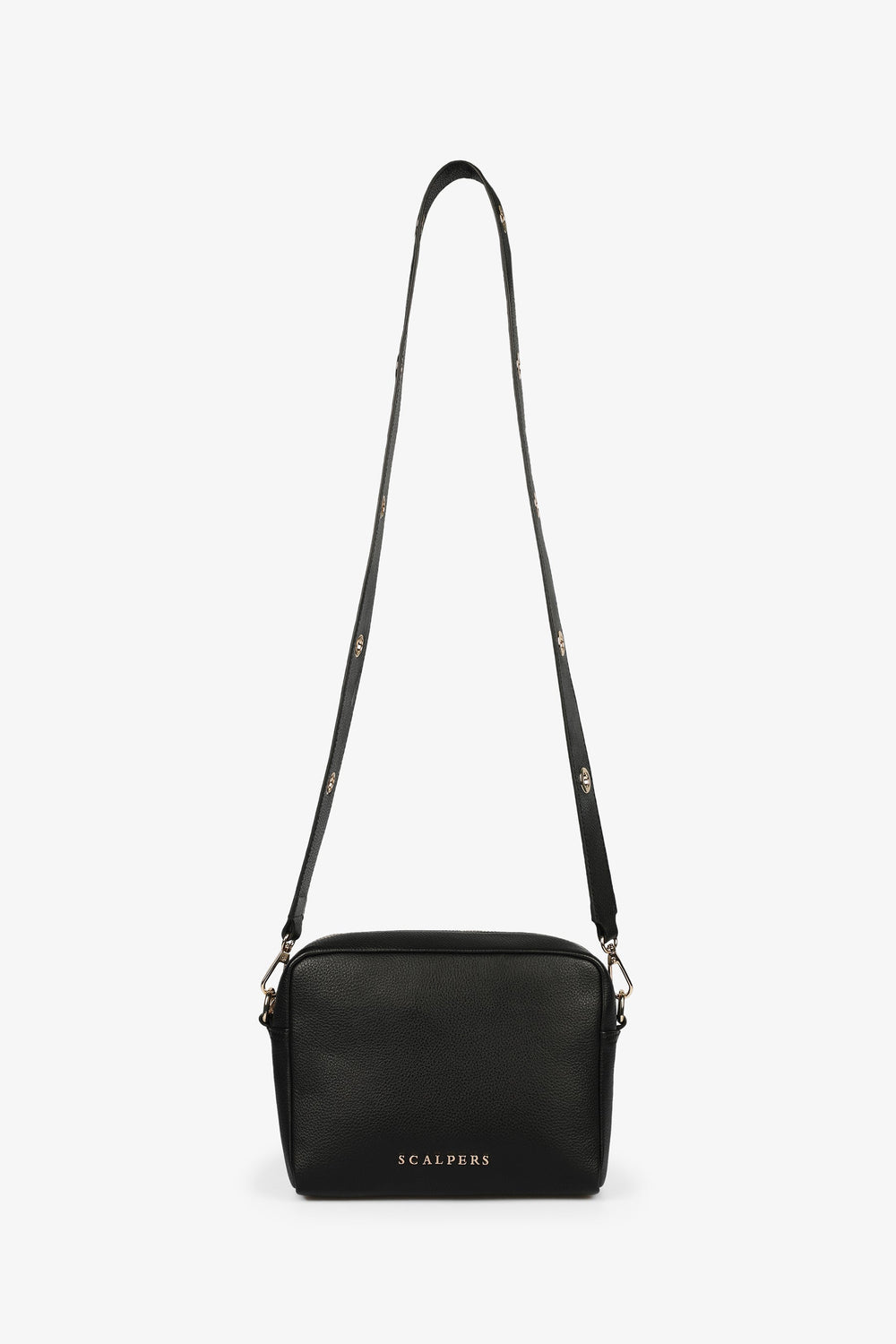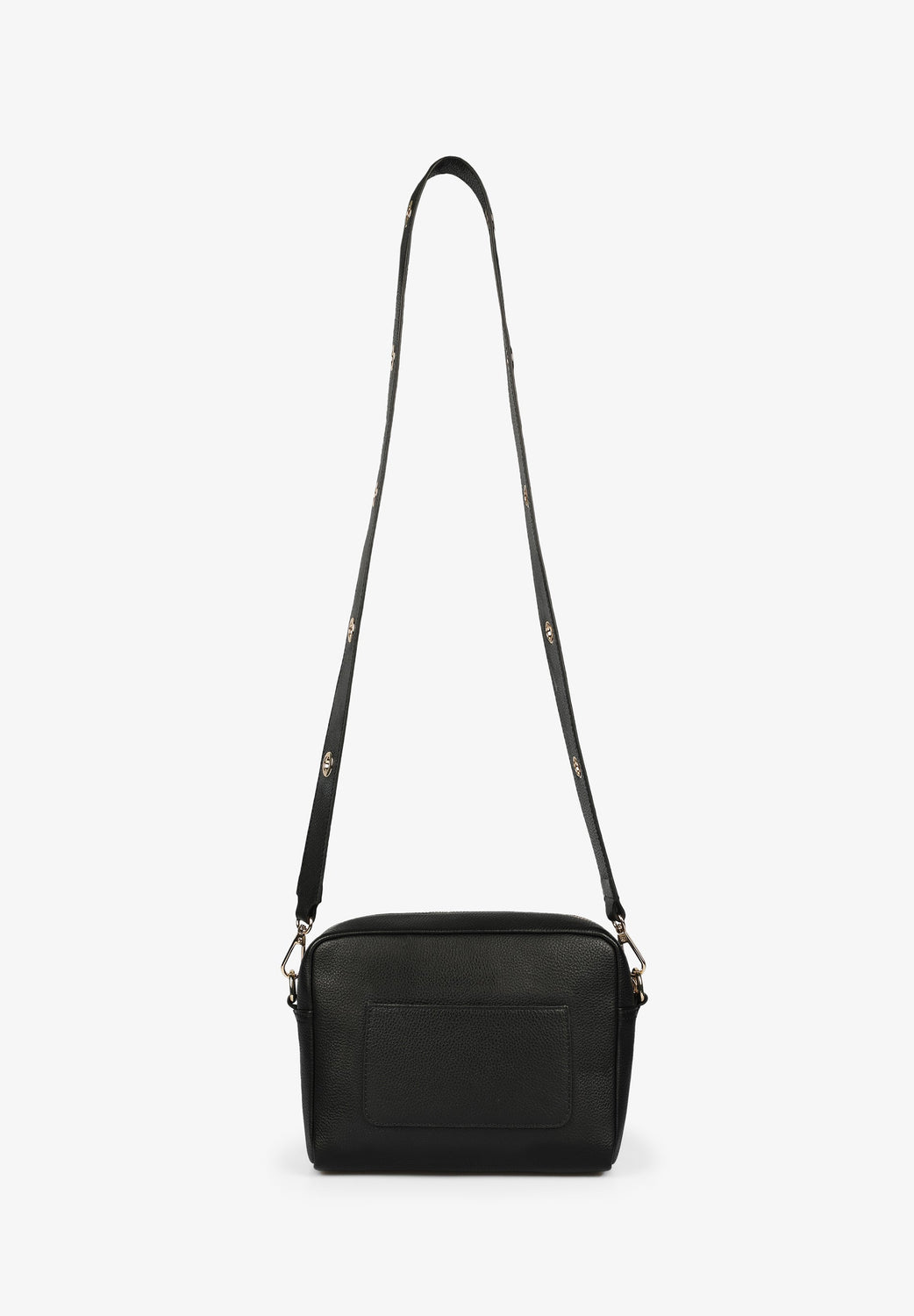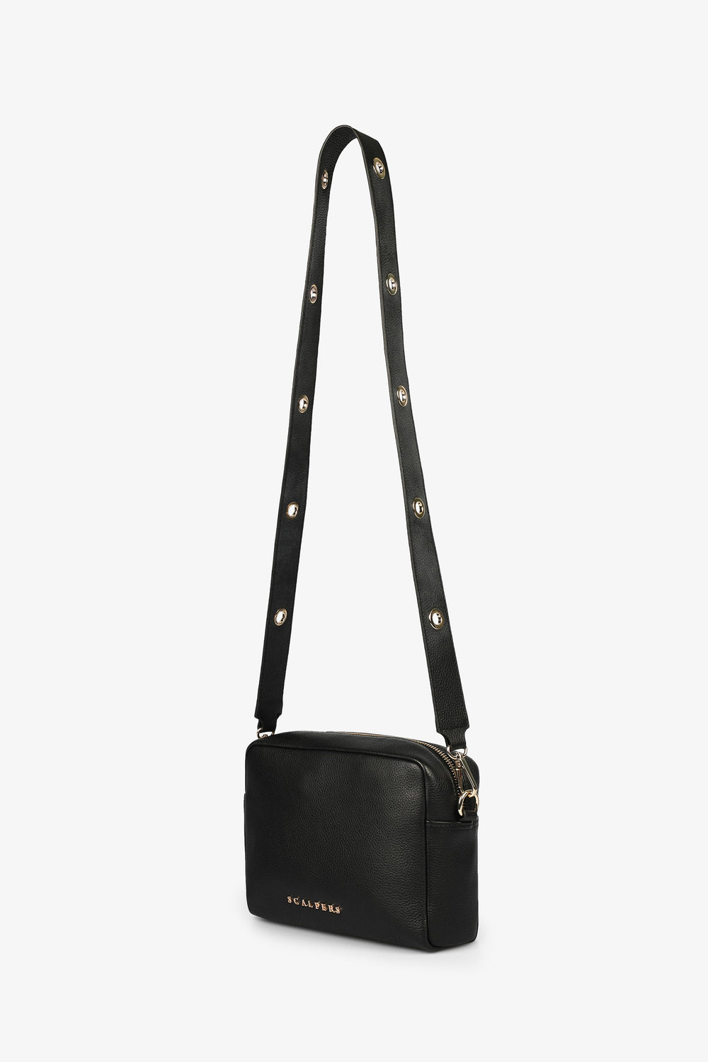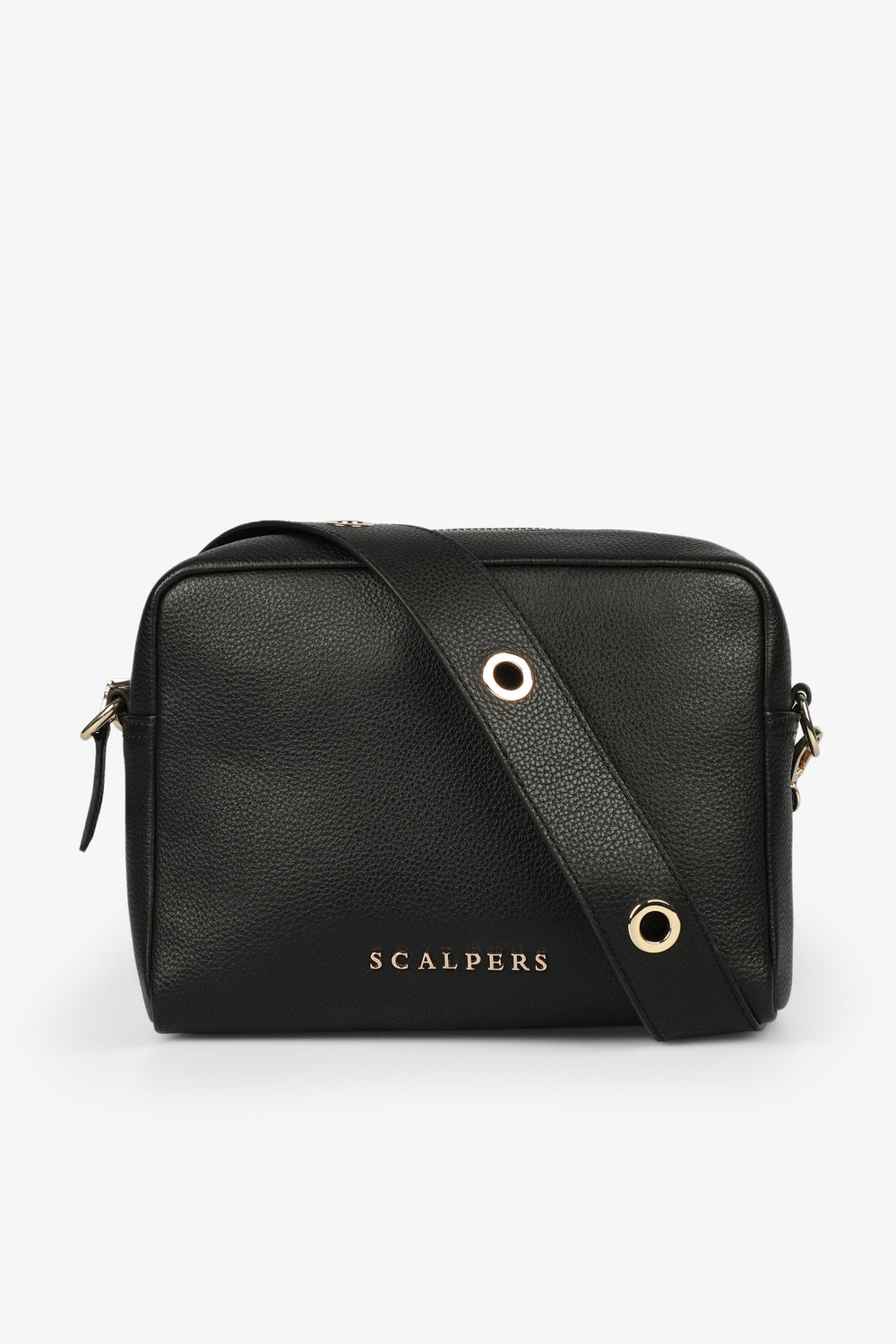 Bolso cuadrado con detalle de ollados metálicos en bandolera.
