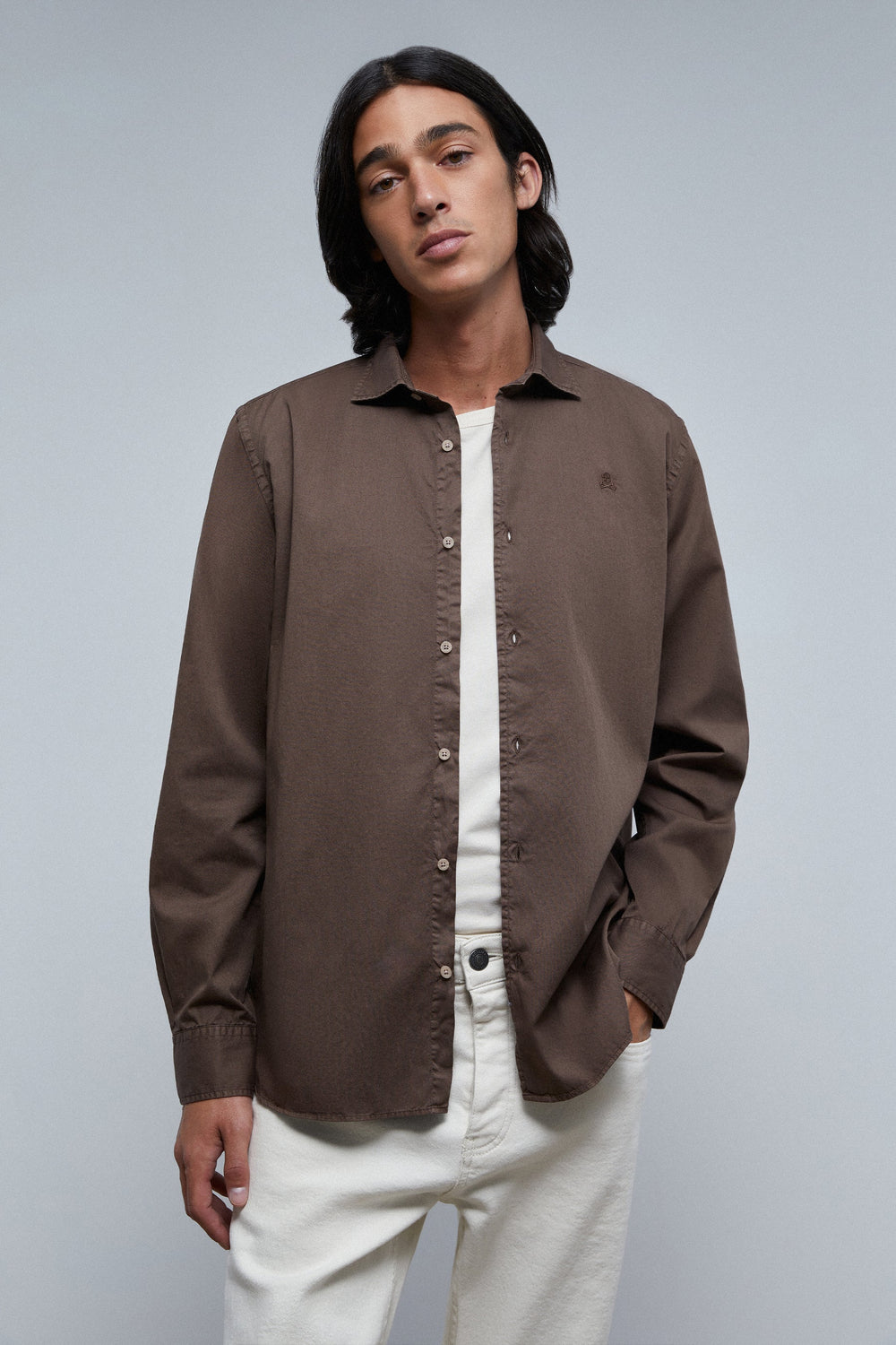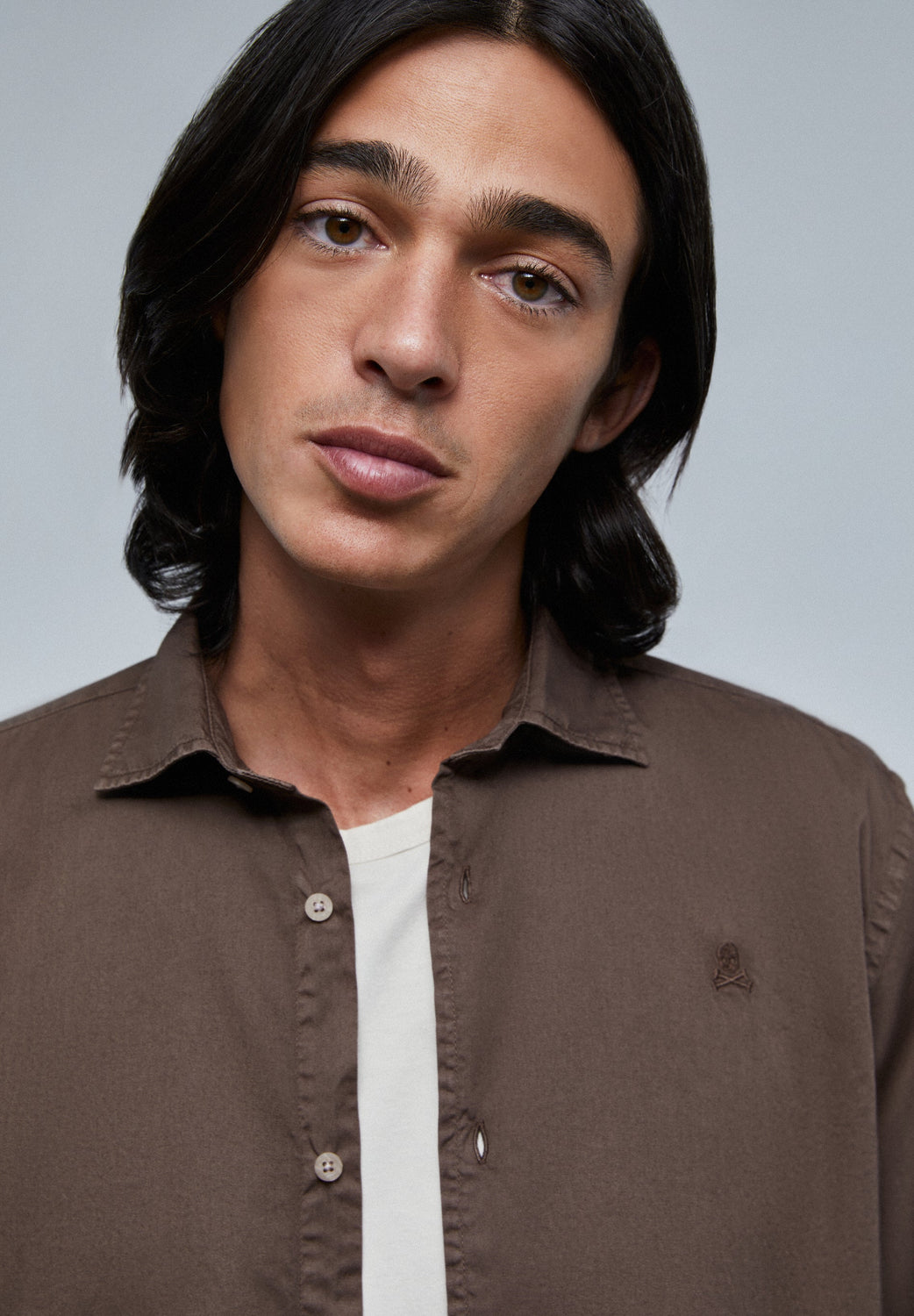 Camisa lavada con calavera bordada a tono.