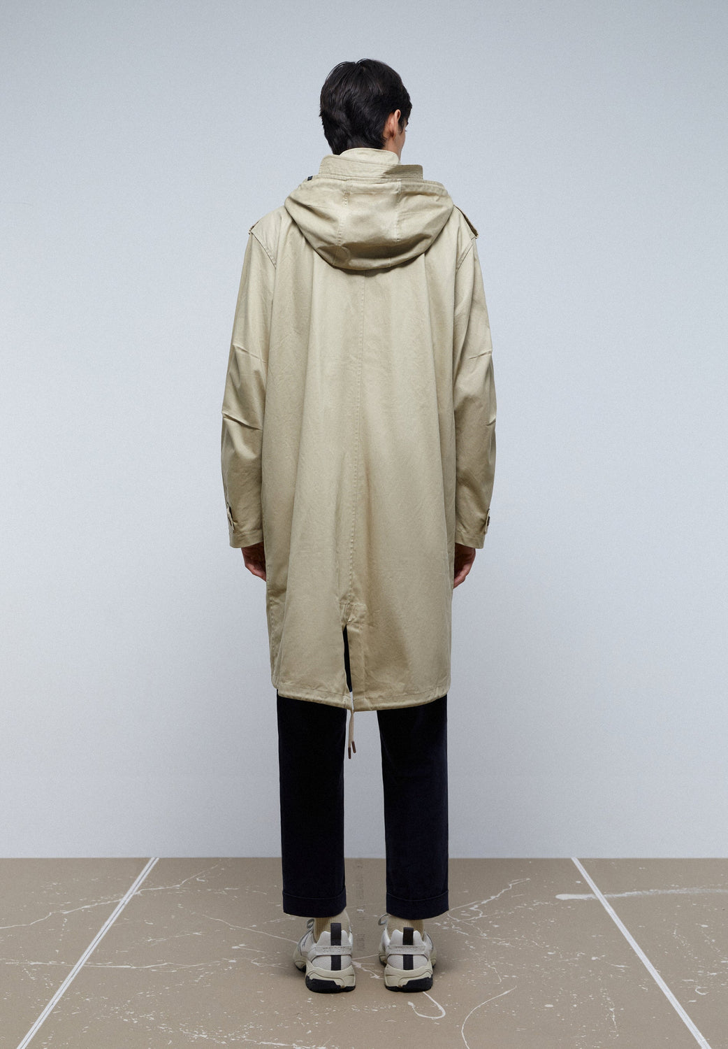 Trench con capucha con visera.