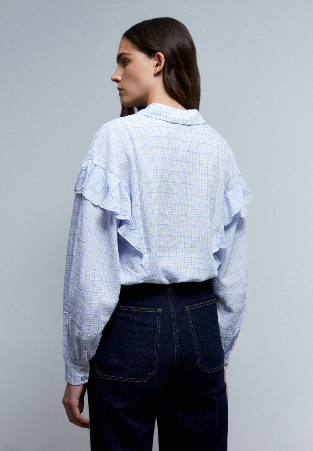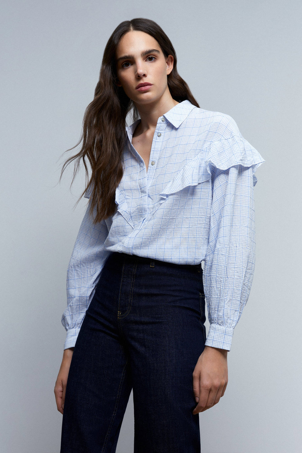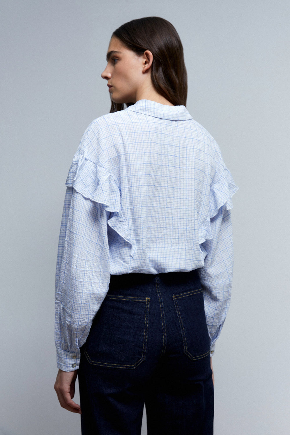 Camisa canesú con volante y estampado de cuadros