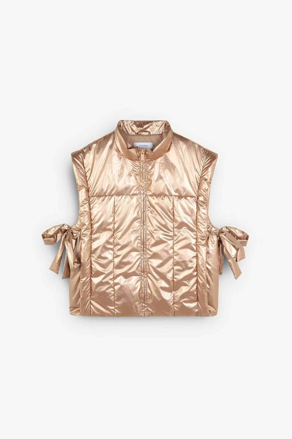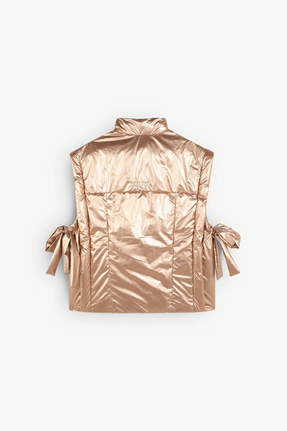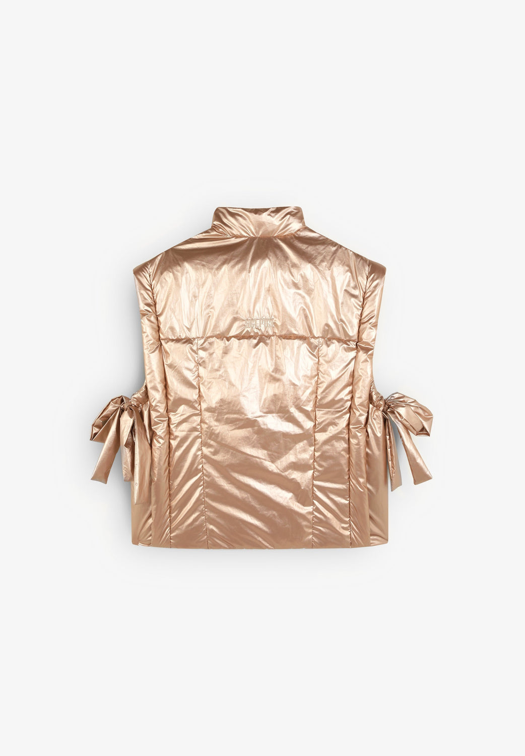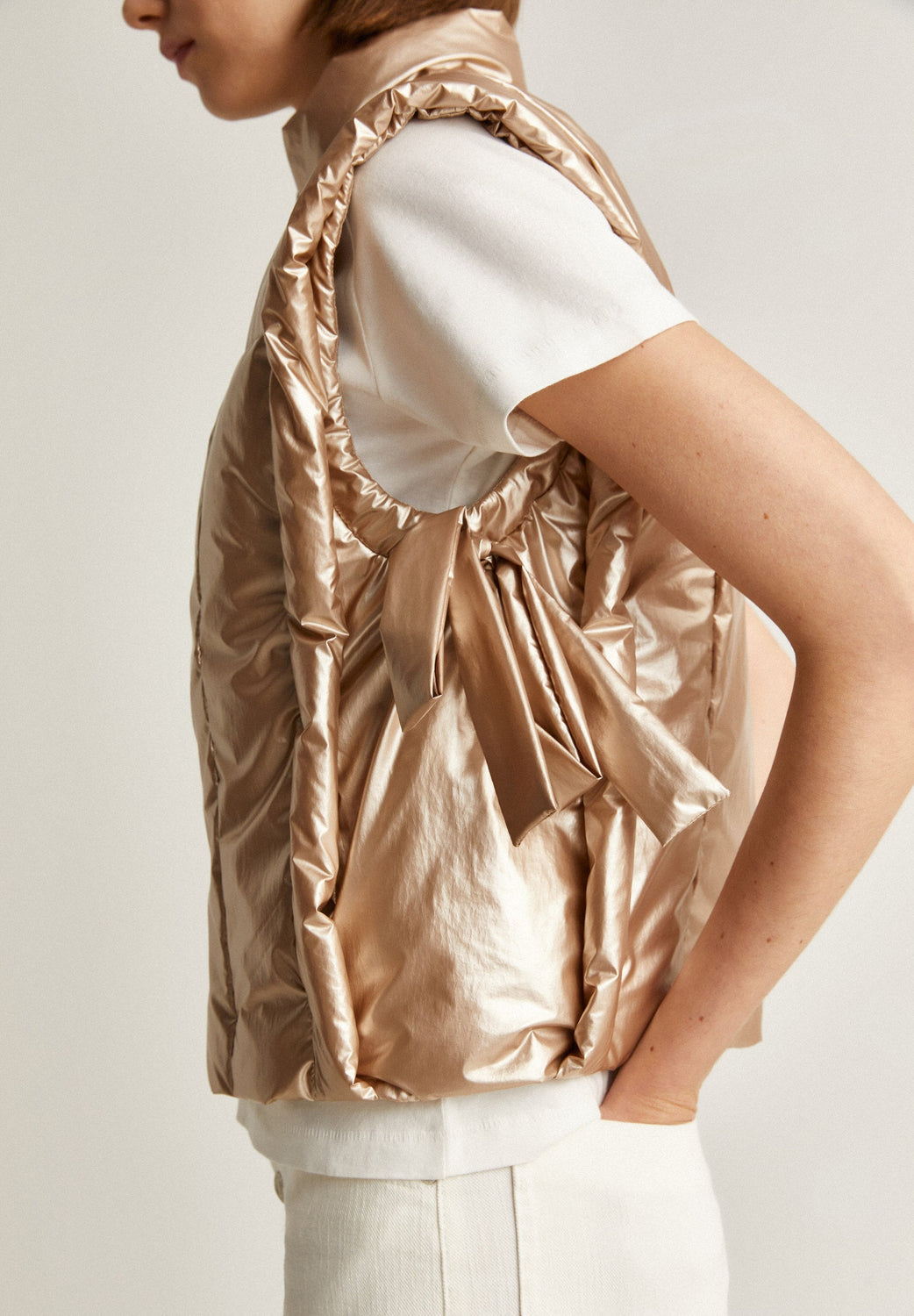 Chaleco acolchado metalizado con detalle de lazos laterales.