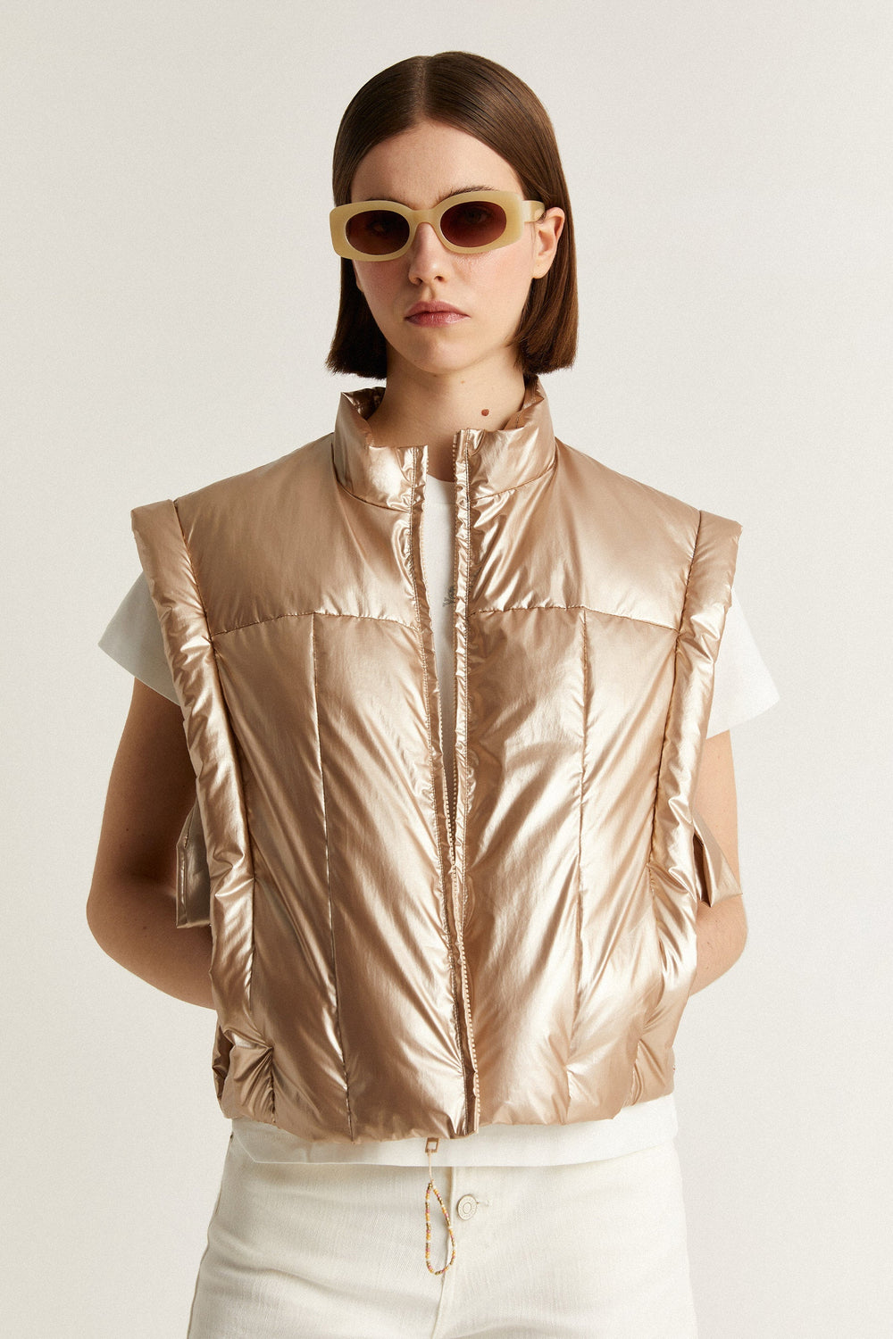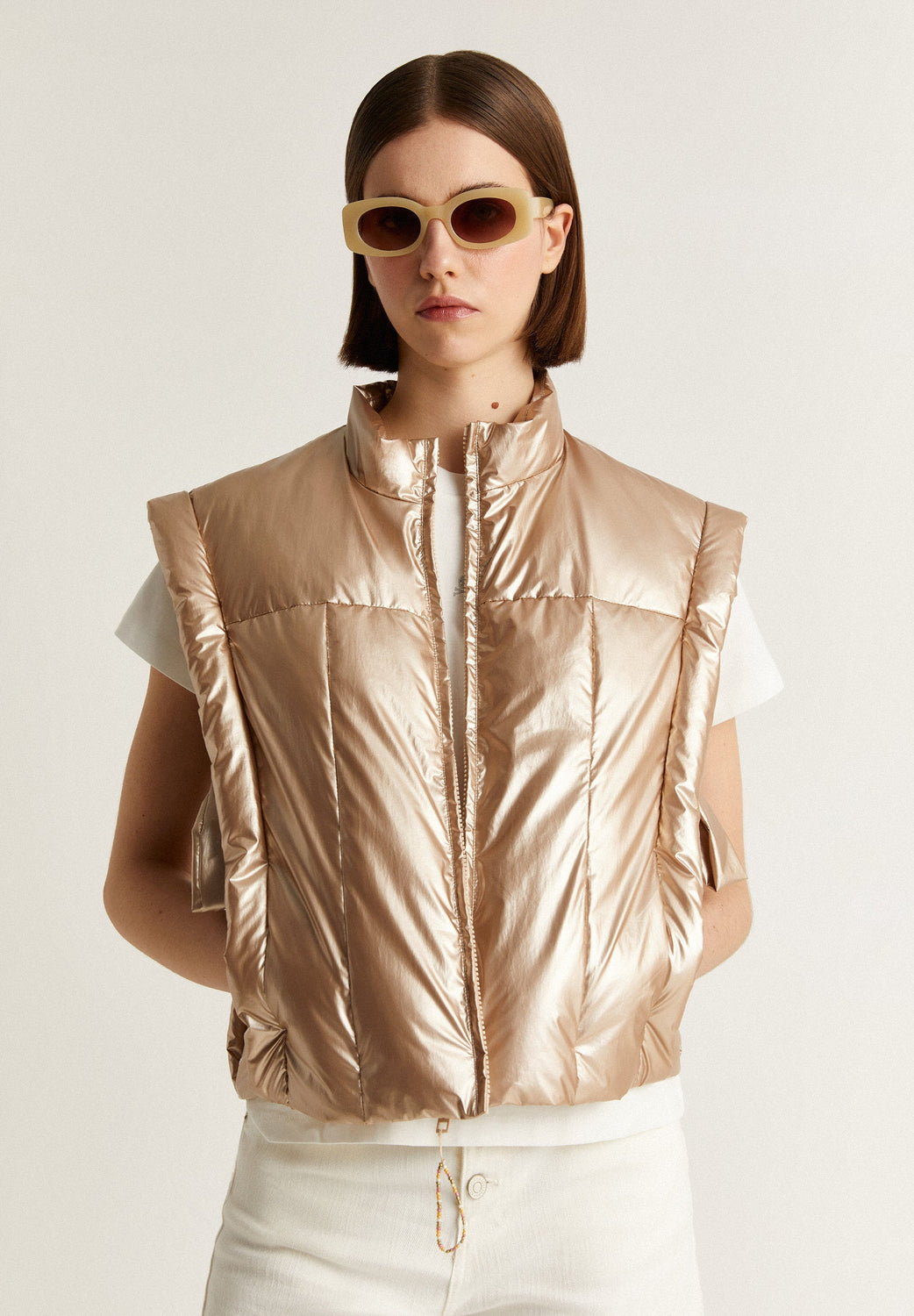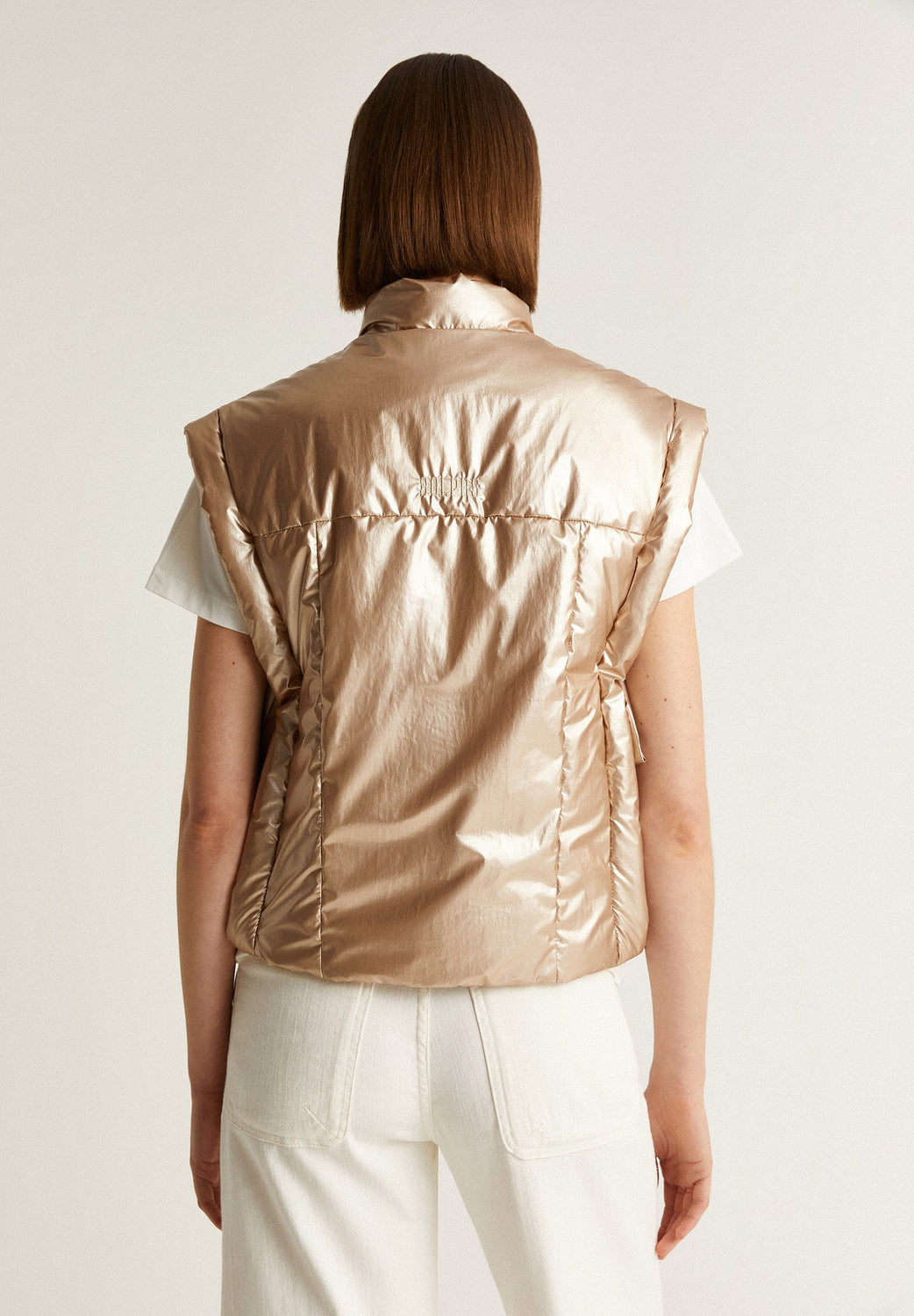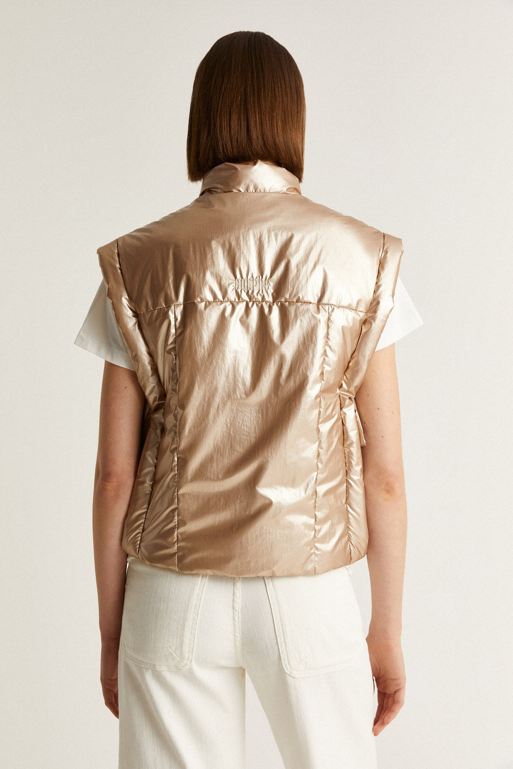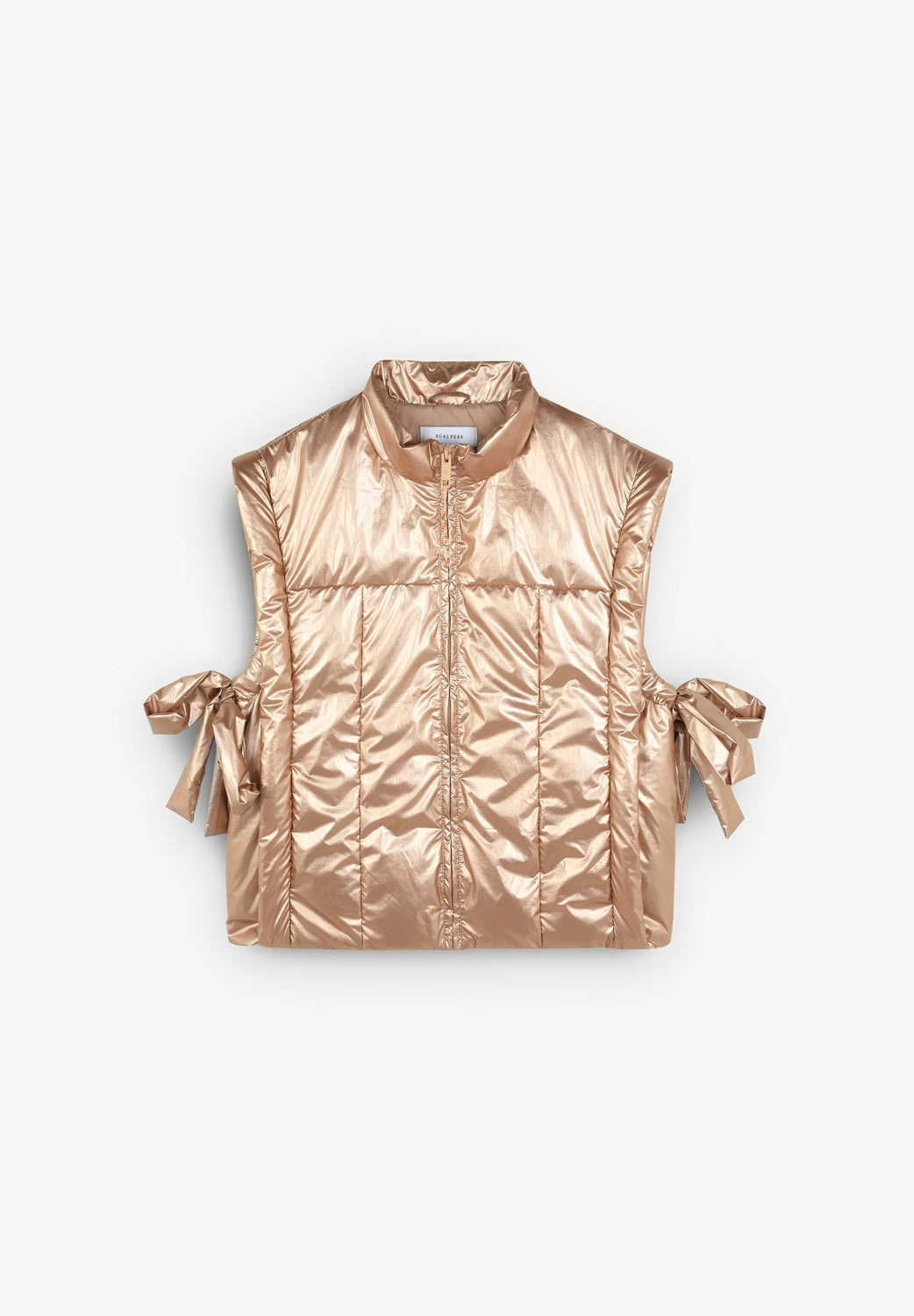 Chaleco acolchado metalizado con detalle de lazos laterales.