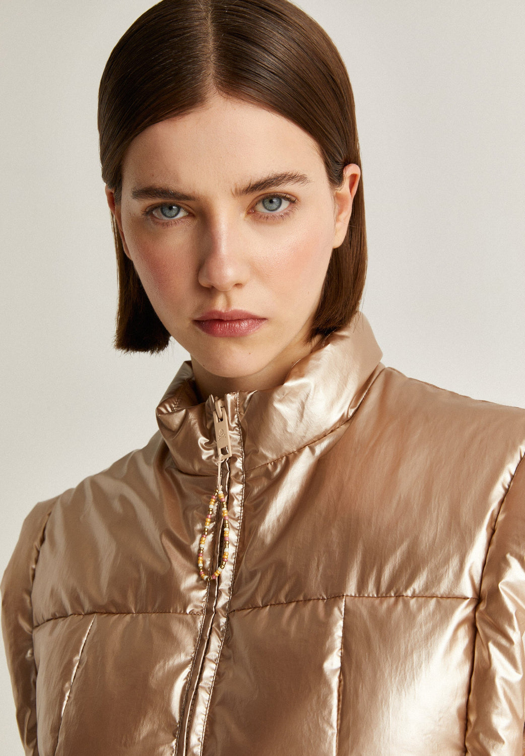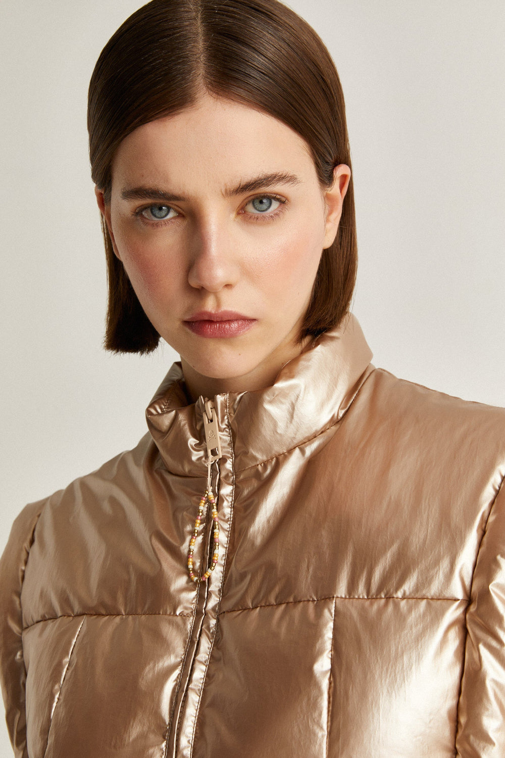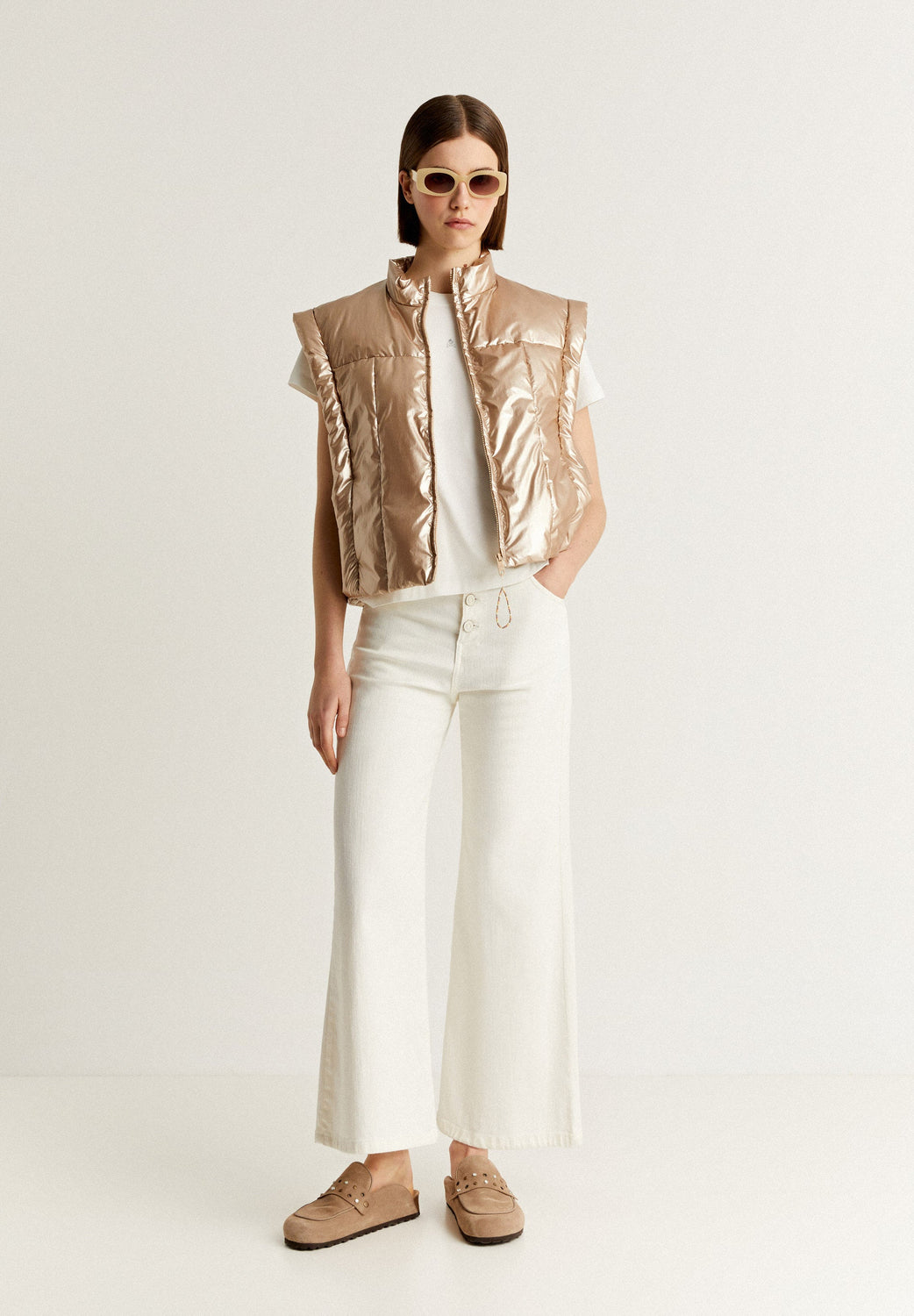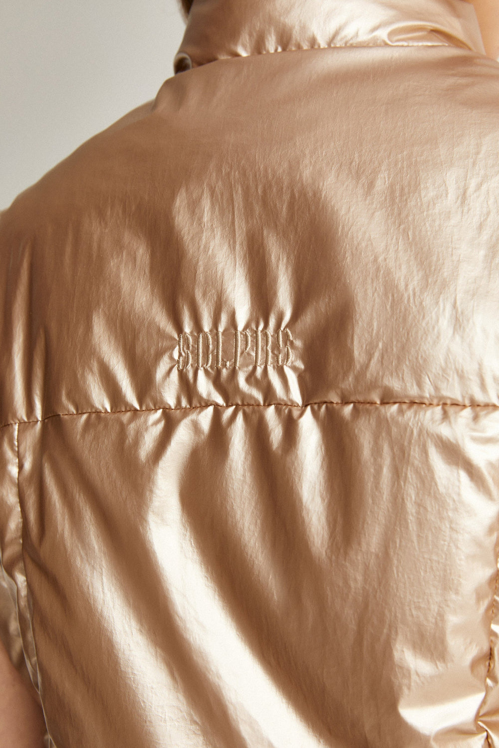 Chaleco acolchado metalizado con detalle de lazos laterales.