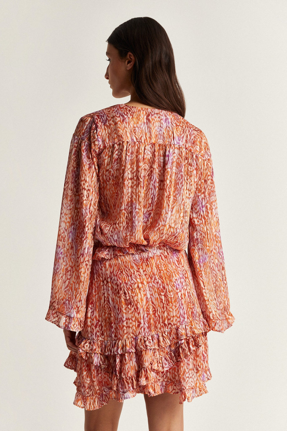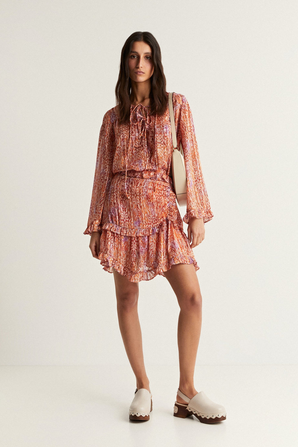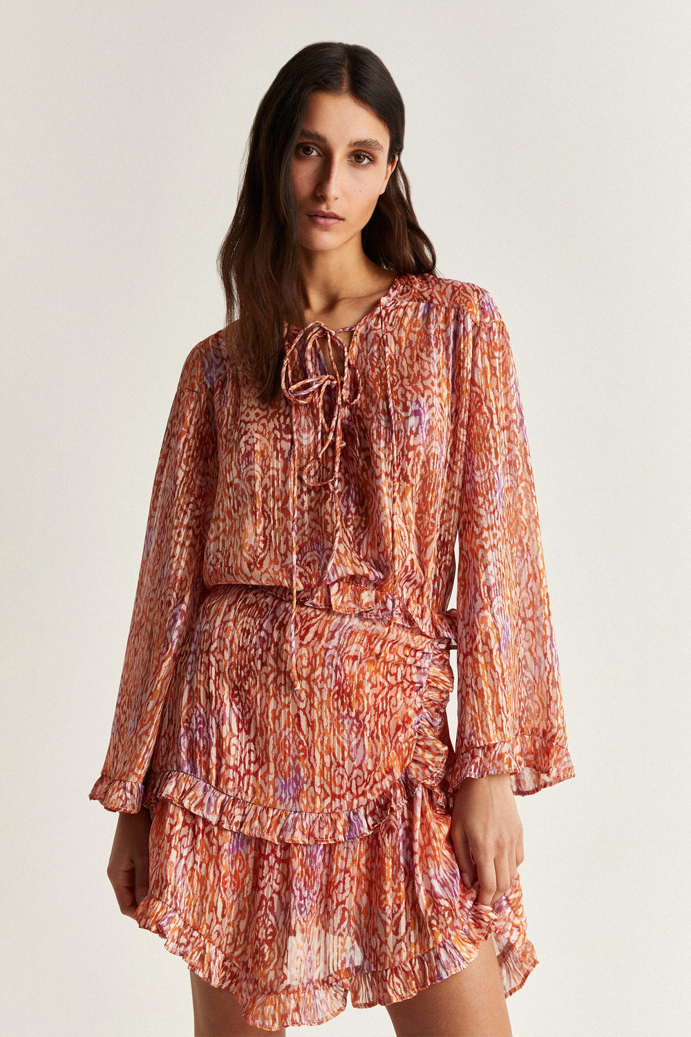 - Confeccionada en tejido fluido con detalle de hilatura metálica