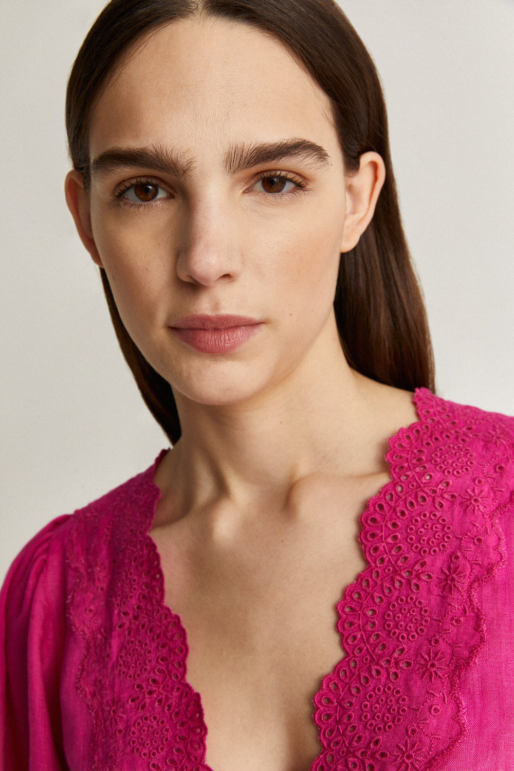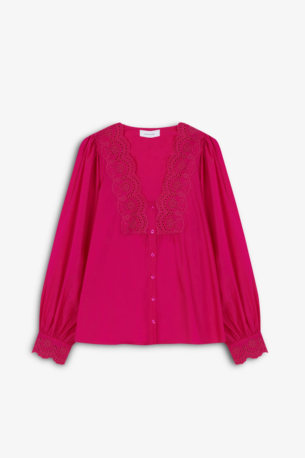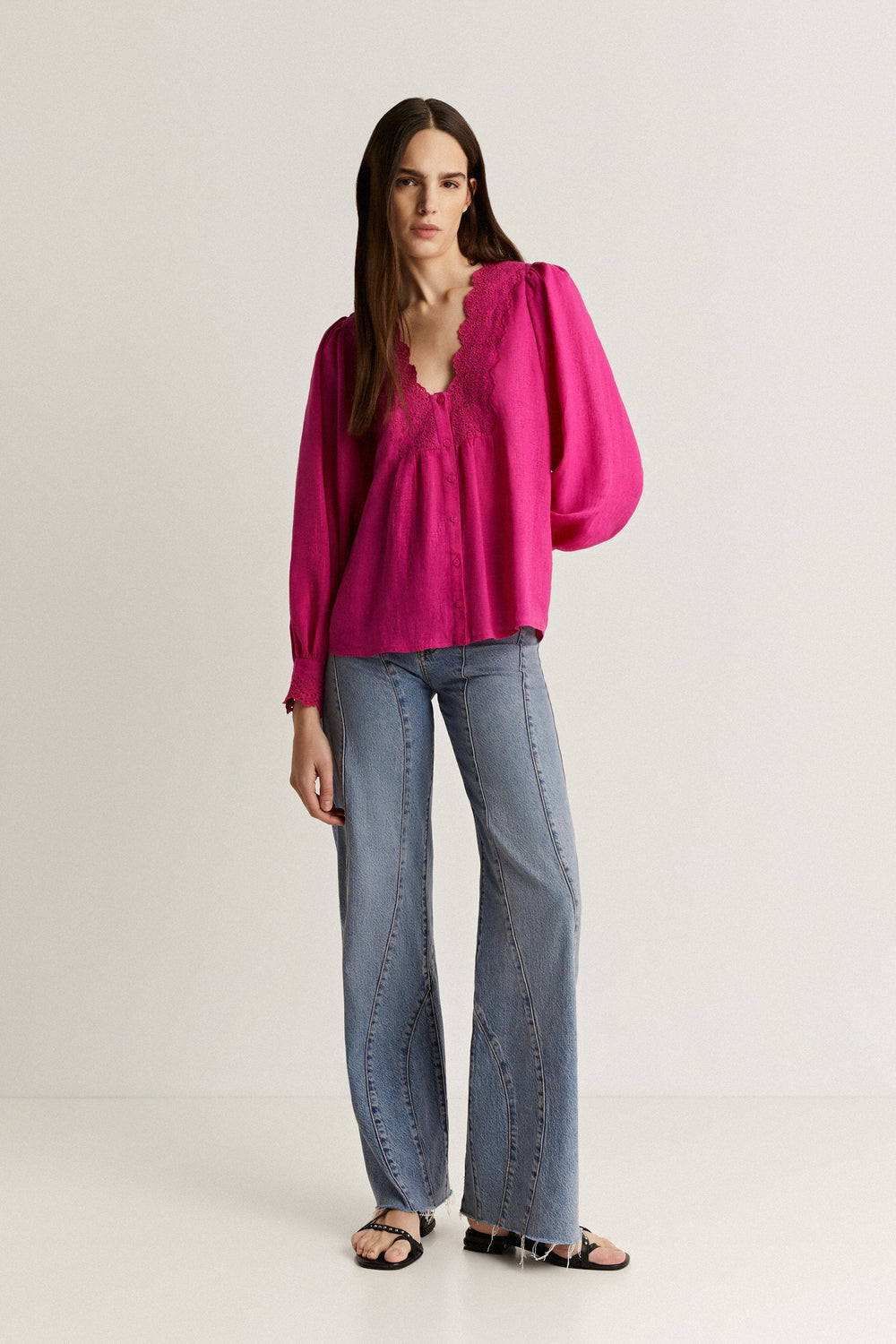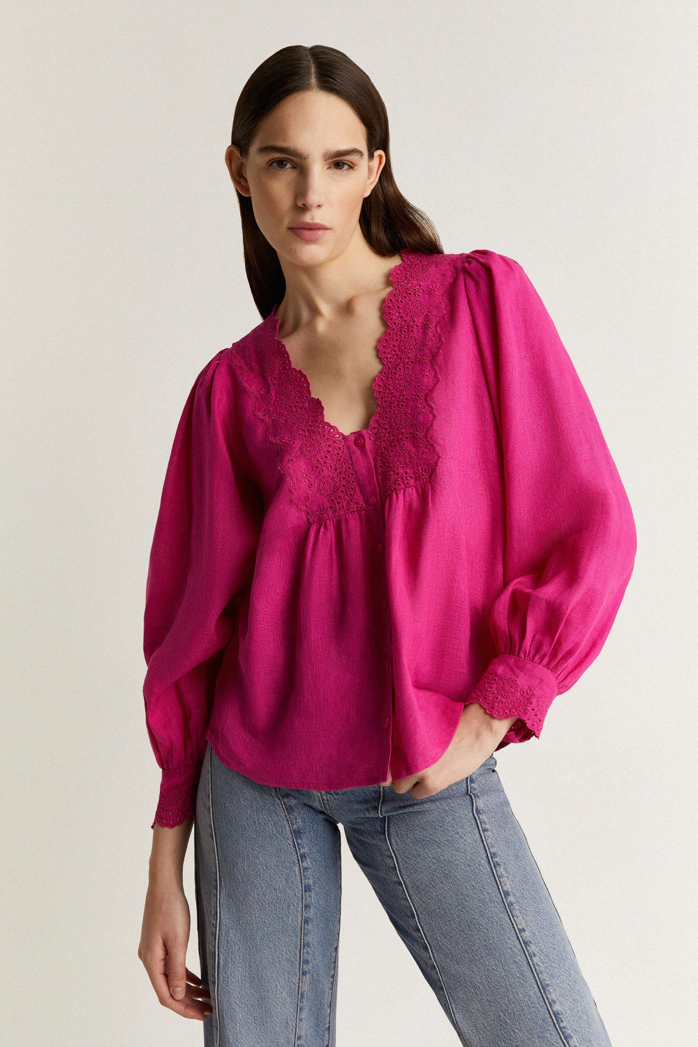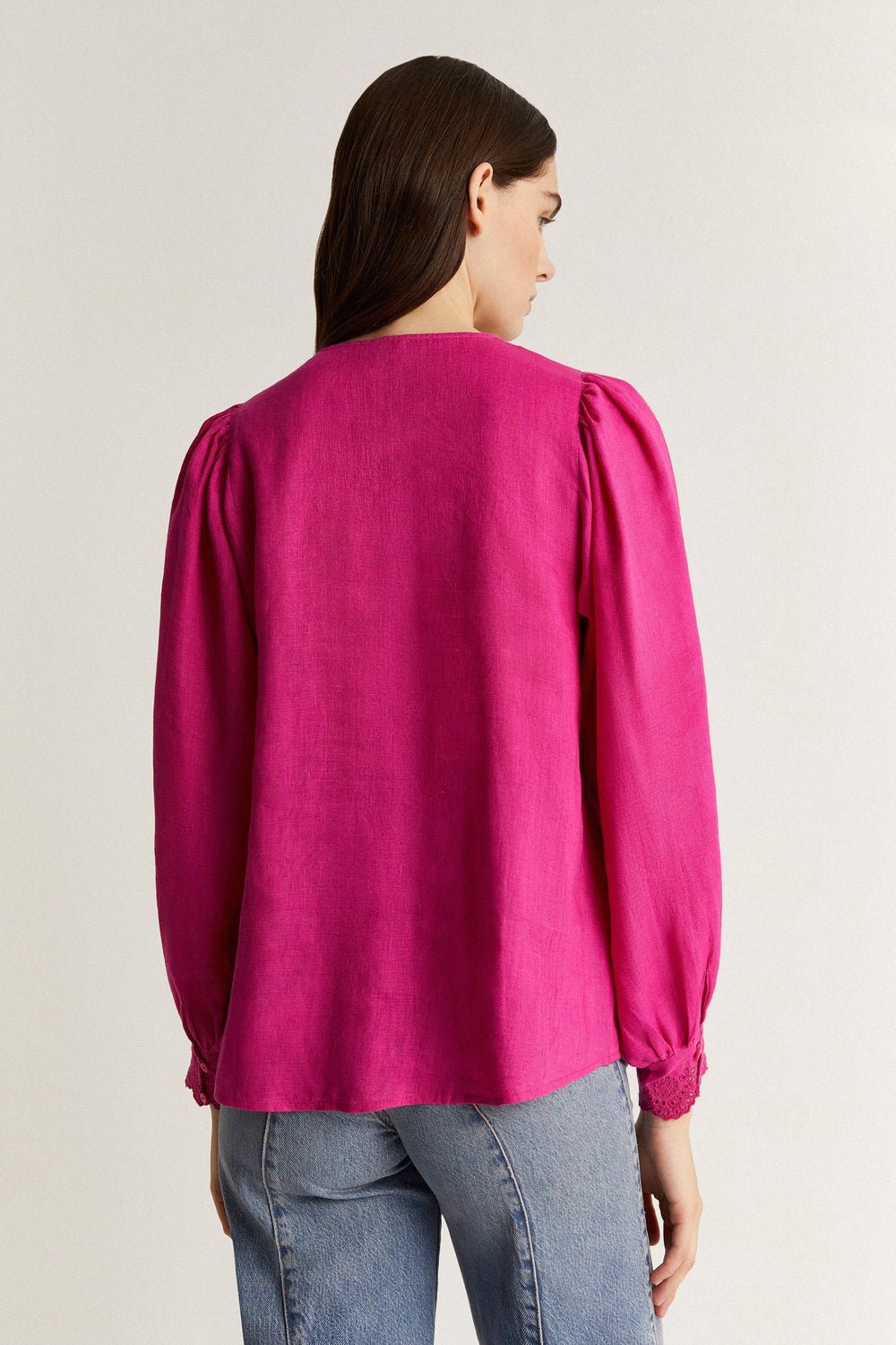 - Manga larga con detalles bordados en puño y botones