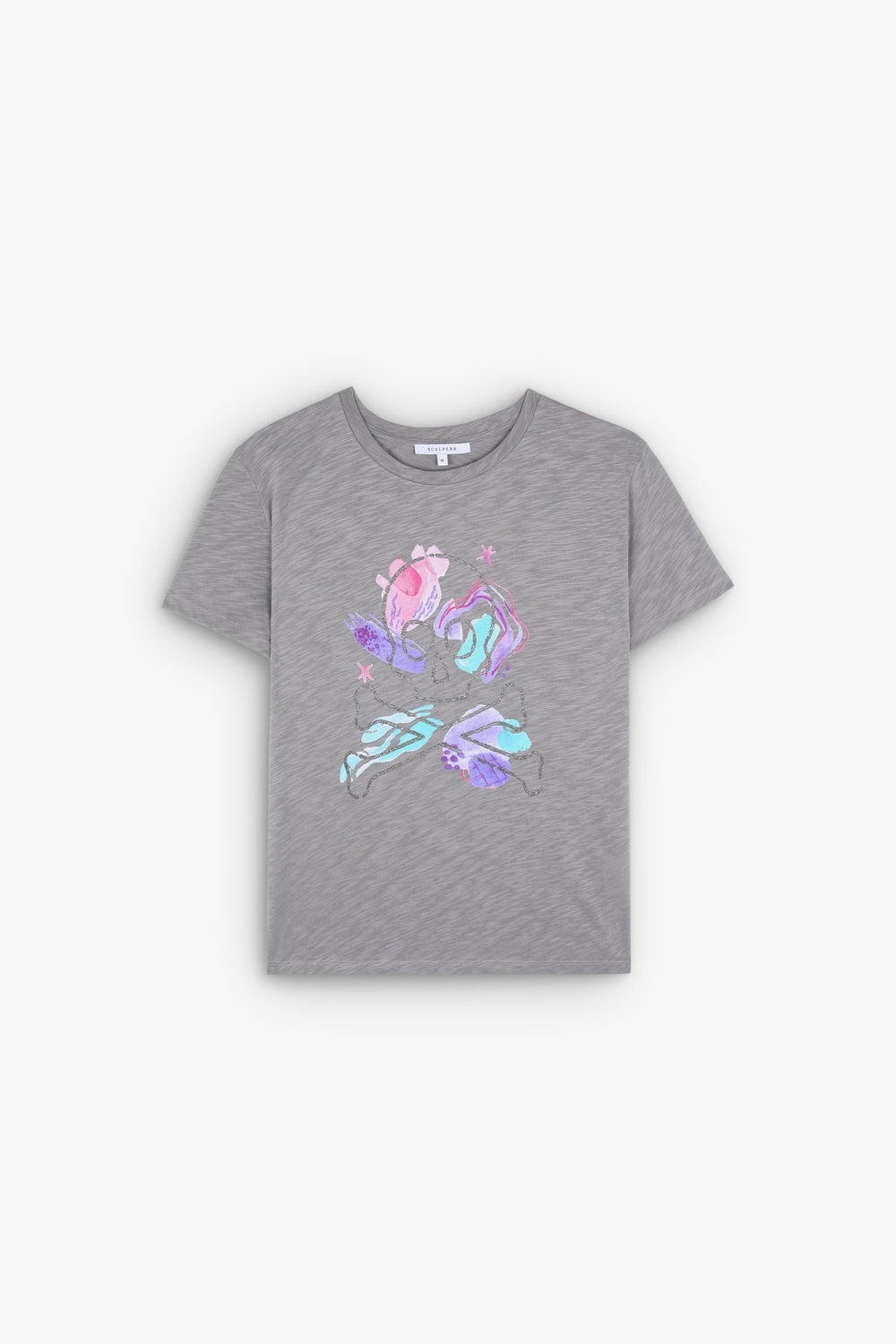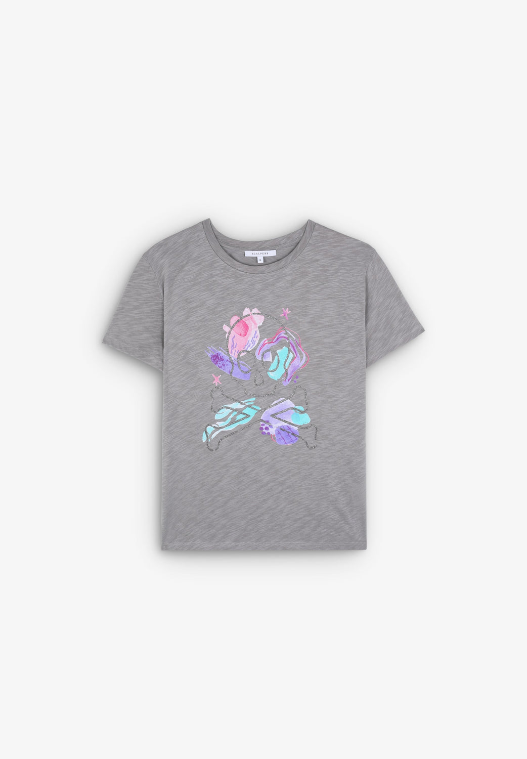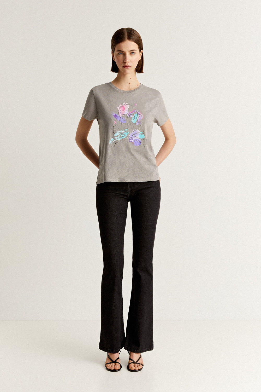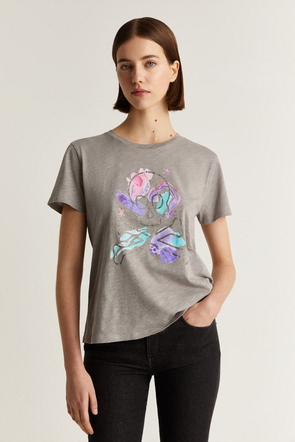 Camiseta con print frontal y detalle contorno calavera en glitter.