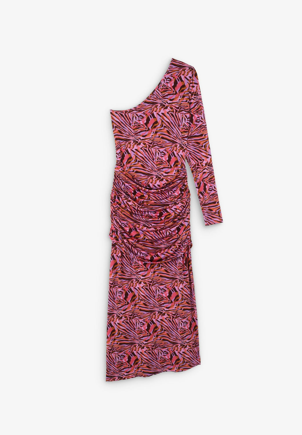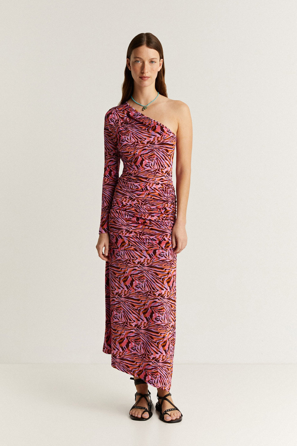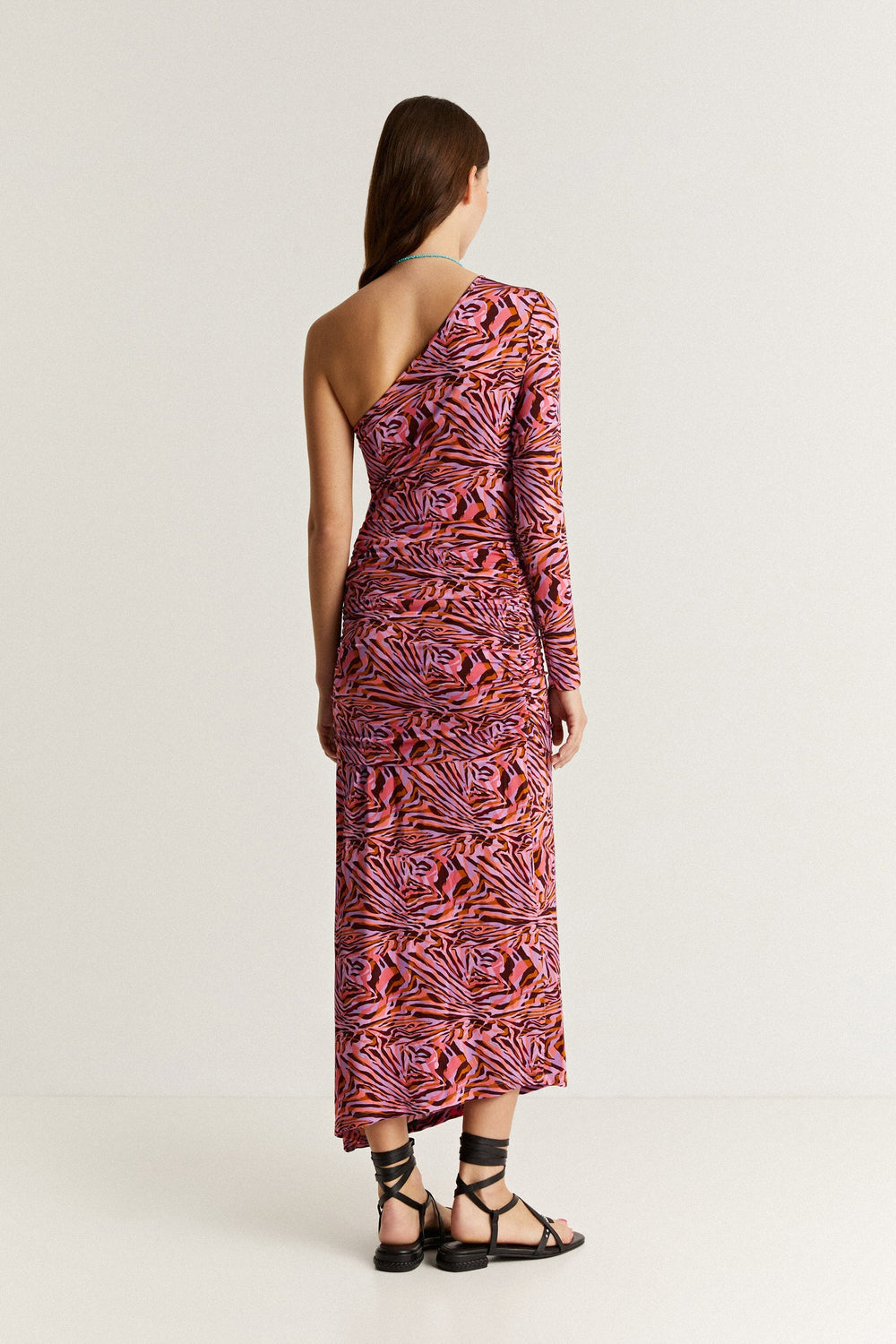 Vestido midi asimétrico con detalle de frunces.