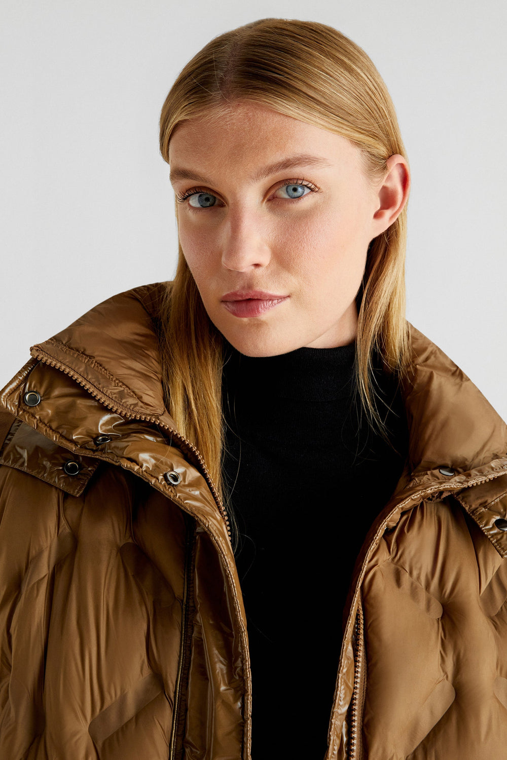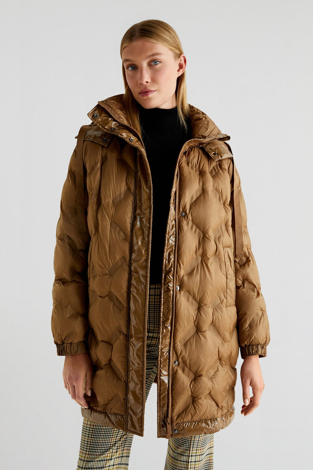 Abrigo acolchado confeccionado en tejido reciclado. Regular fit, cuello subido y con capucha ajustable y cierre con botones y snaps. Manga larga terminada en elástico, bolsillos laterales y aberturas laterales.