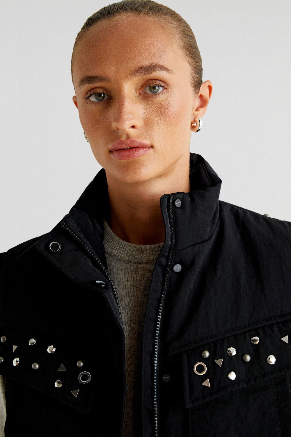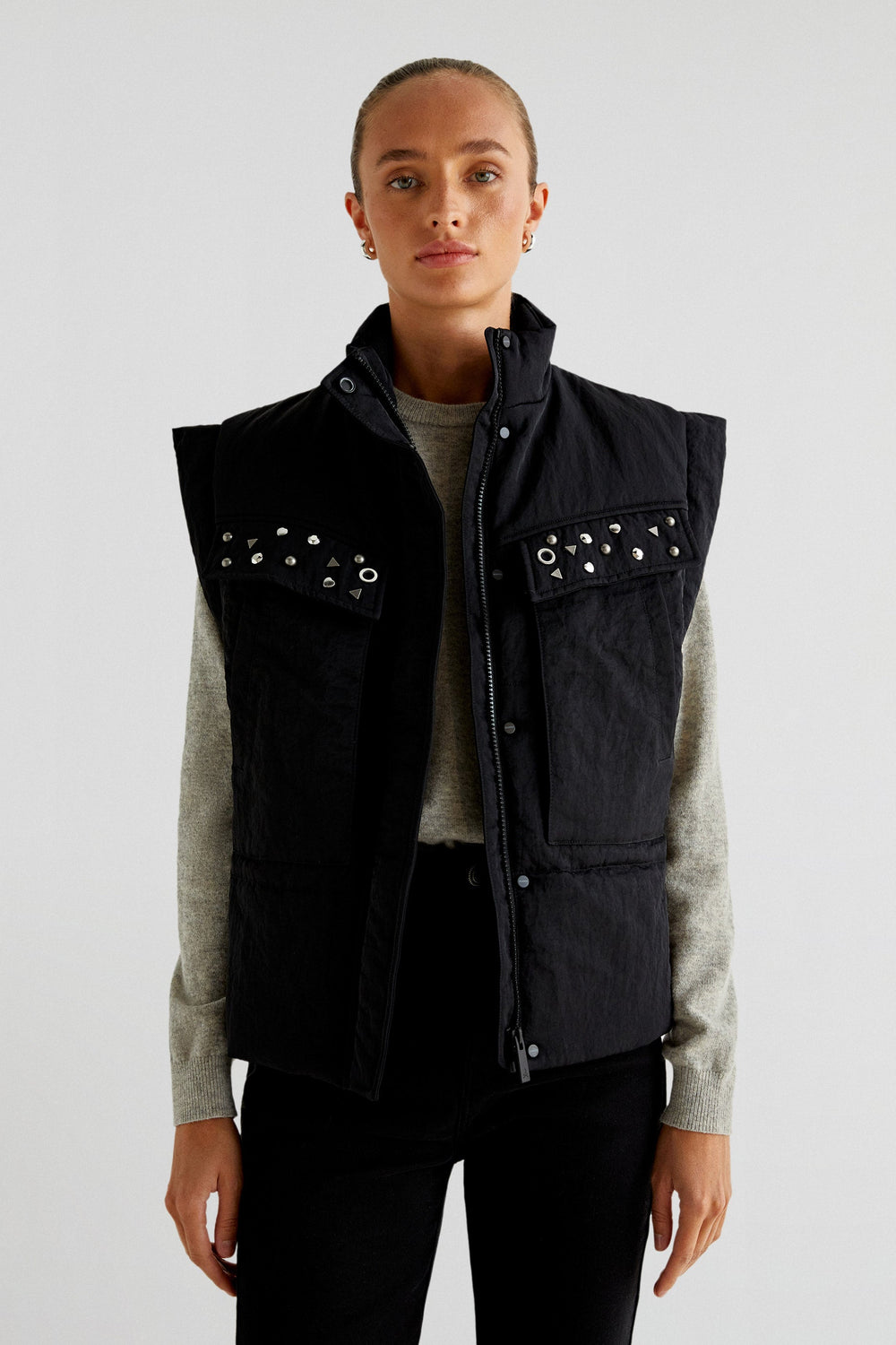 Chaleco confeccionado en tejido reciclado. Ligeramente oversize, cuello subido y cierre con cremallera y snaps. Manga en sisa con detalle y bolsillos grandes con tapeta. Detalle de tachas en bolsillos y en espalda.