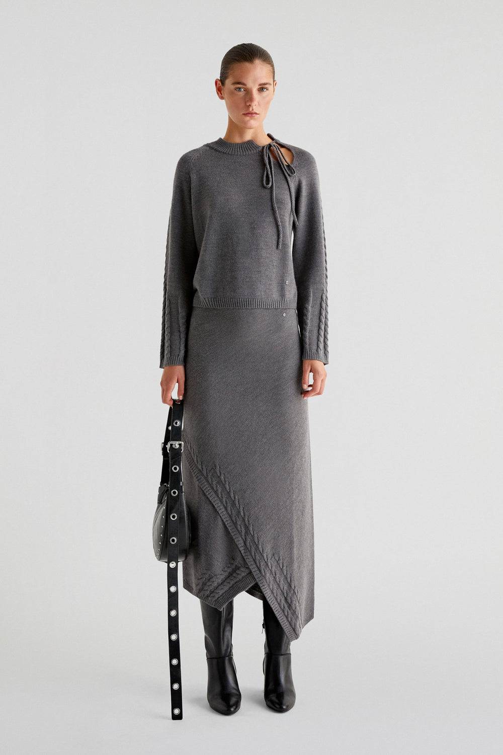 Falda de punto. Regular fit, cintura elástica y bajo cruzado. Detalle de ochos.