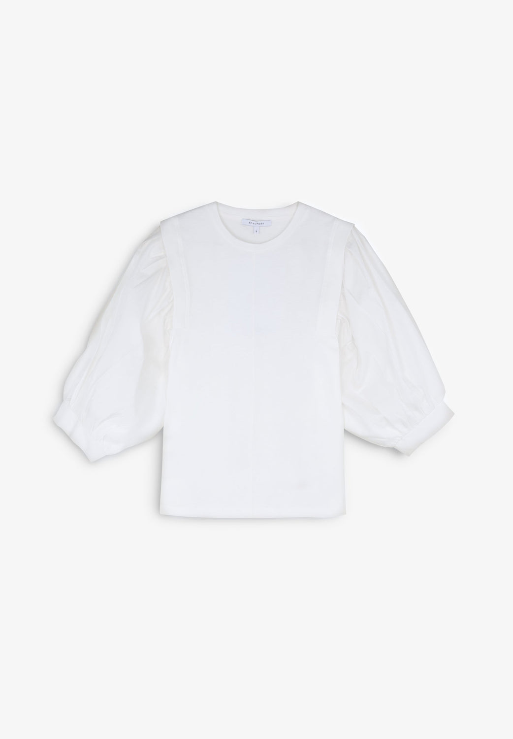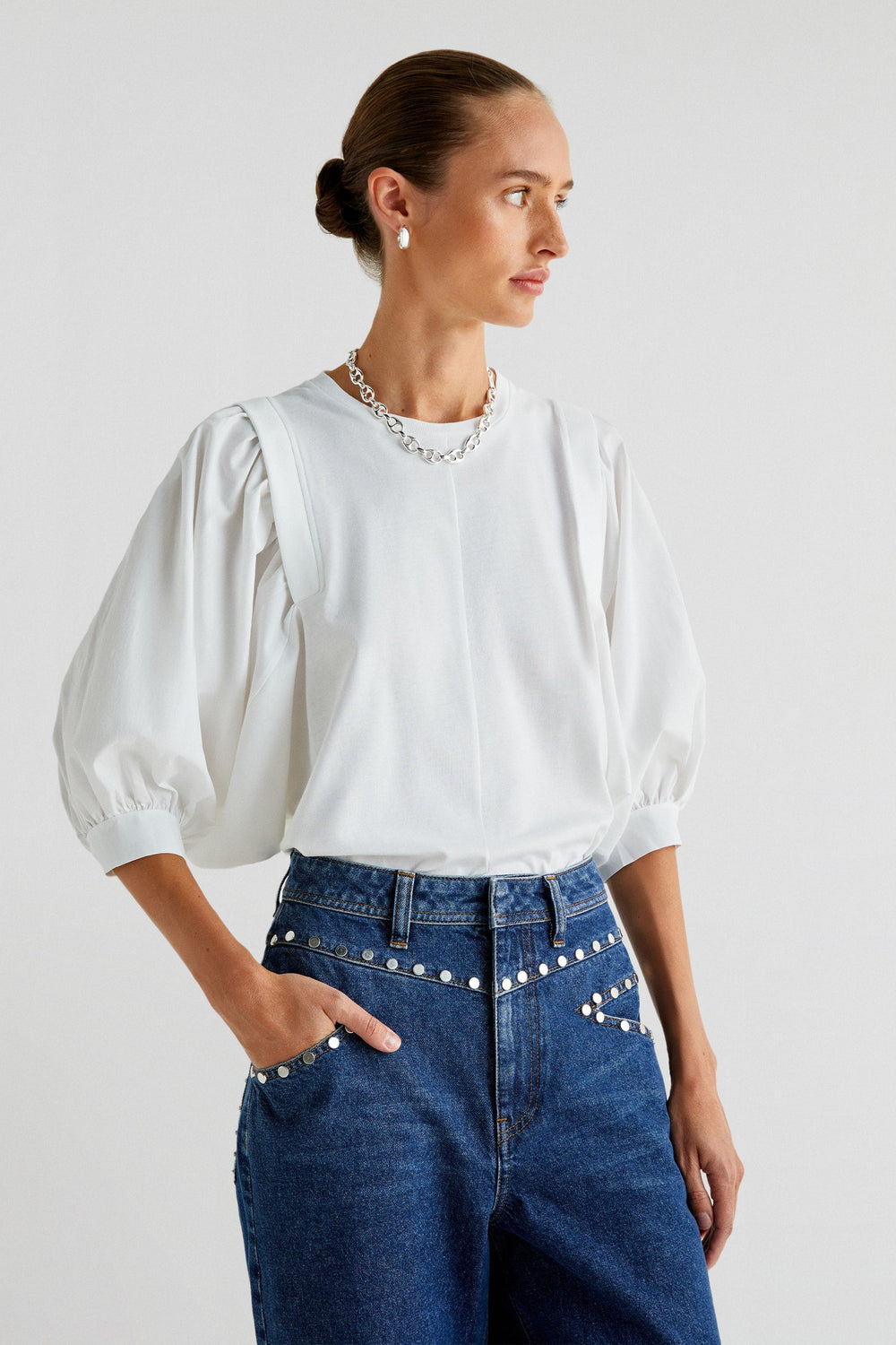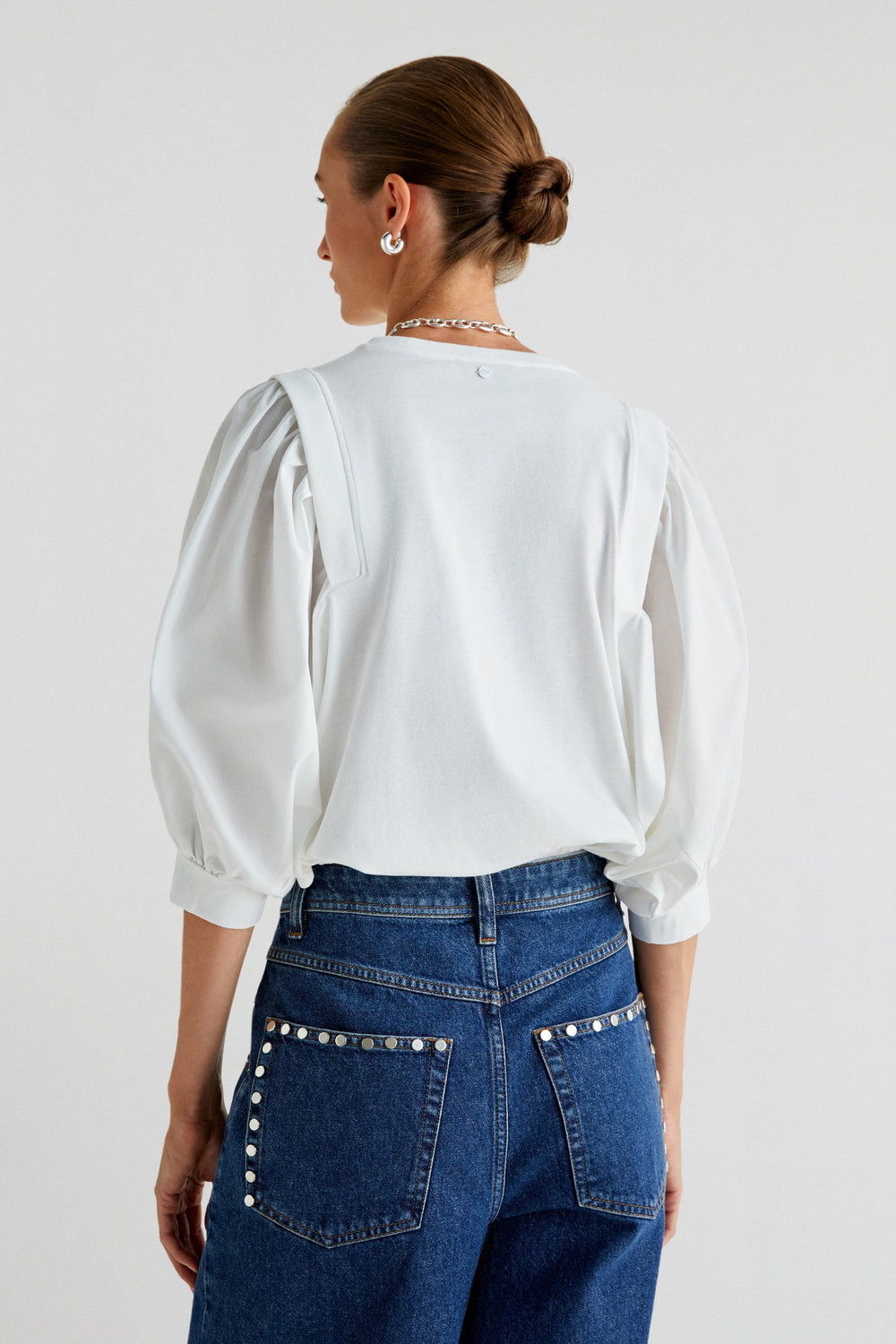 Camiseta confeccionada en 100% algodón. Regular fit, cuello redondo y mangas de popelín abullonadas.