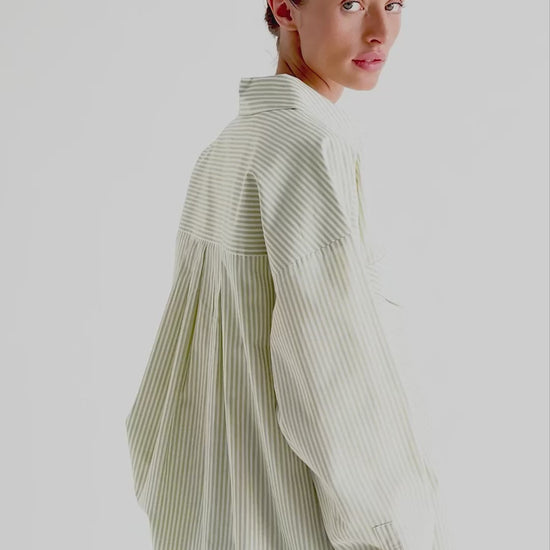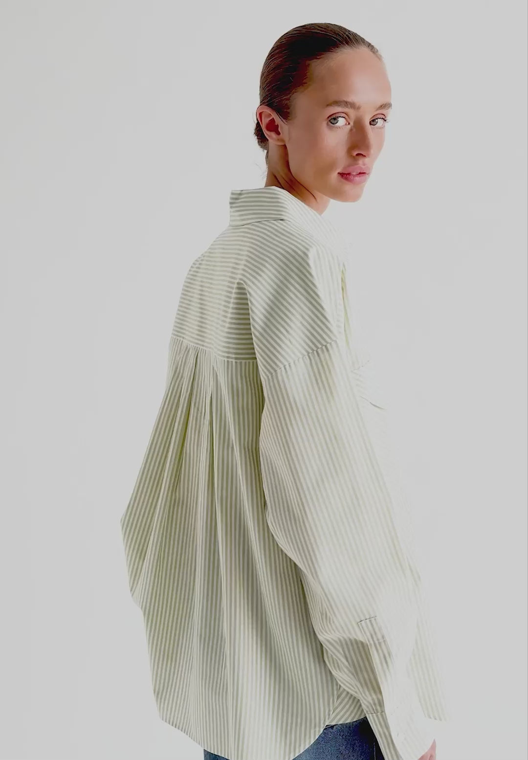 Camisa de rayas con bolsillos delanteros. Fit Oversize. Confeccionada en algodón 100%. Cuellos solapa. Cierre frontal con botones. Manga larga terminada en puño con botones. Bolsillos delanteros en pecho con tapetas.