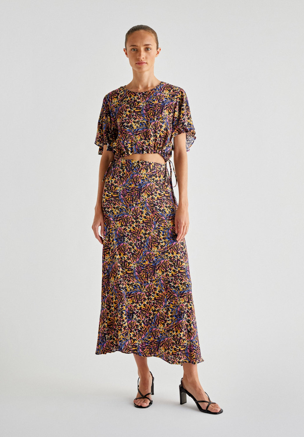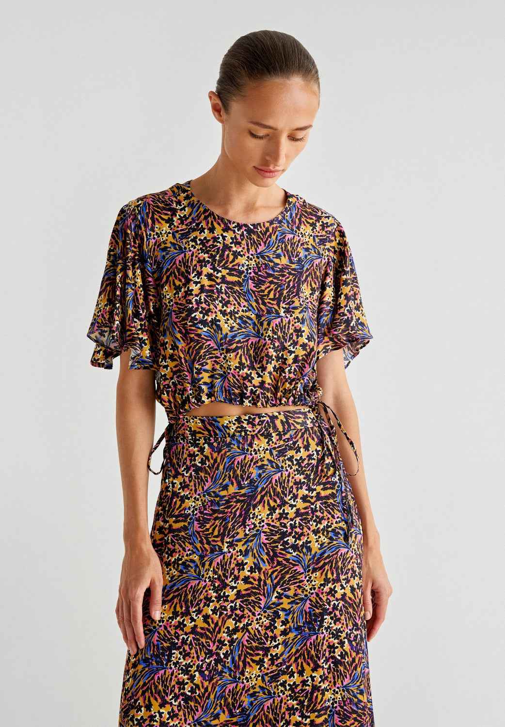 Top cropped con print. Regular Fit, cierre trasero con botón. Manga corta y cordón ajustable en bajo.