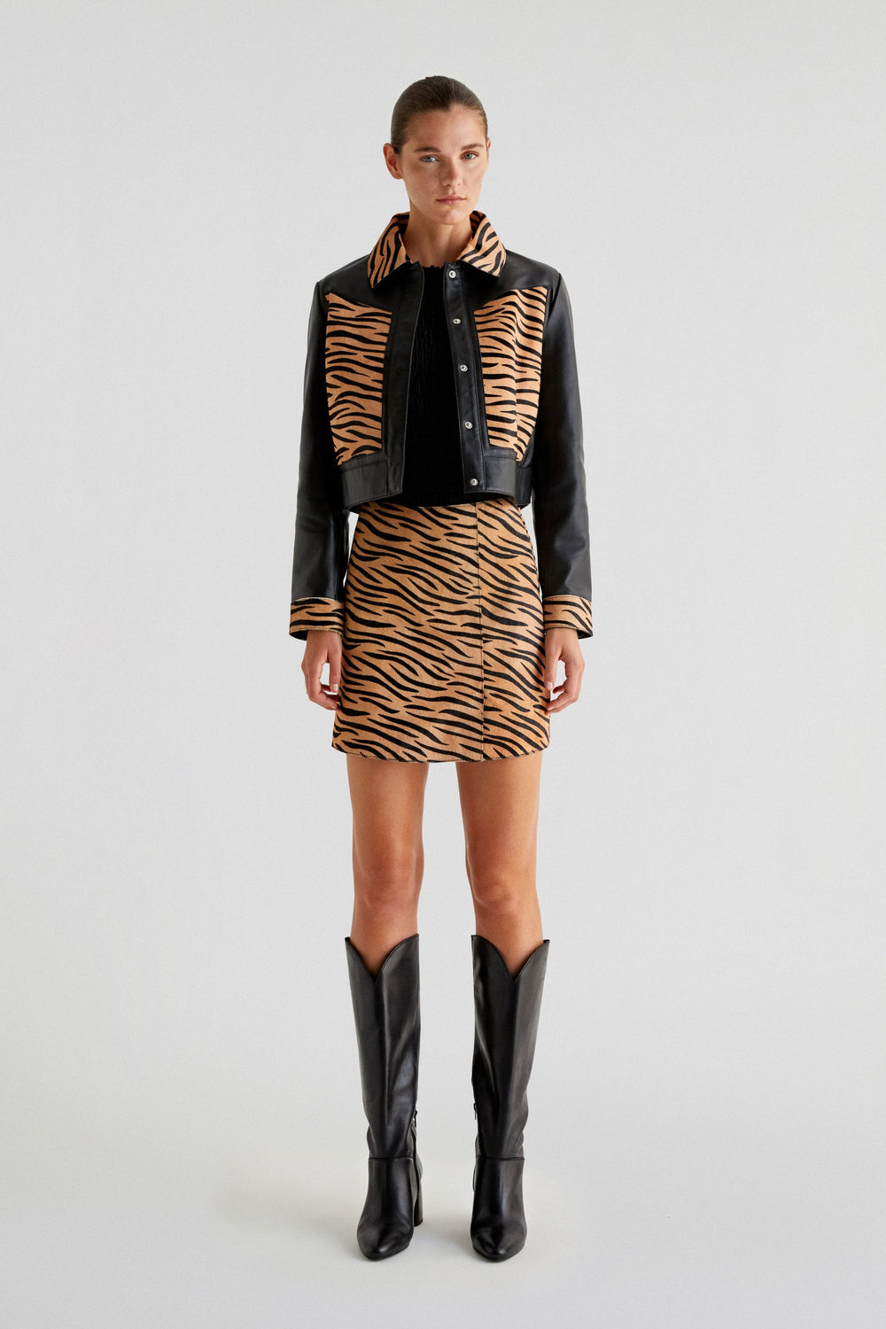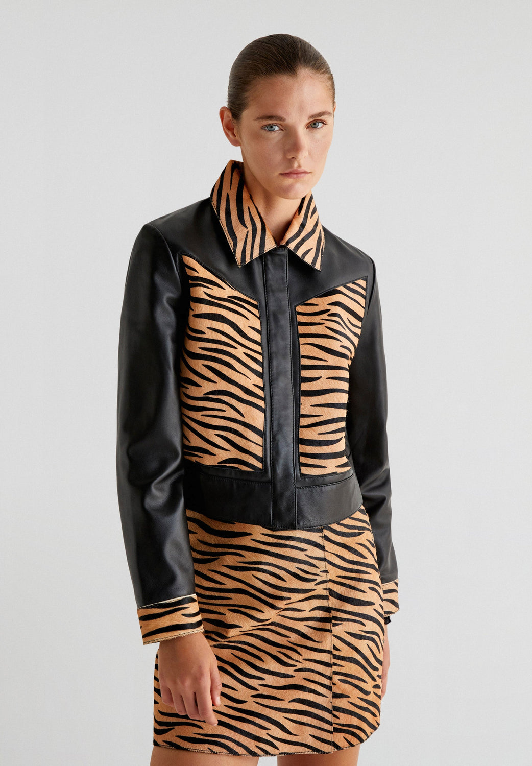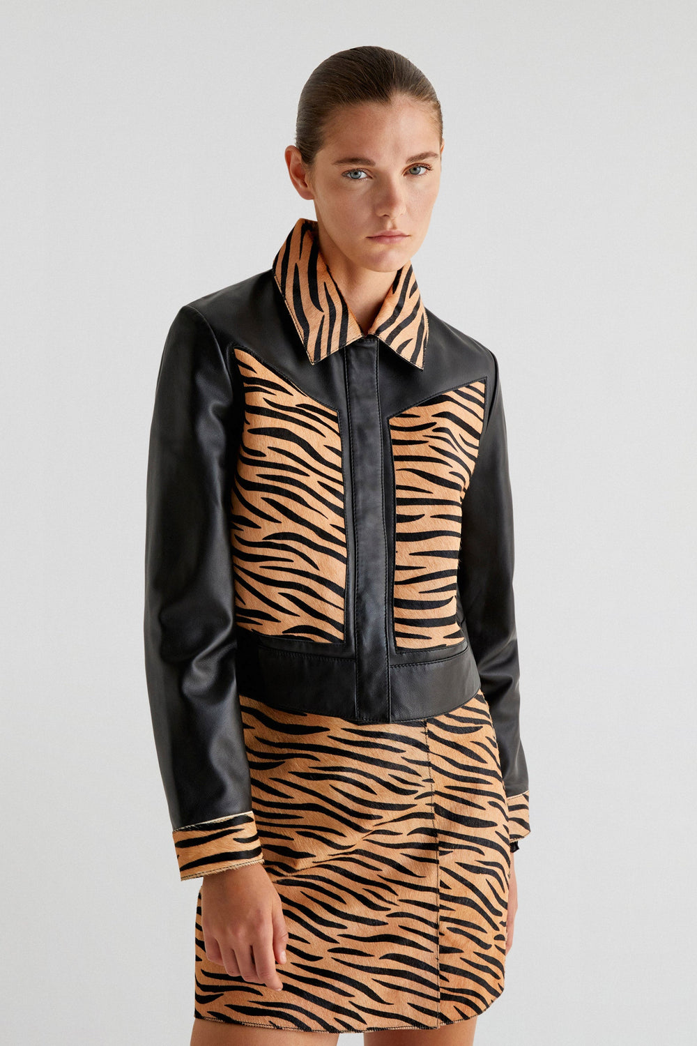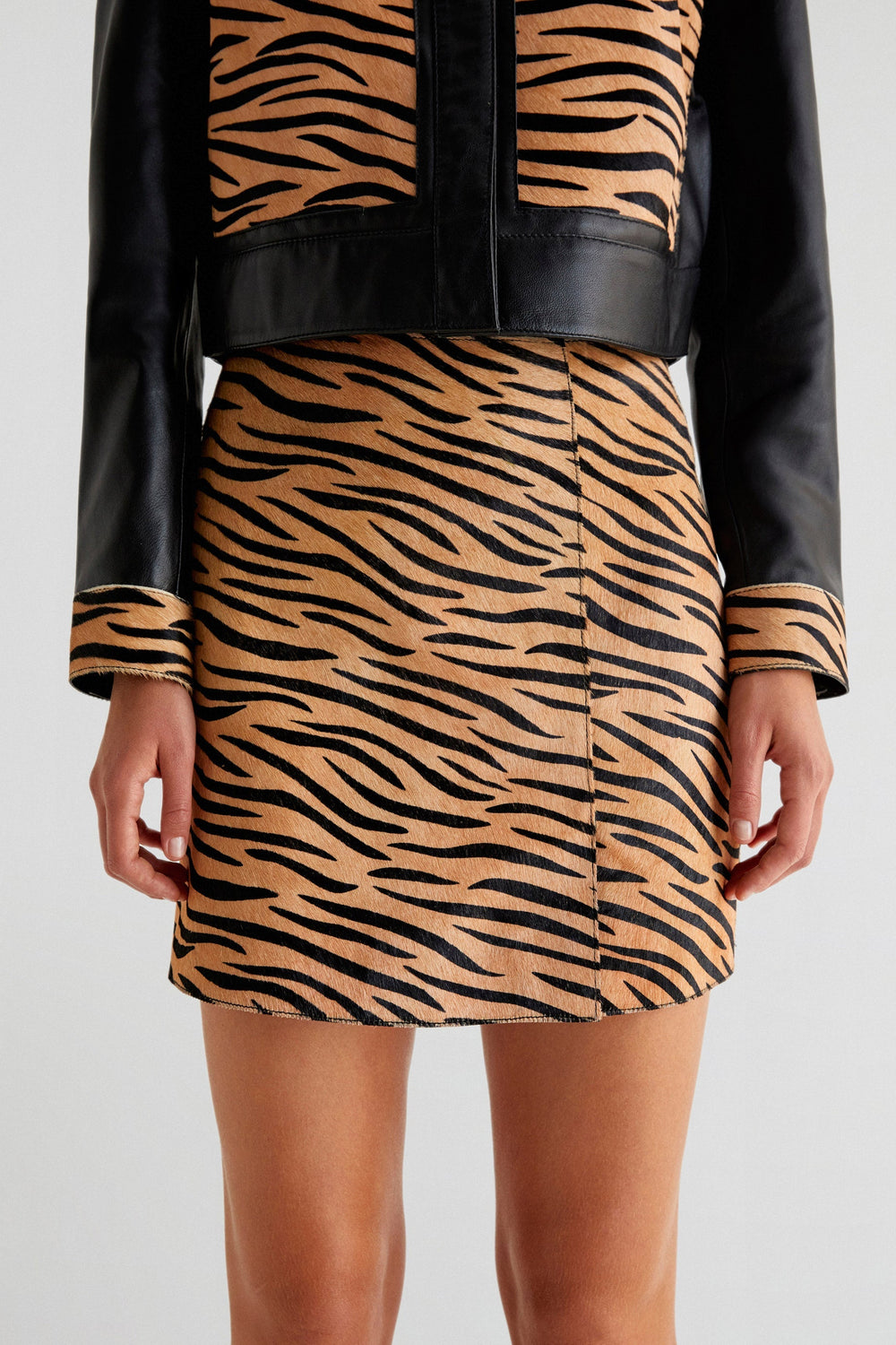 Falda mini de animal print confeccionada en 100% piel. Slim fit, cierre trasero con cremallera.