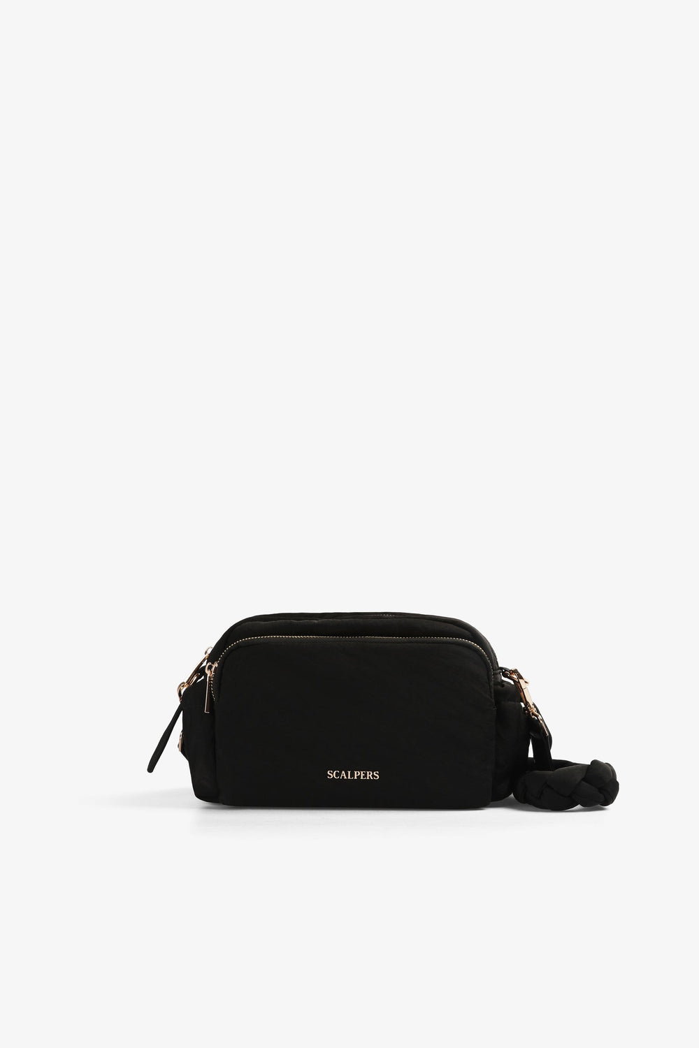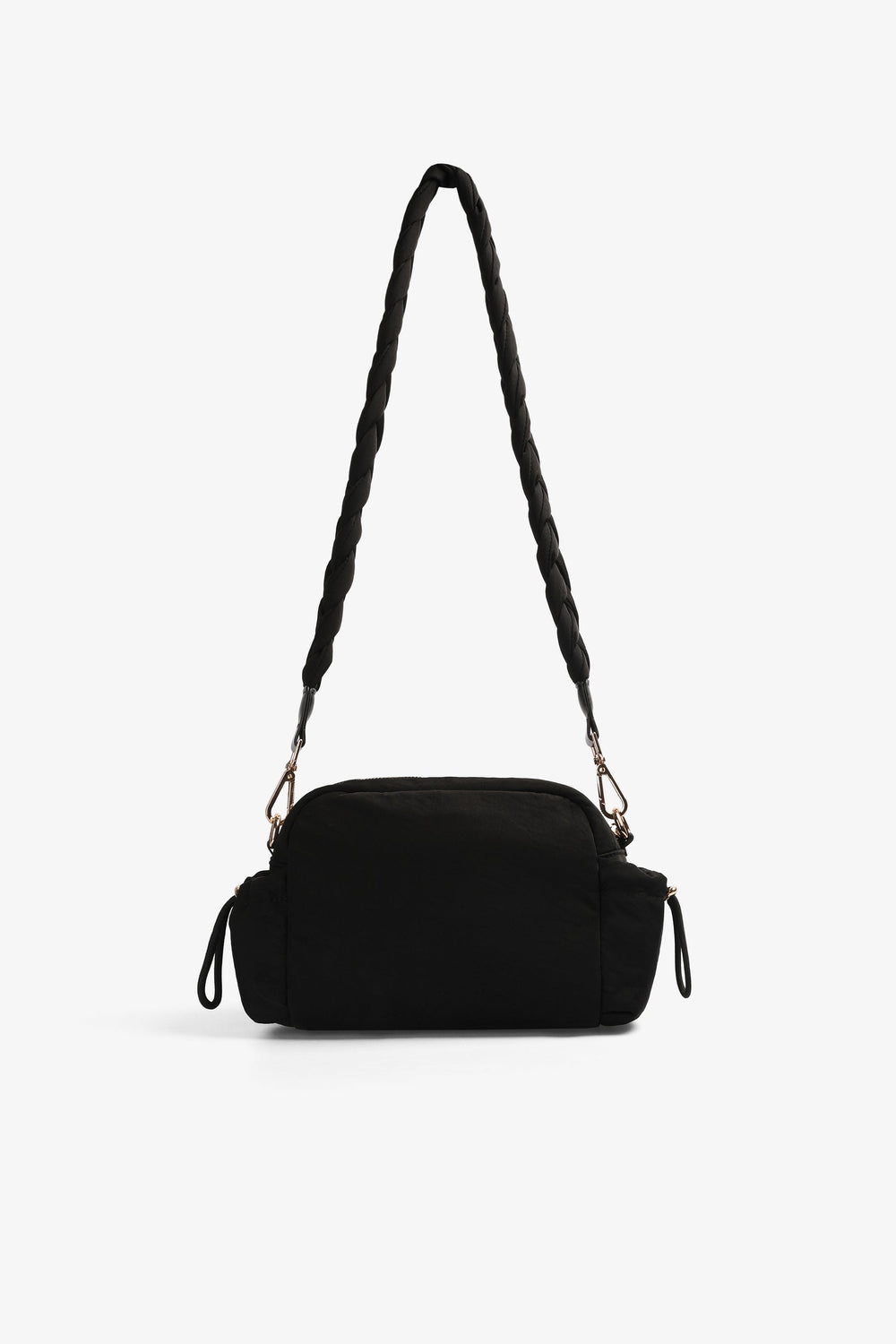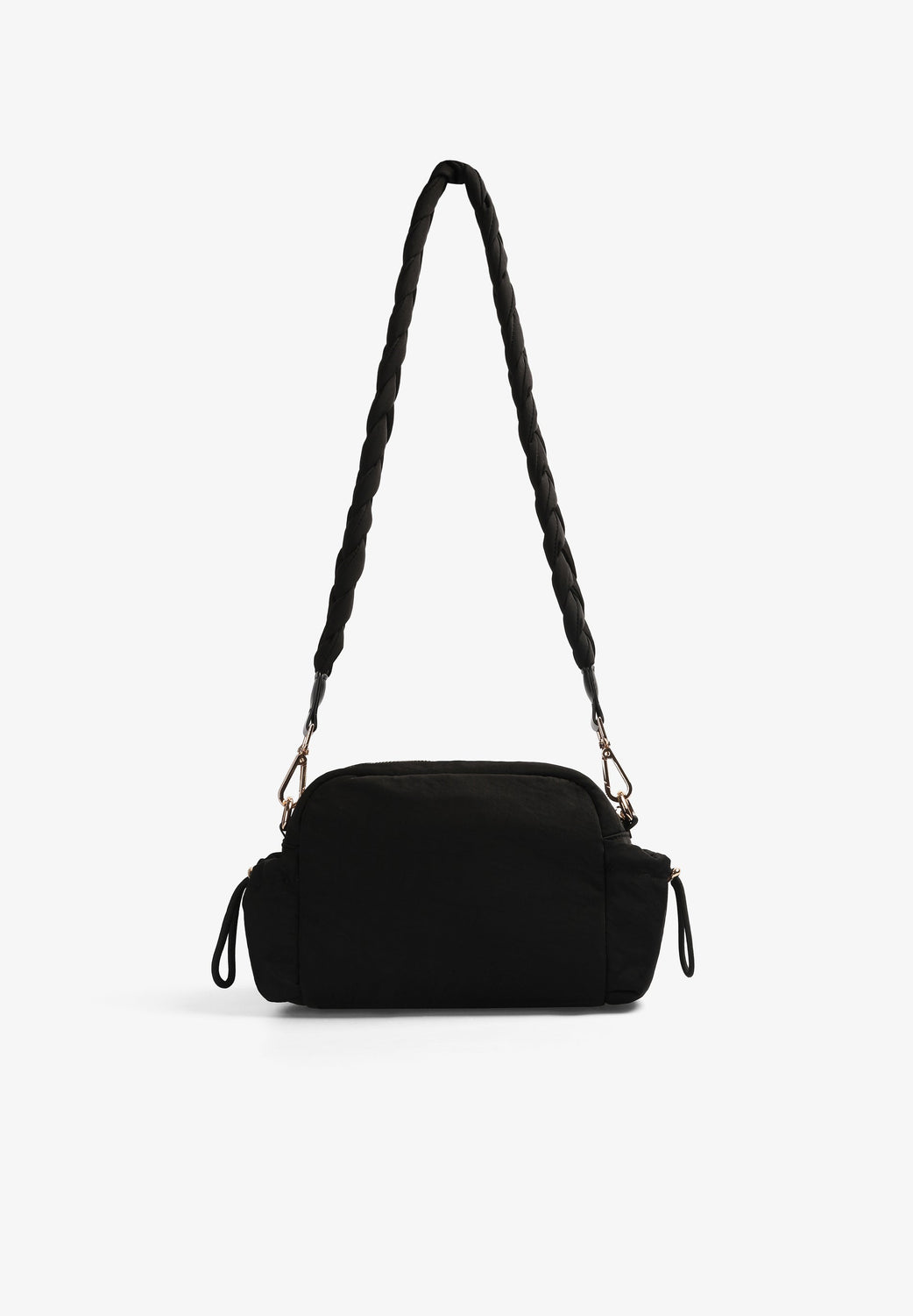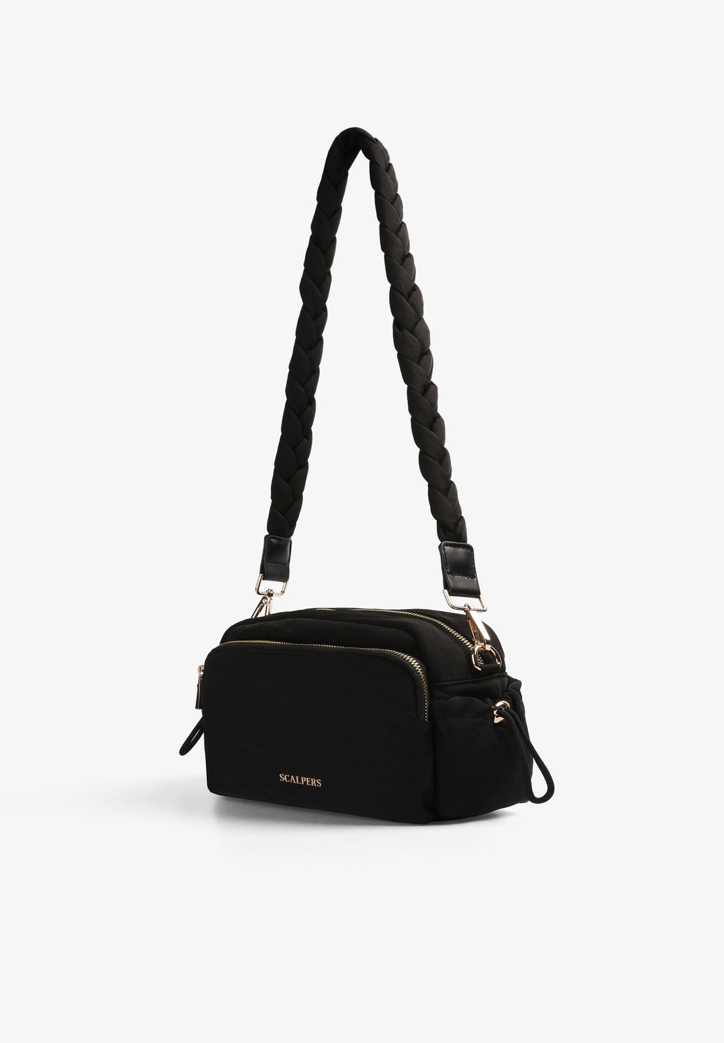 Bolso tipo bandolera con detalle de asa corta trenzada.