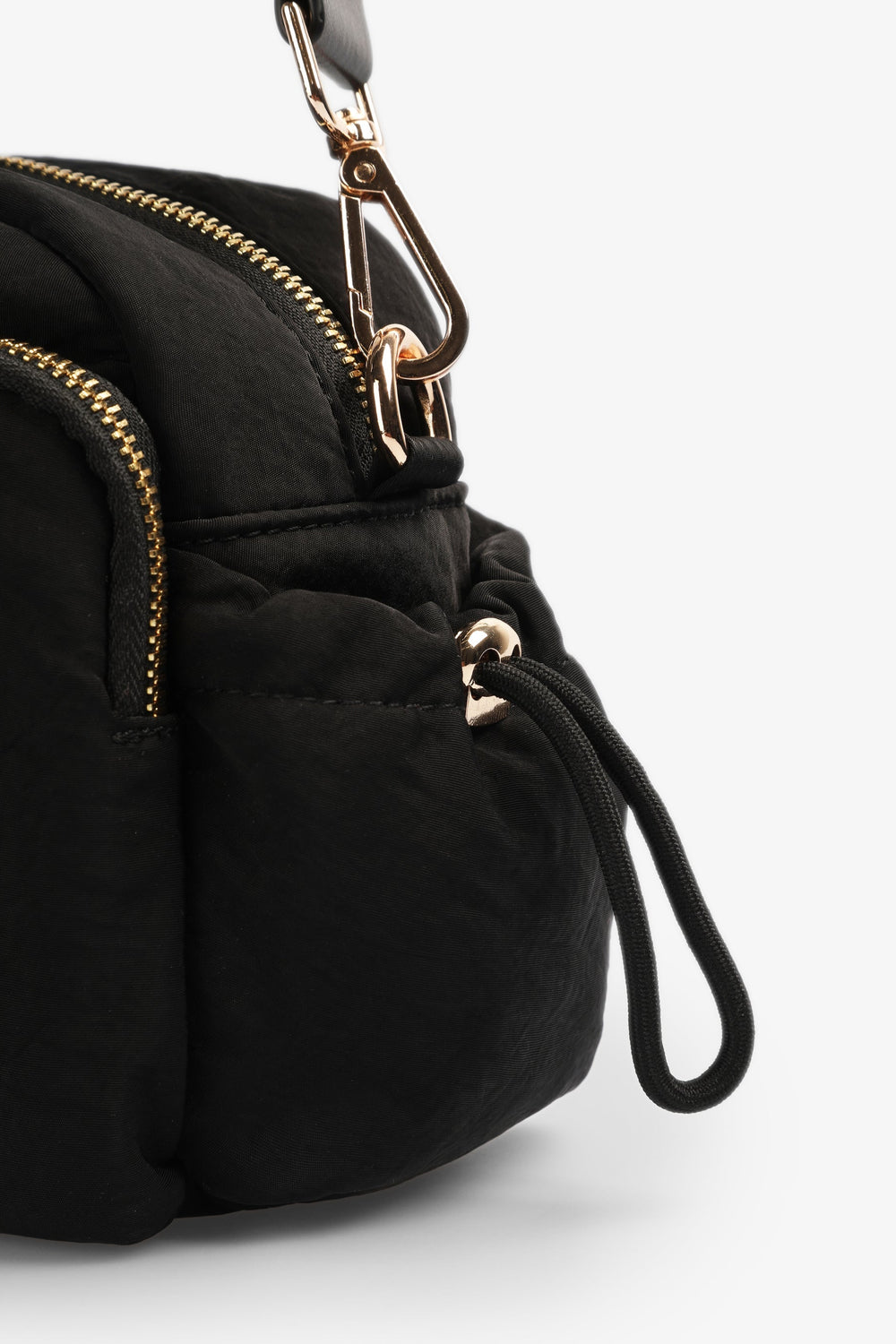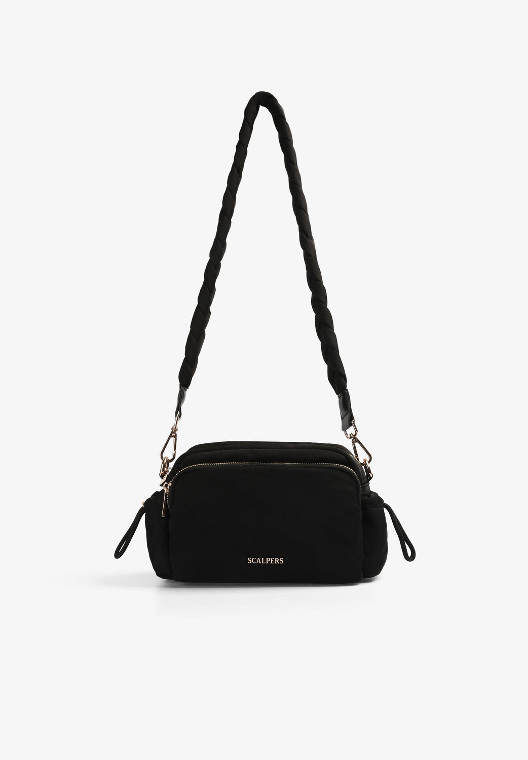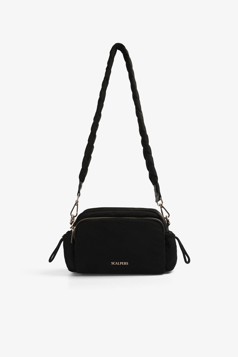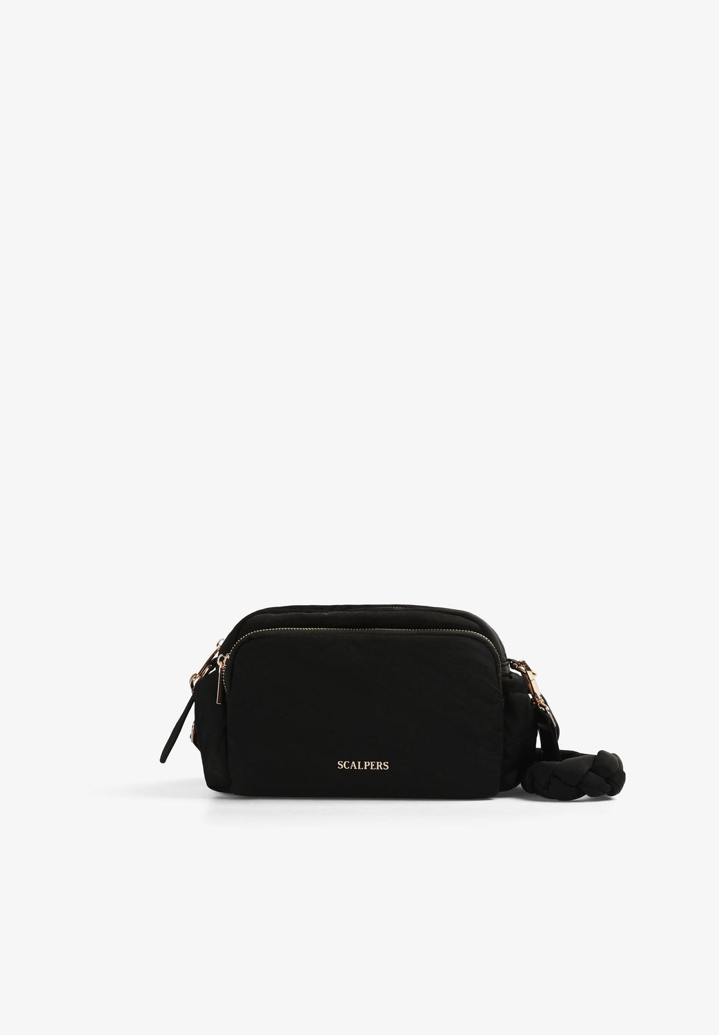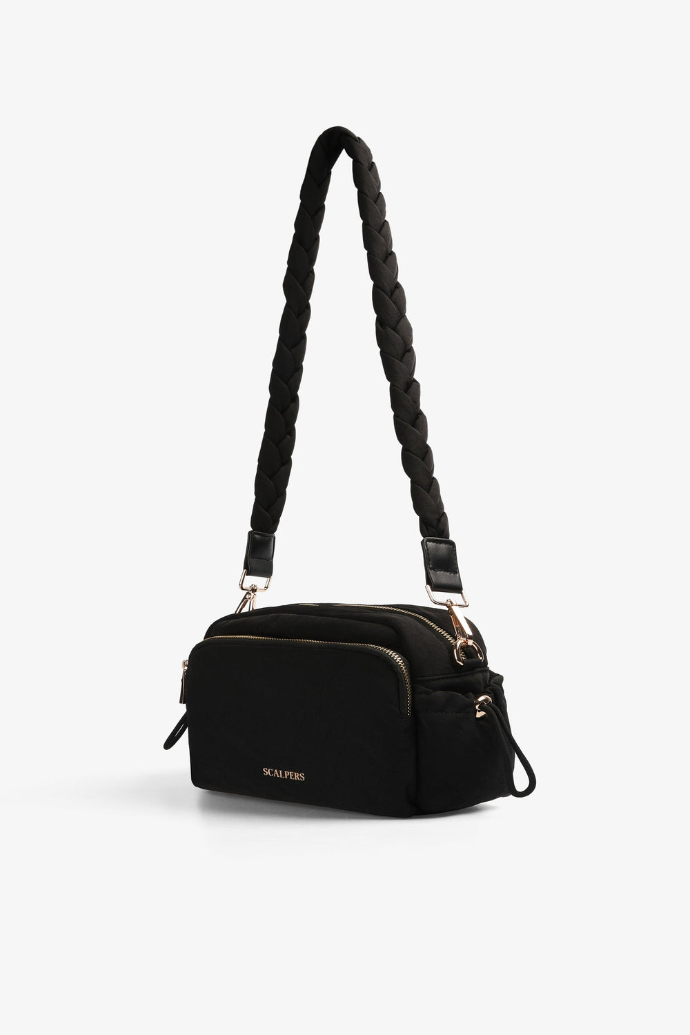 Bolso tipo bandolera con detalle de asa corta trenzada.