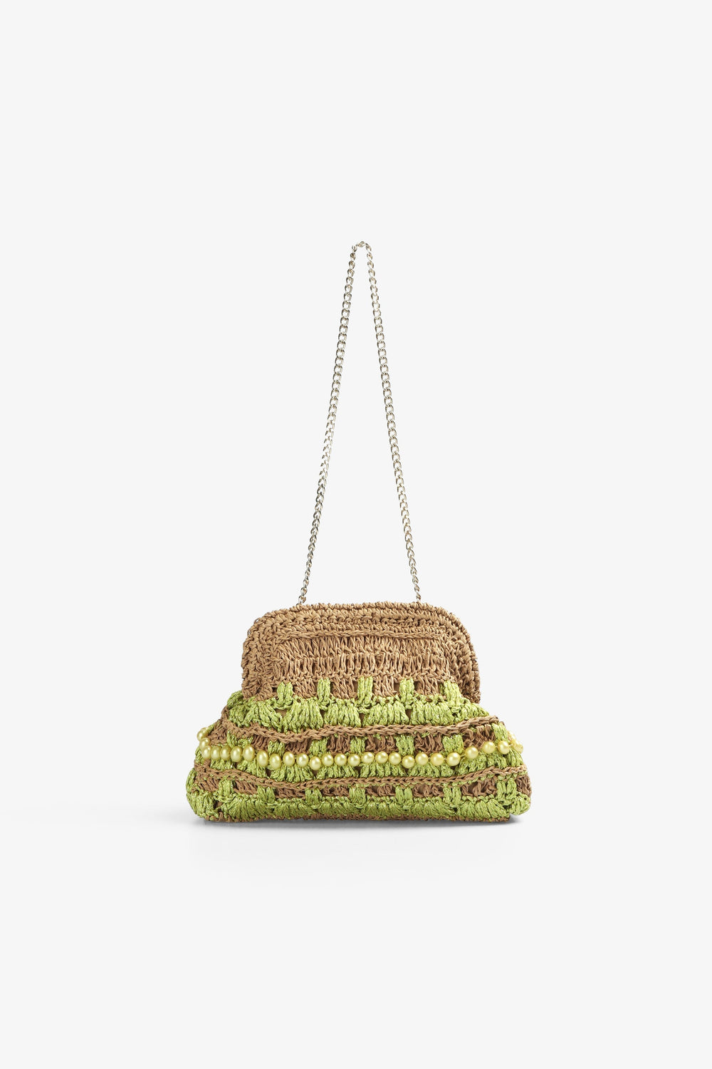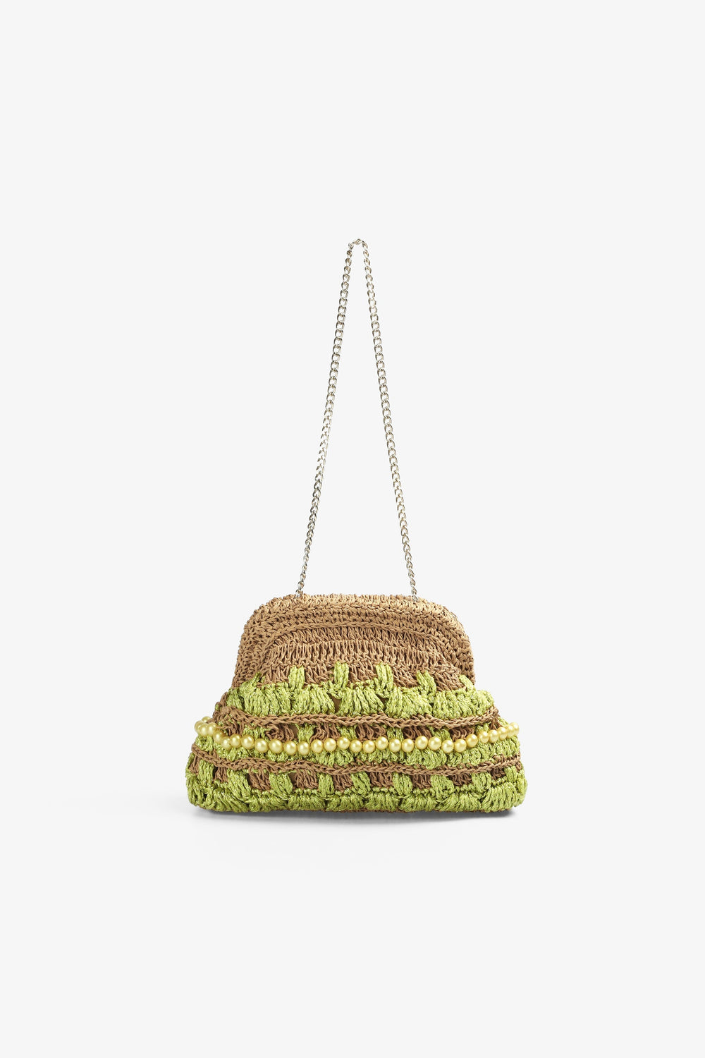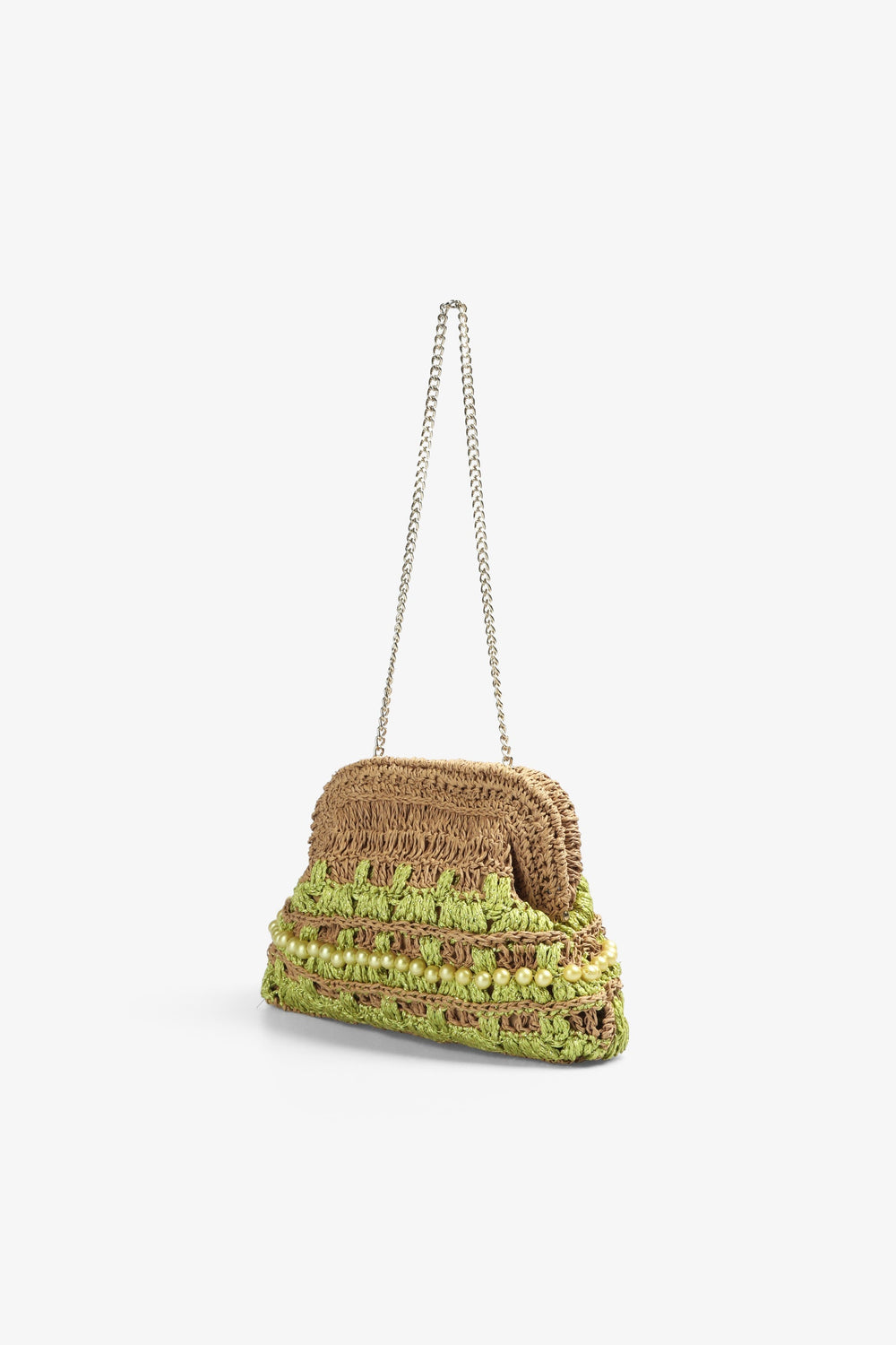 Bolso tipo clutch de crochet con detalle de abalorios.