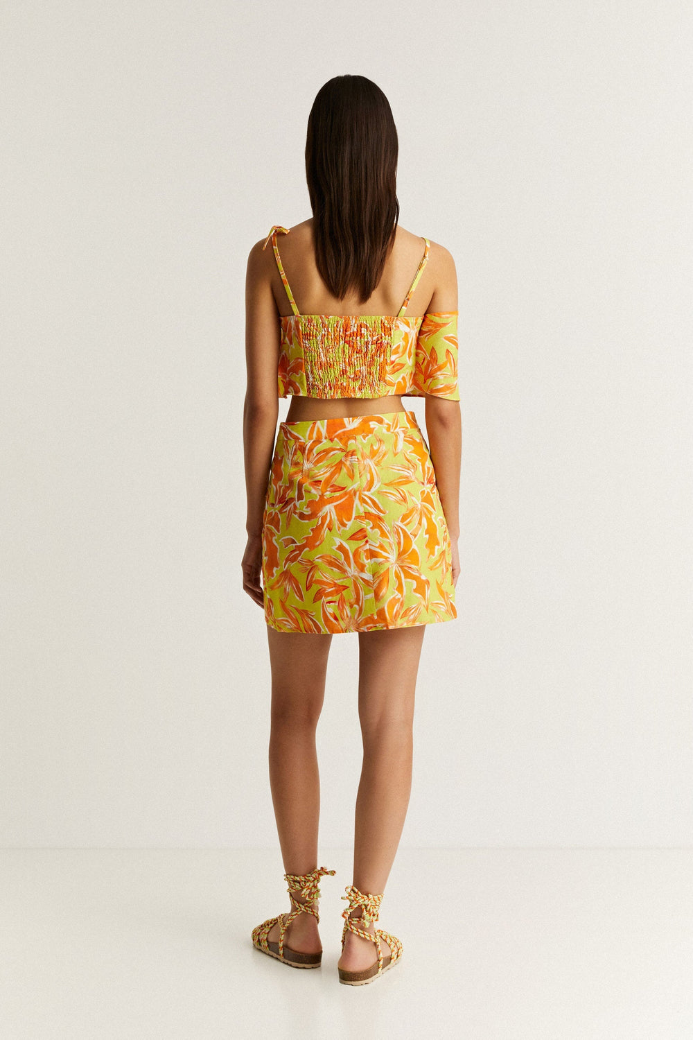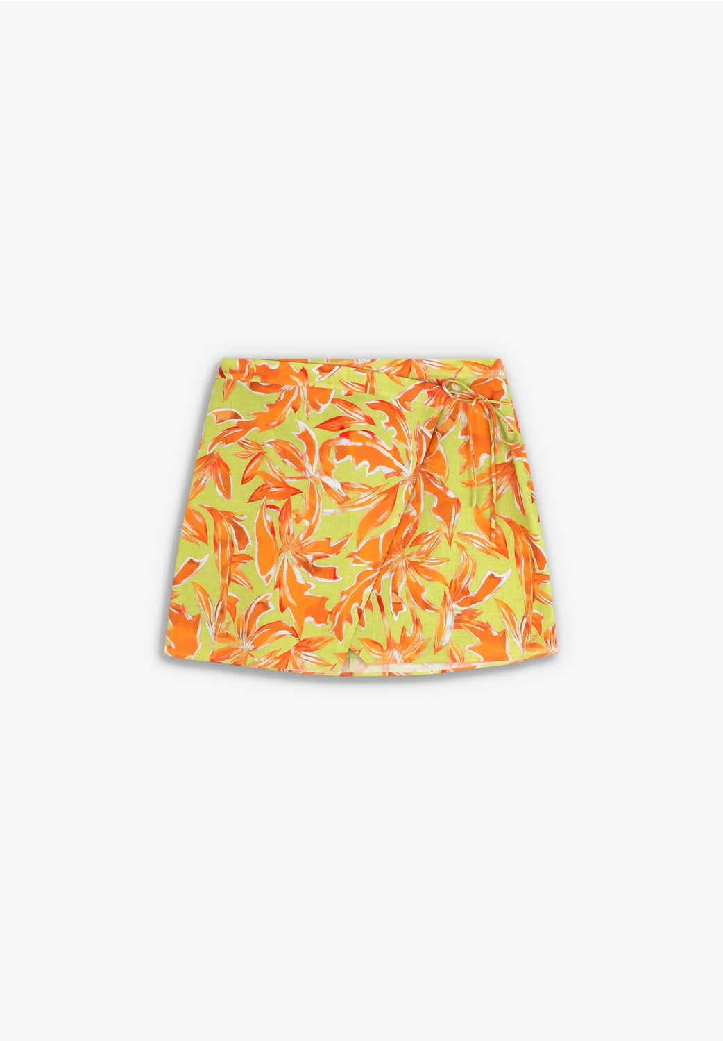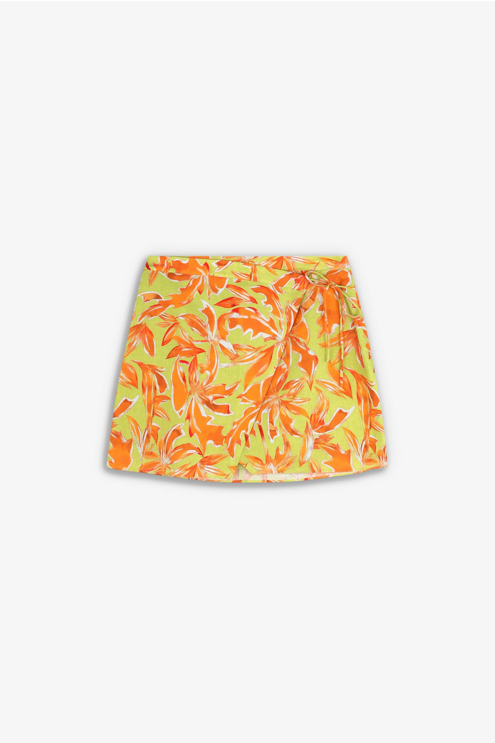Falda mini cruzada de lino con diseño tropical.