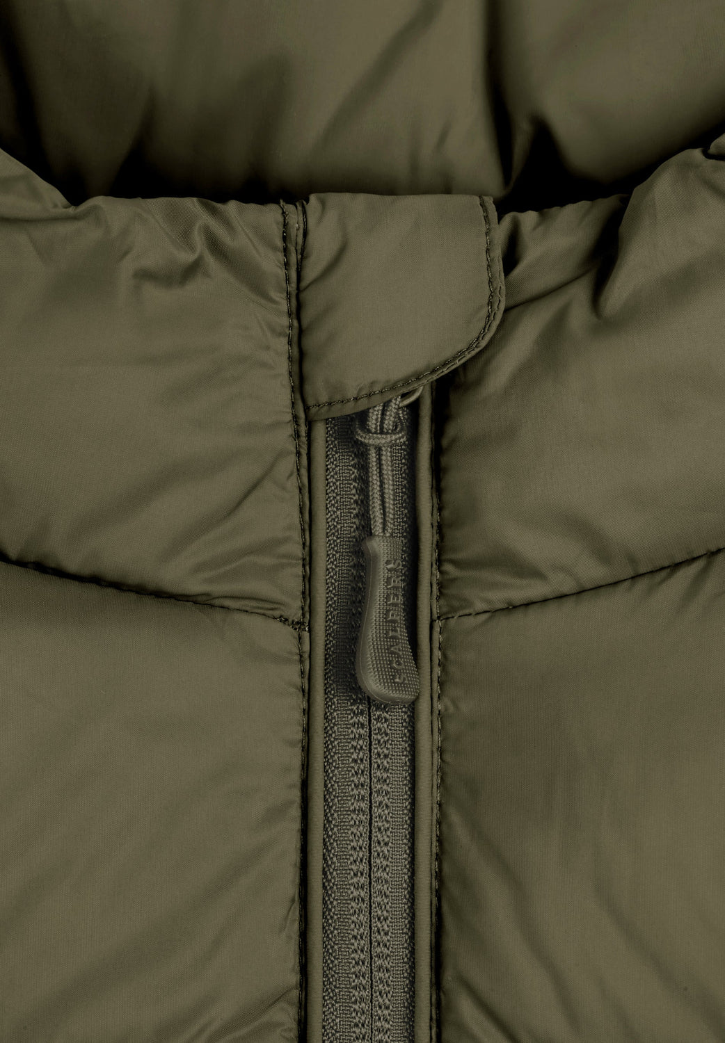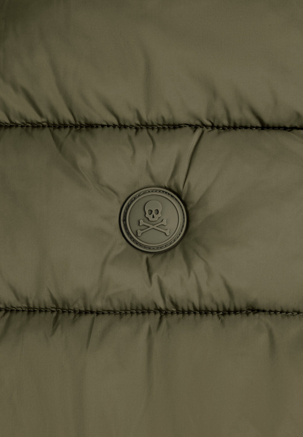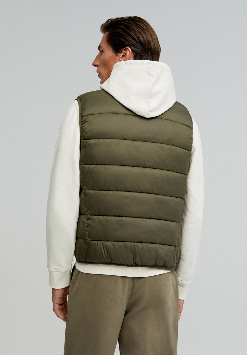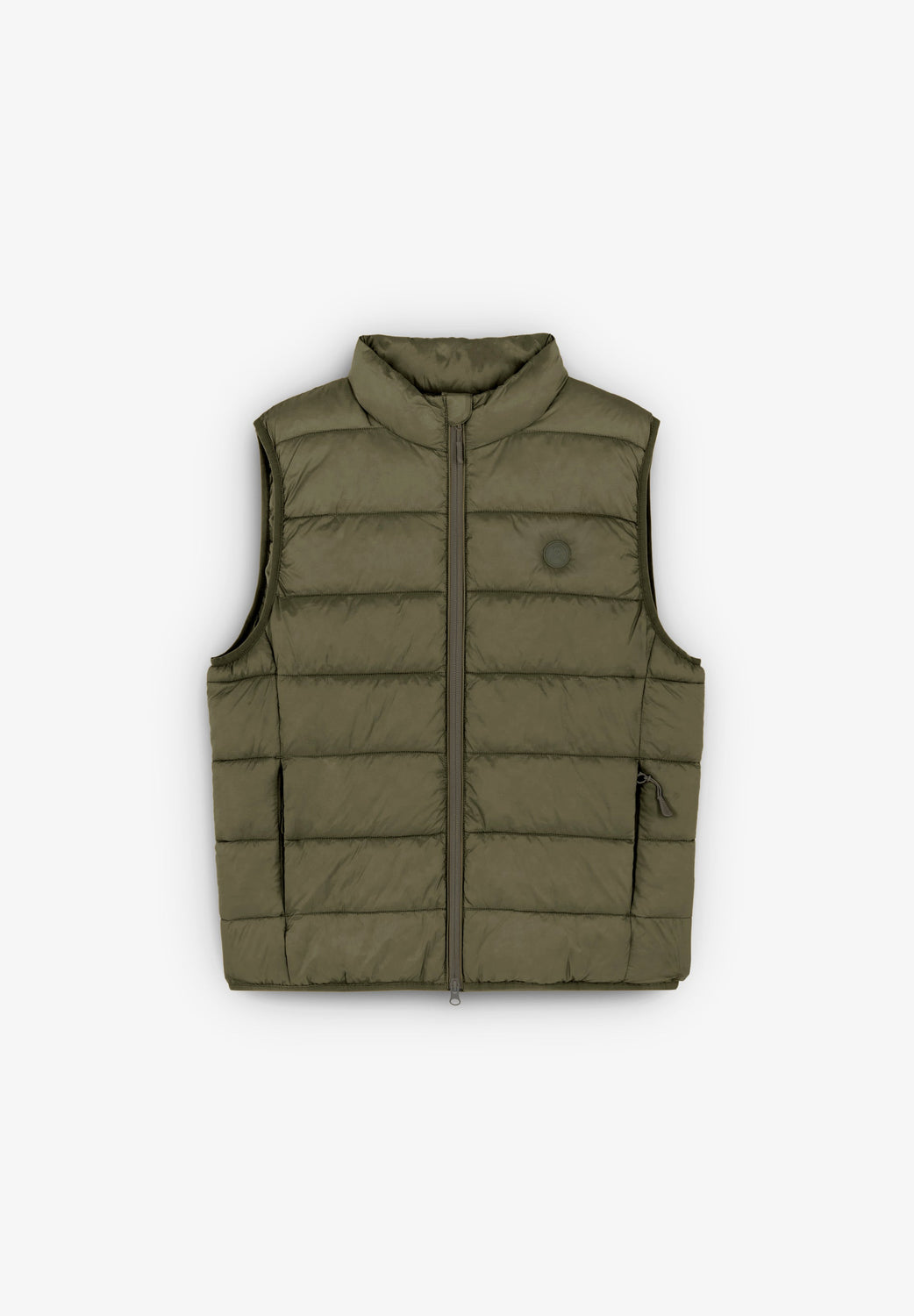 Chaleco acolchado con calavera engomada confeccionado en tejido reciclado. Regular fit, cuello subido y cierre con cremallera. Manga en sisa y bolsillos con cremallera. Bolsillo interior.
