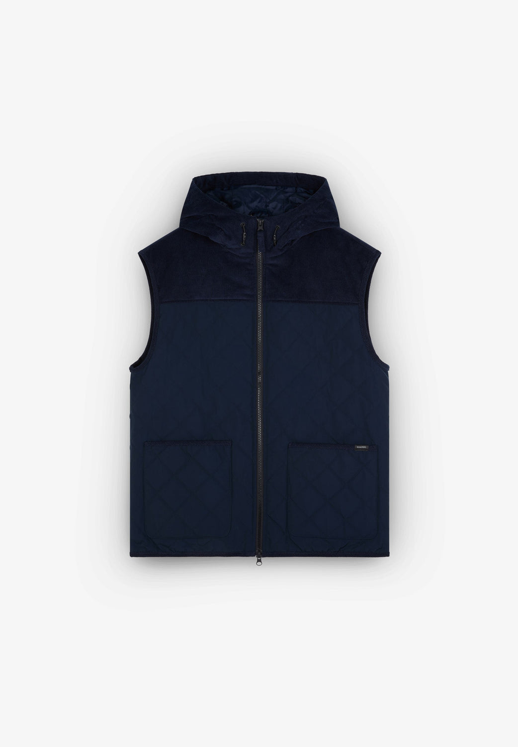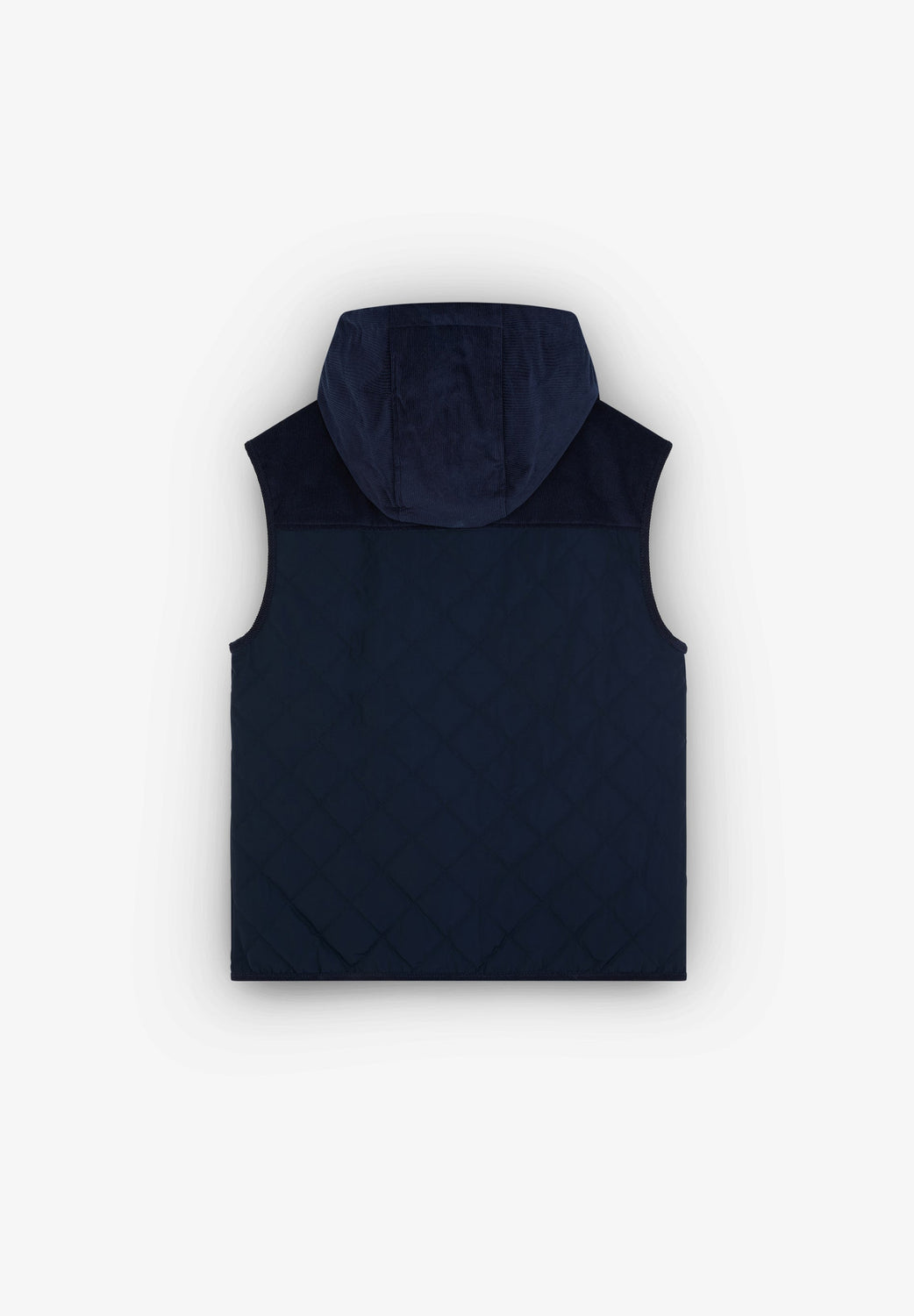 Chaleco acolchado confeccionado en 100% algodón BCI con detalle de pana. Regular fit, cuello con capucha y cierre con cremallera. Manga en sisa y bolsillos.
