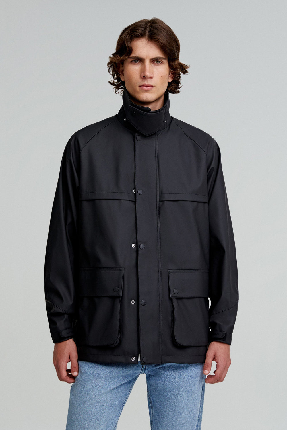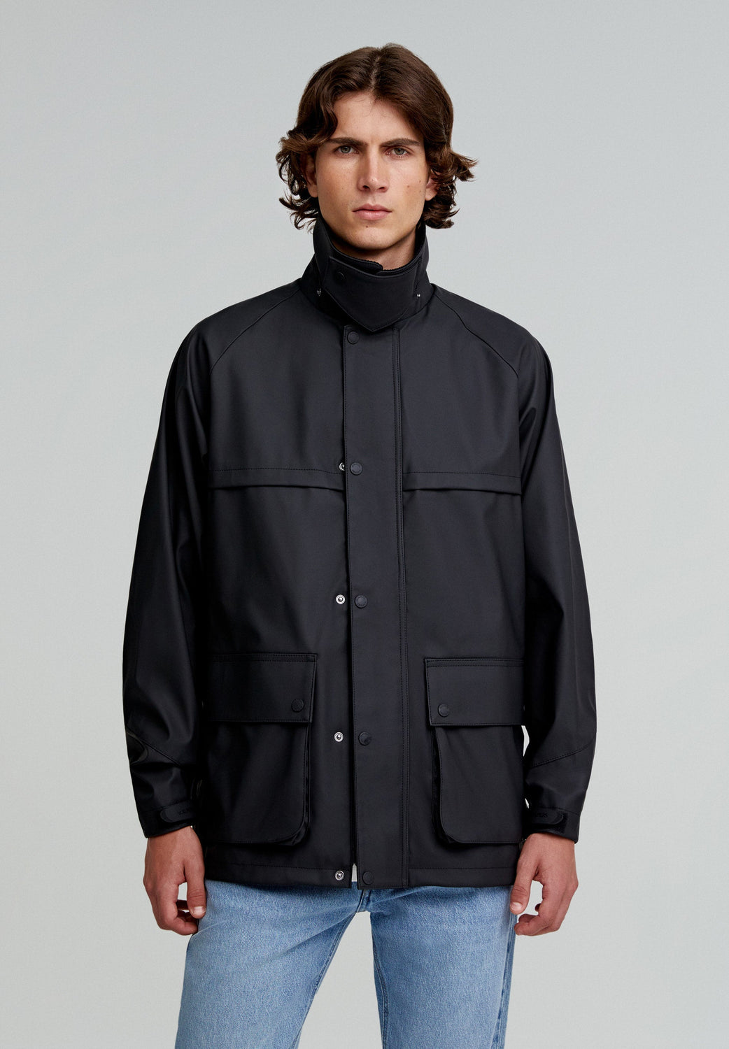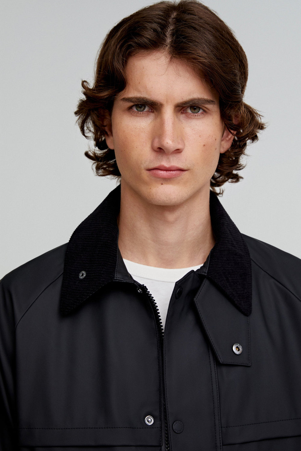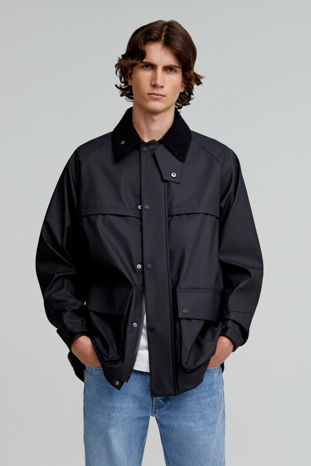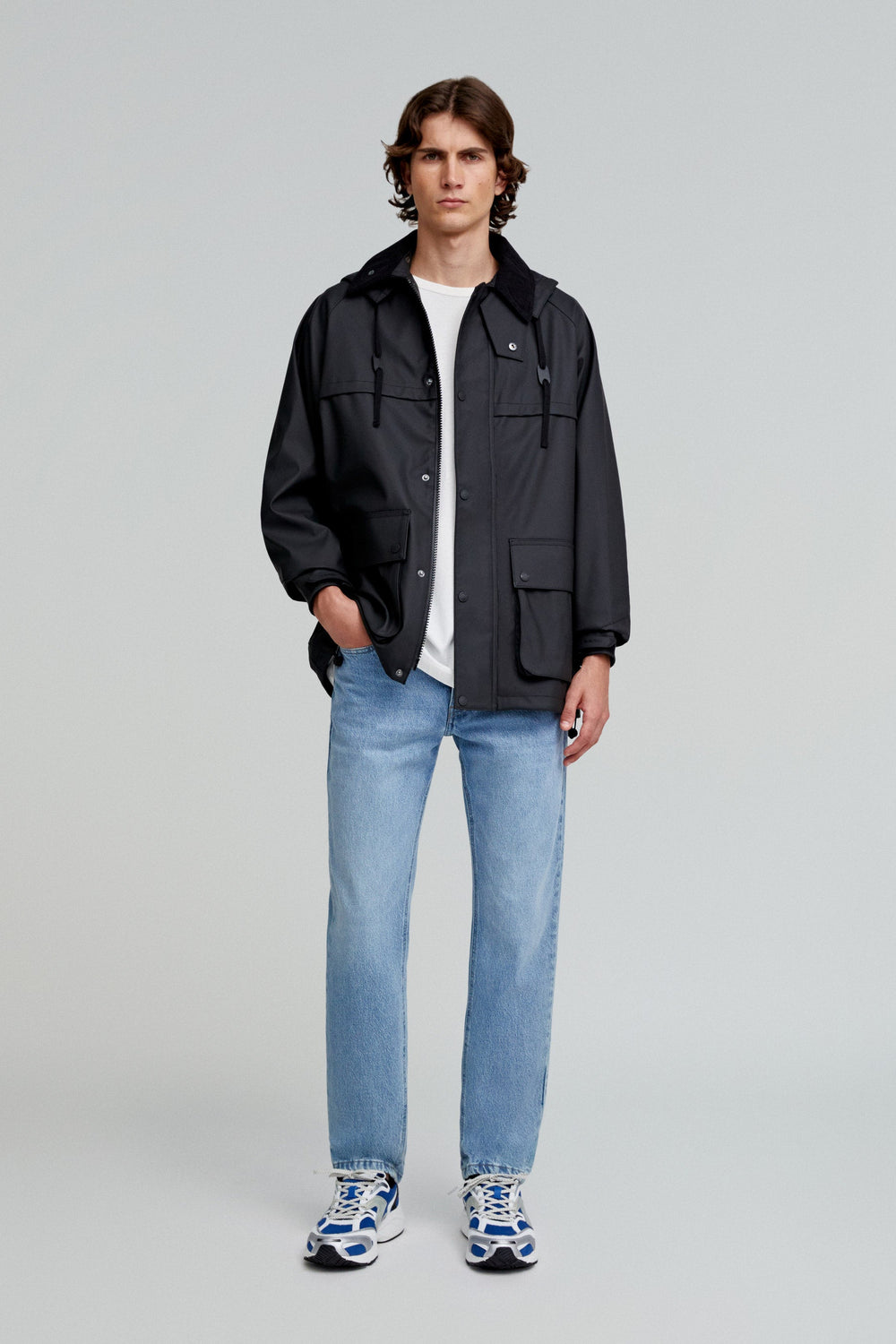 Chaqueta confeccionada en tejido técnico. Regular fit, cuello clásico de pana con capucha desmontable y cierre con cremallera y snaps. Manga larga terminada en puño ajustable con velcro con cremallera y rejilla en sisa para transpirar. Bolsillos frontales con tapeta y snaps. Cremalleras traseras y bajo ajustable.