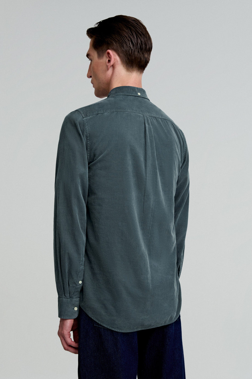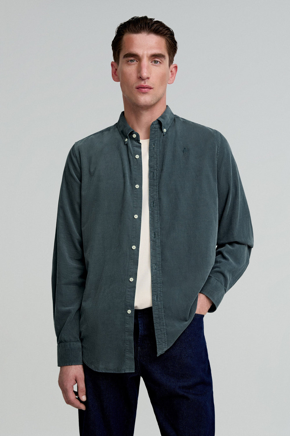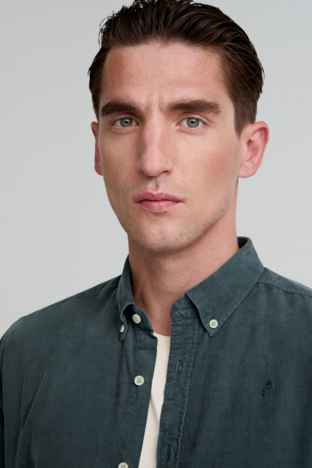 Camisa de pana confeccionada en 100% algodón. Regular fit, cuello con botones y cierre con botones. Manga larga terminada en puño con botón y calavera bordada a tono.