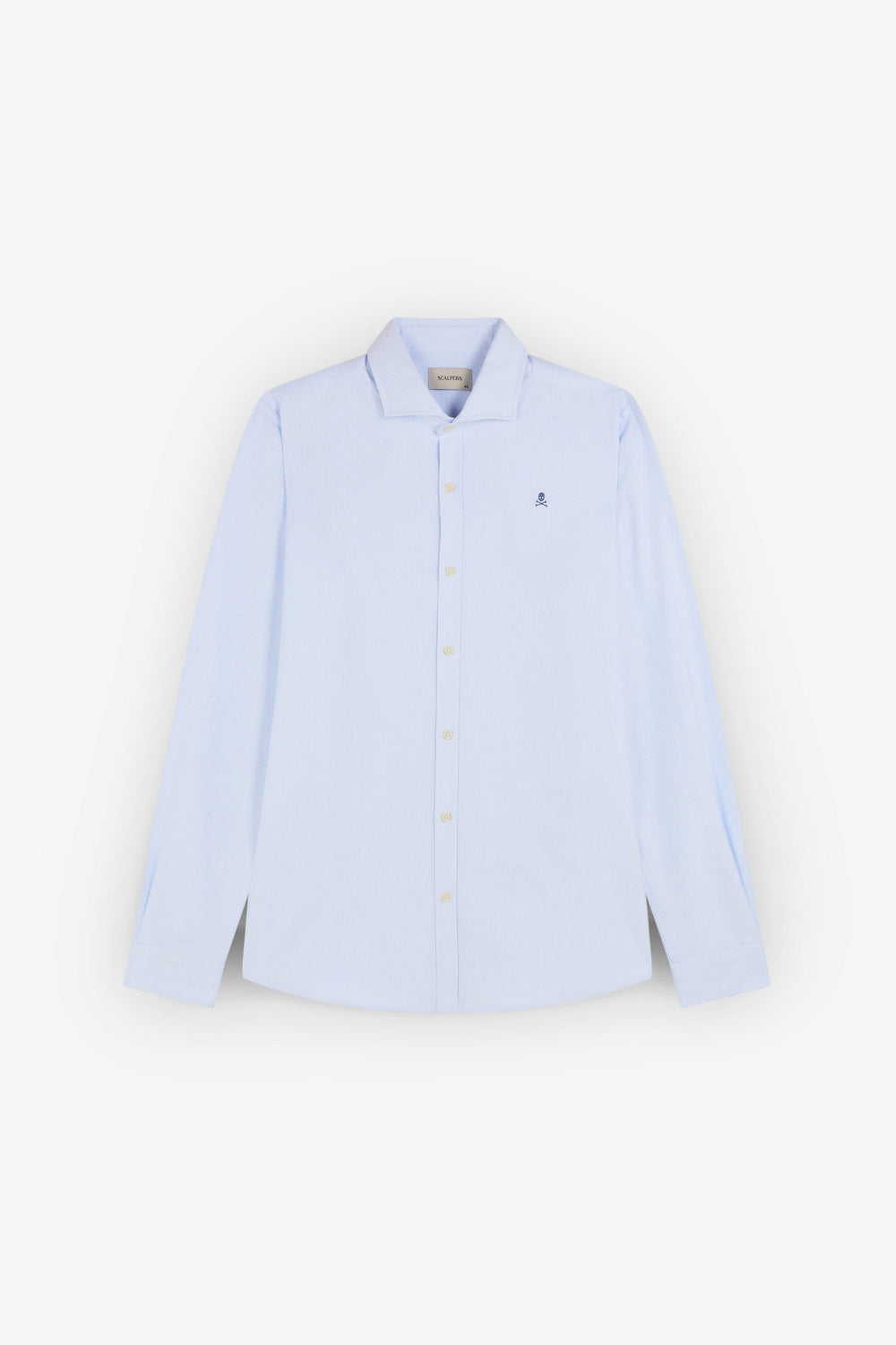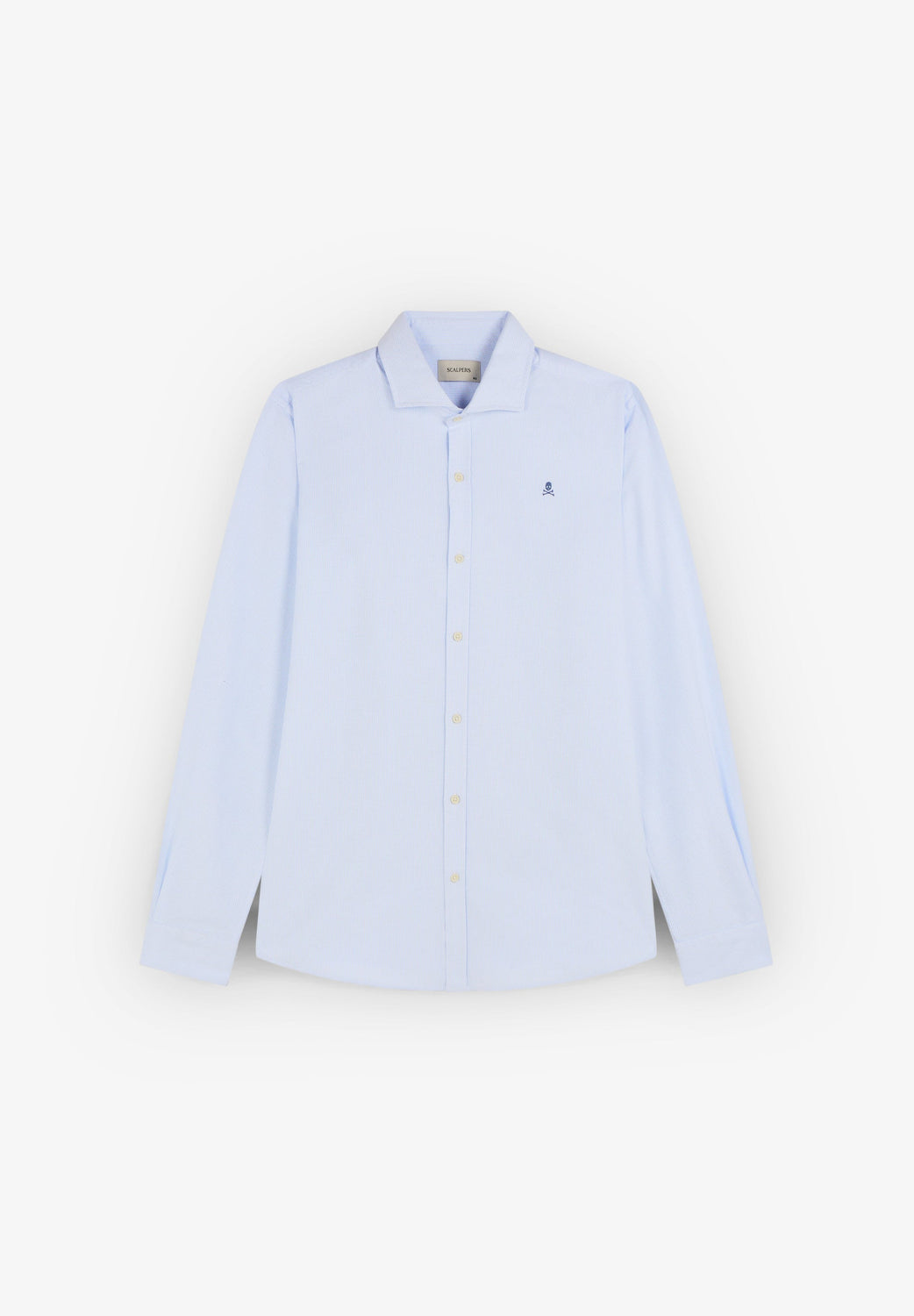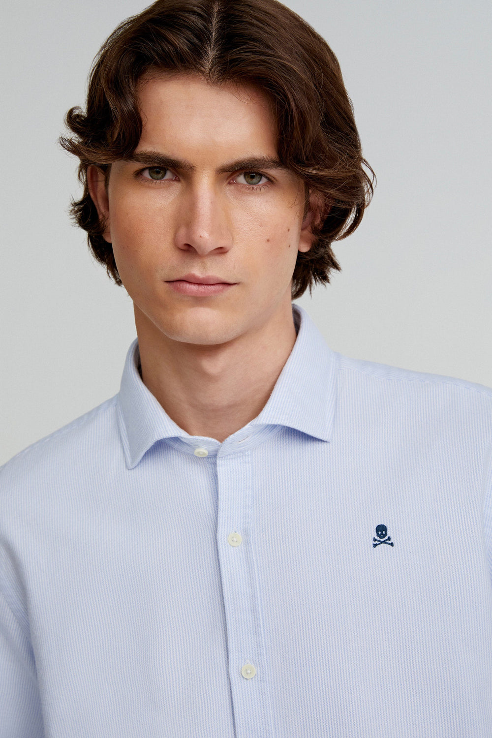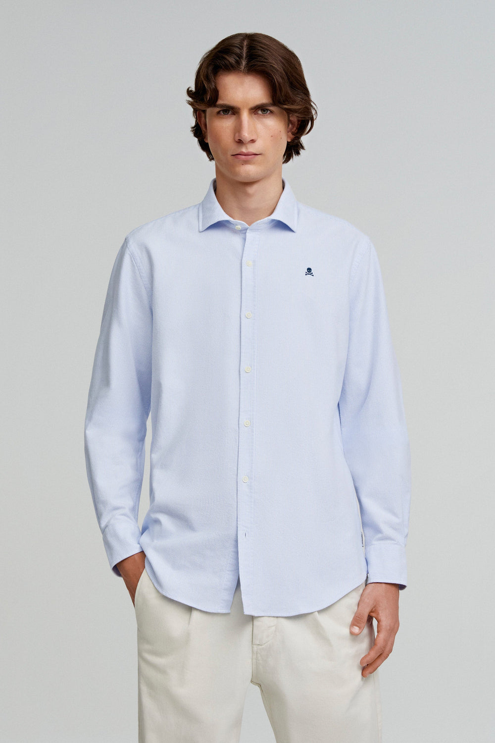 Camisa oxford confeccionada en 100% algodón. Regular fit, cuello italiano y cierre con botones. Manga larga terminada en puño con botones y calavera a contraste.