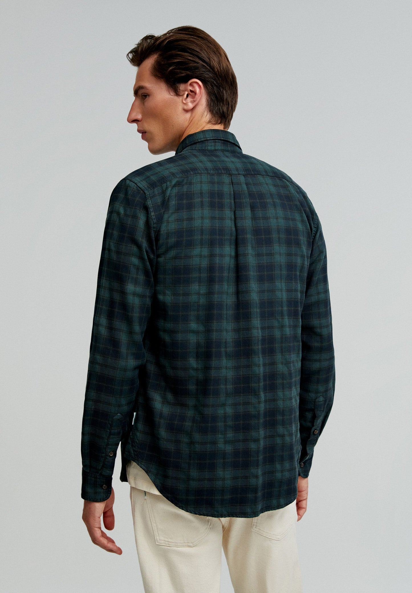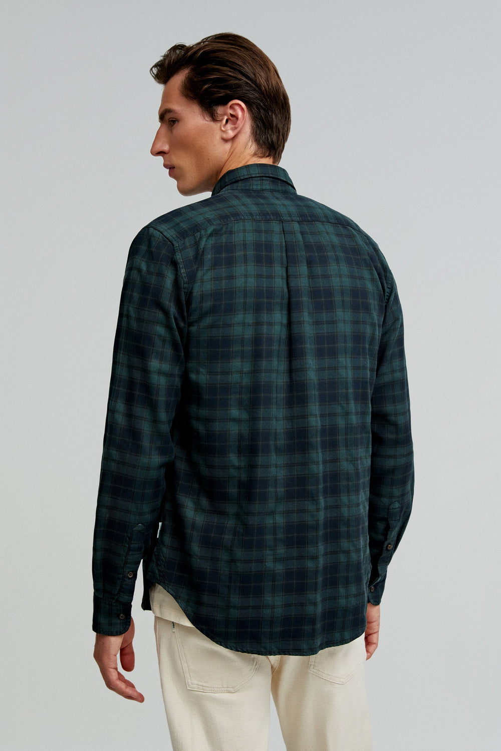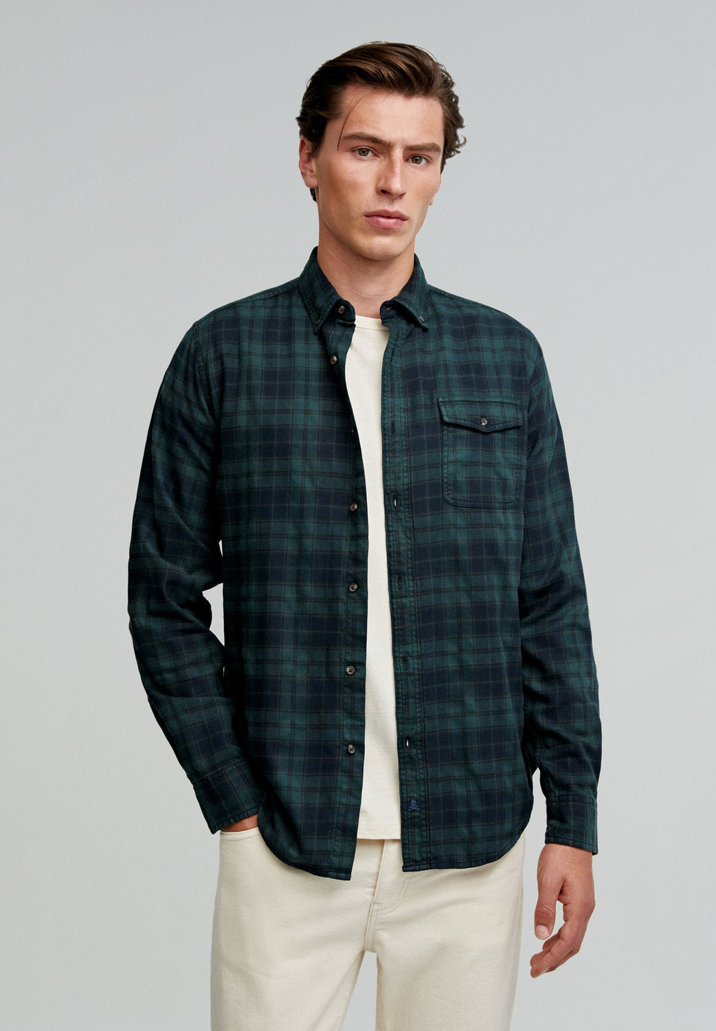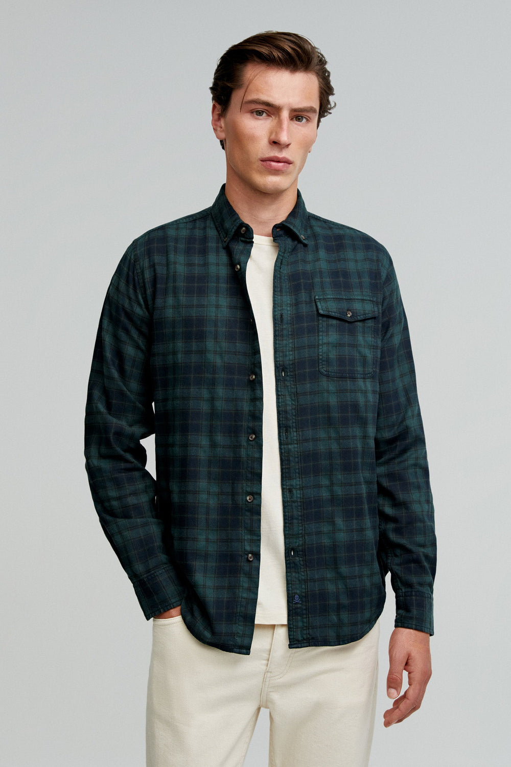 Camisa de cuadros tartán confeccionada en mezcla de algodón BCI. Regular fit, cuello con botones y cierre con botones. Manga larga terminada en puño con botones y bolsillo en pecho con tapeta y botón.