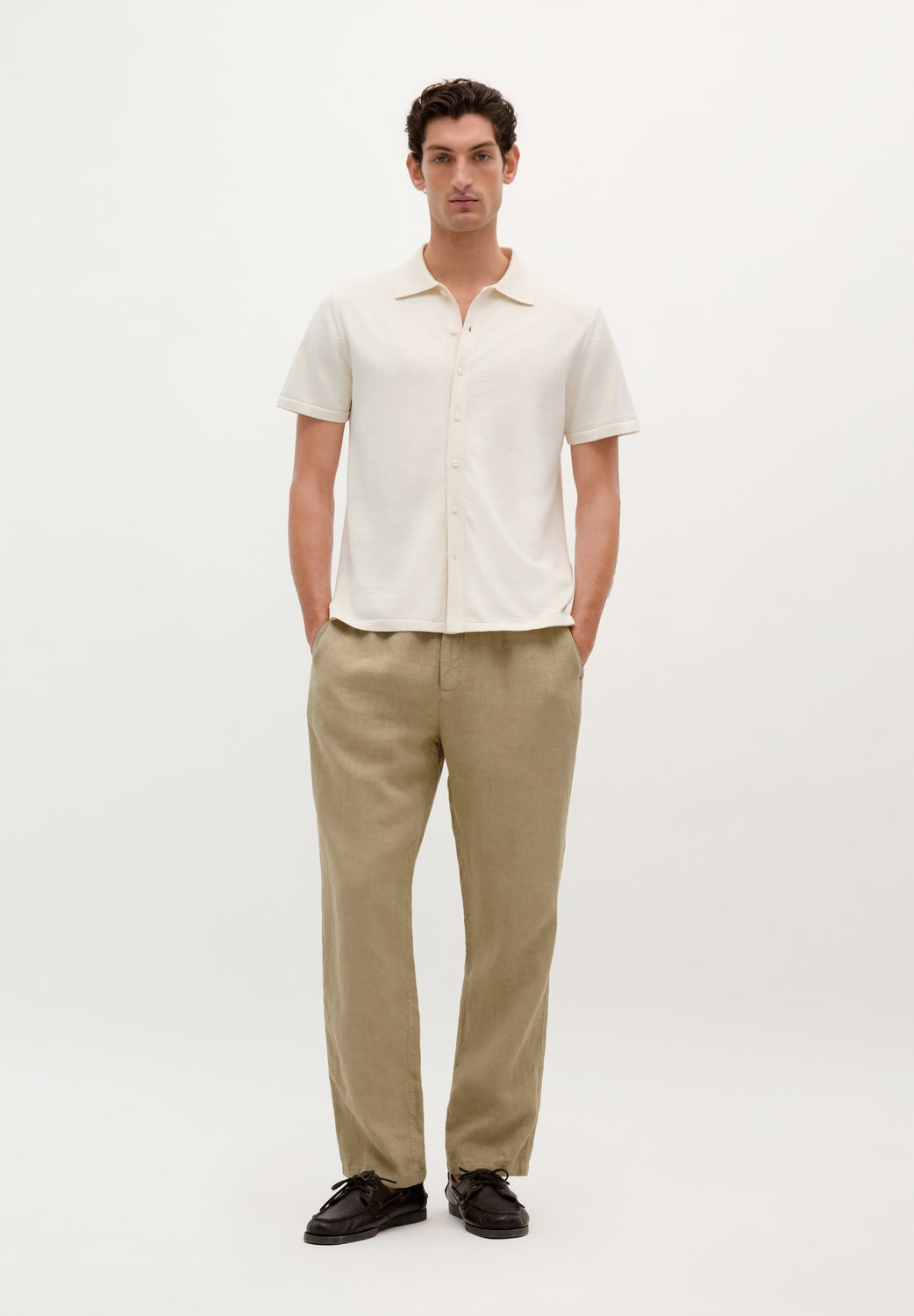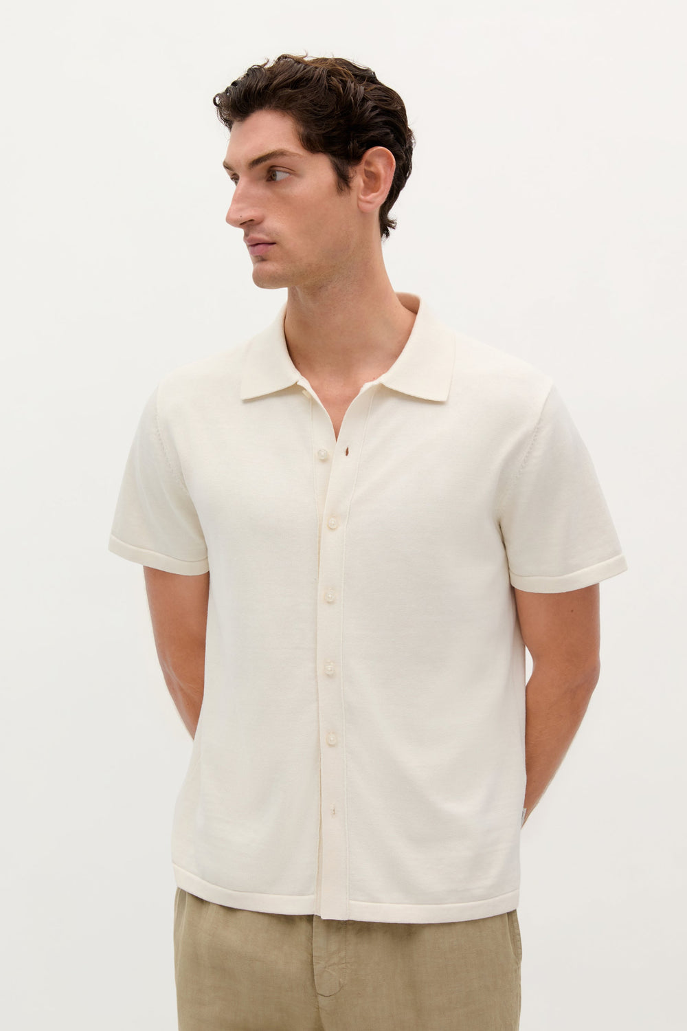 Jersey de punto fino confeccionado en mezcla de algodón y seda. Corte Regular Fit, cuello polo y manga corta. Cierre con botones.
