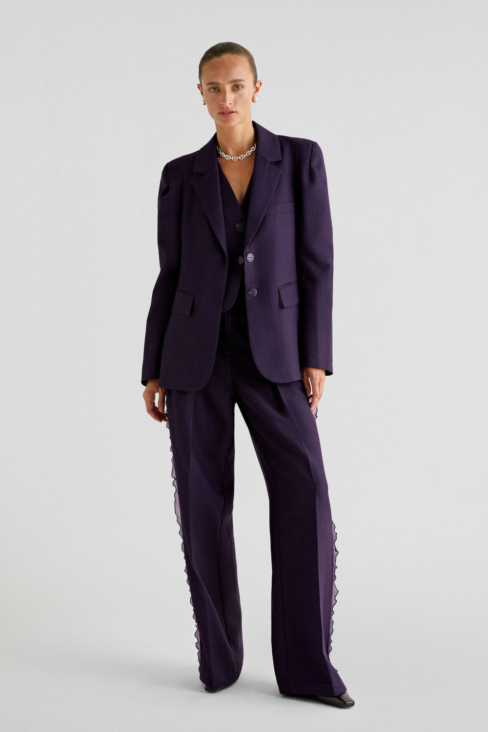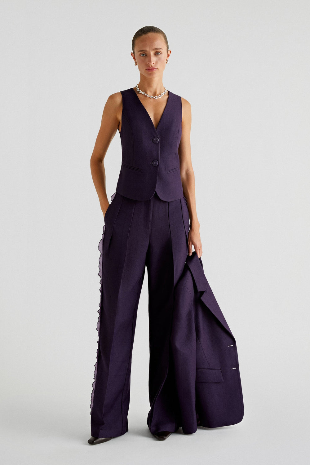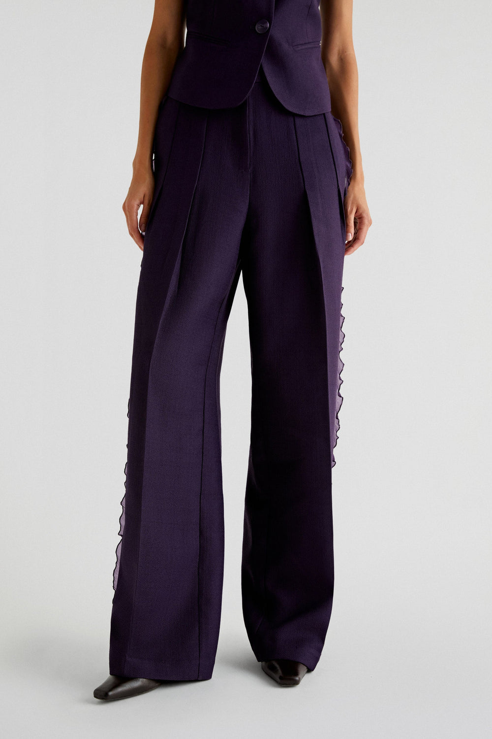Pantalón con detalle de organza. Full length con tiro alto y pinzas, cierre con cremallera y botón. Bolsillos y trabillas en cintura.