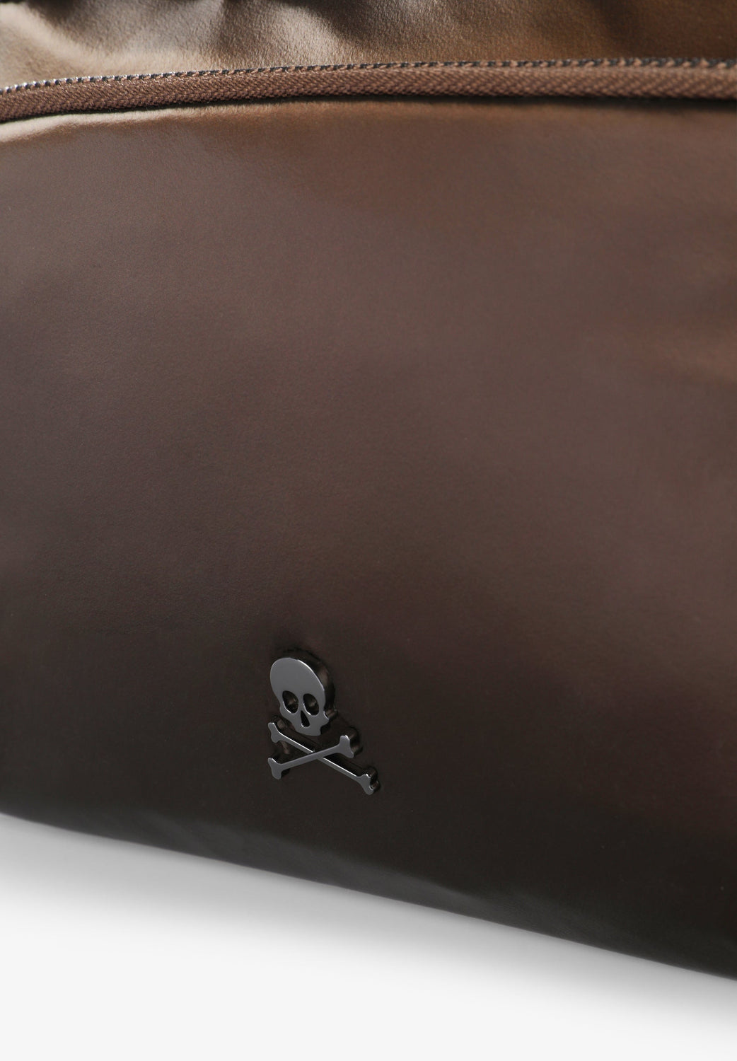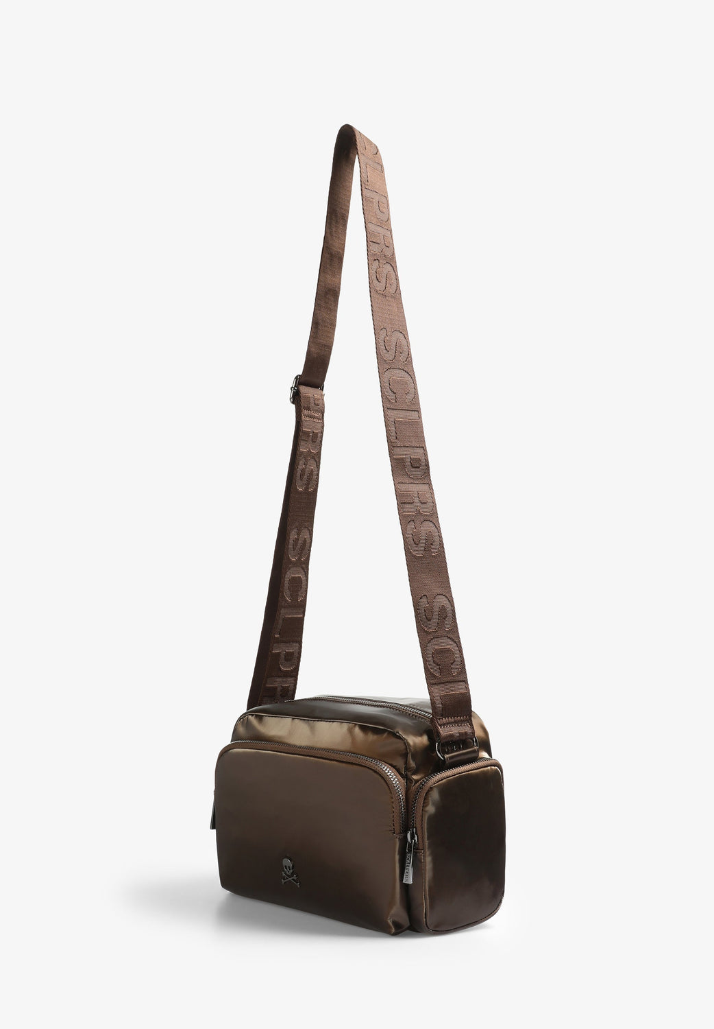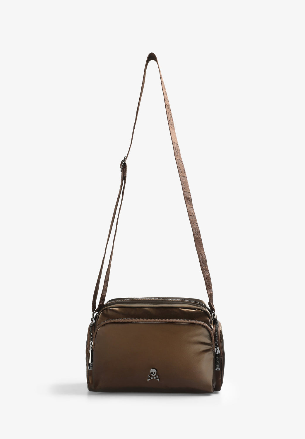 Bolso bandolera metalizado confeccionado en nylon. Asa larga ajustable y cierre con cremallera. Bolsillos delanteros y laterales con cremallera y calavera metálica.