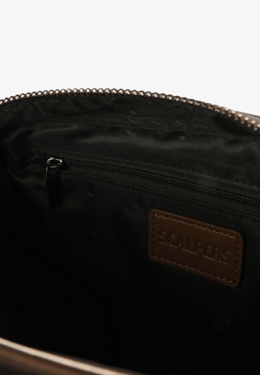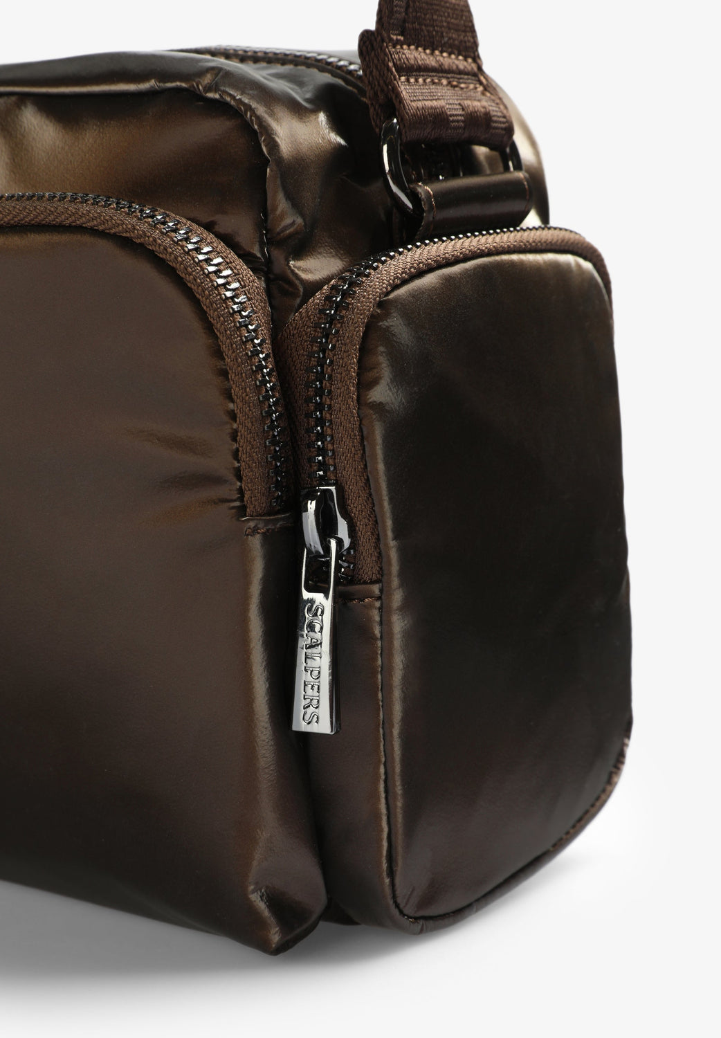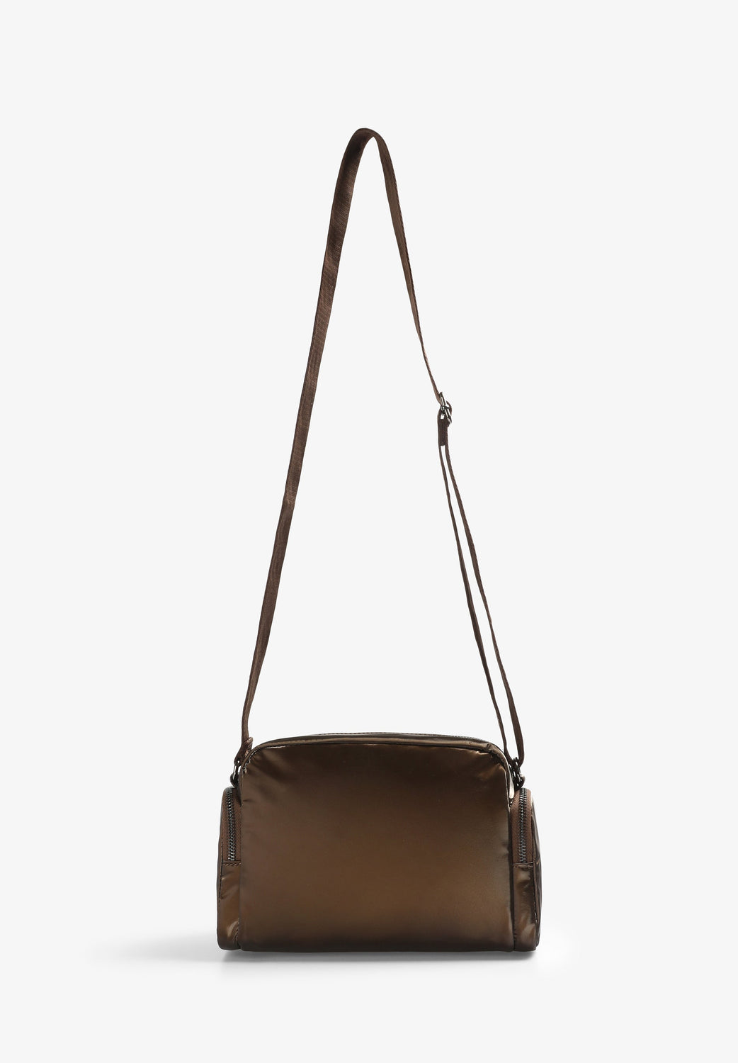 Bolso bandolera metalizado confeccionado en nylon. Asa larga ajustable y cierre con cremallera. Bolsillos delanteros y laterales con cremallera y calavera metálica.
