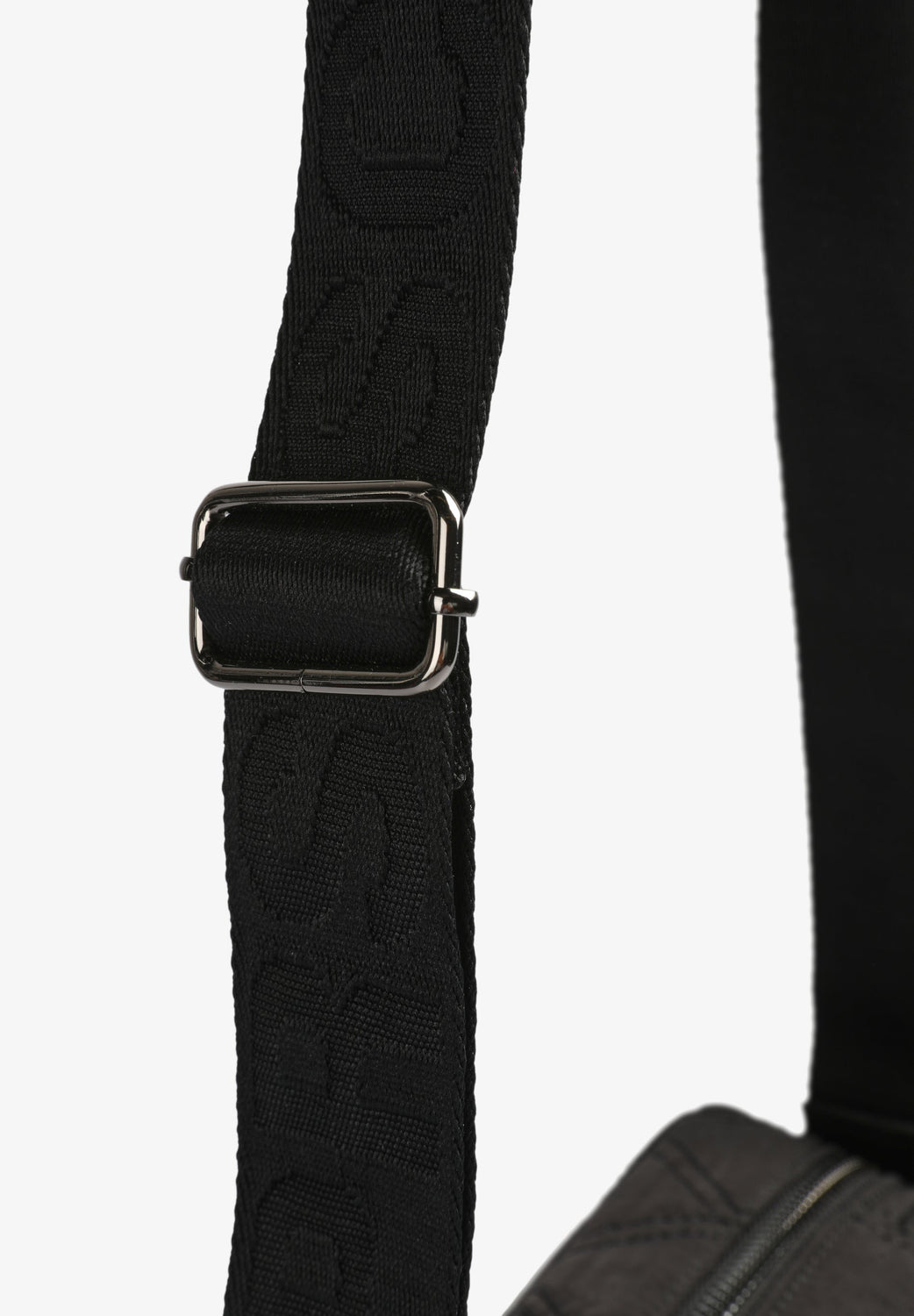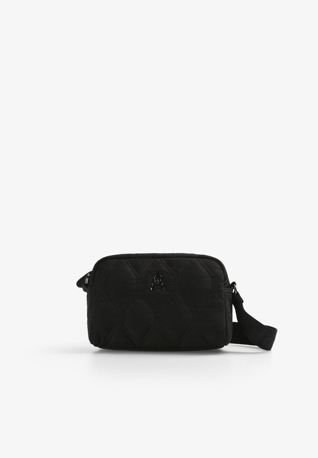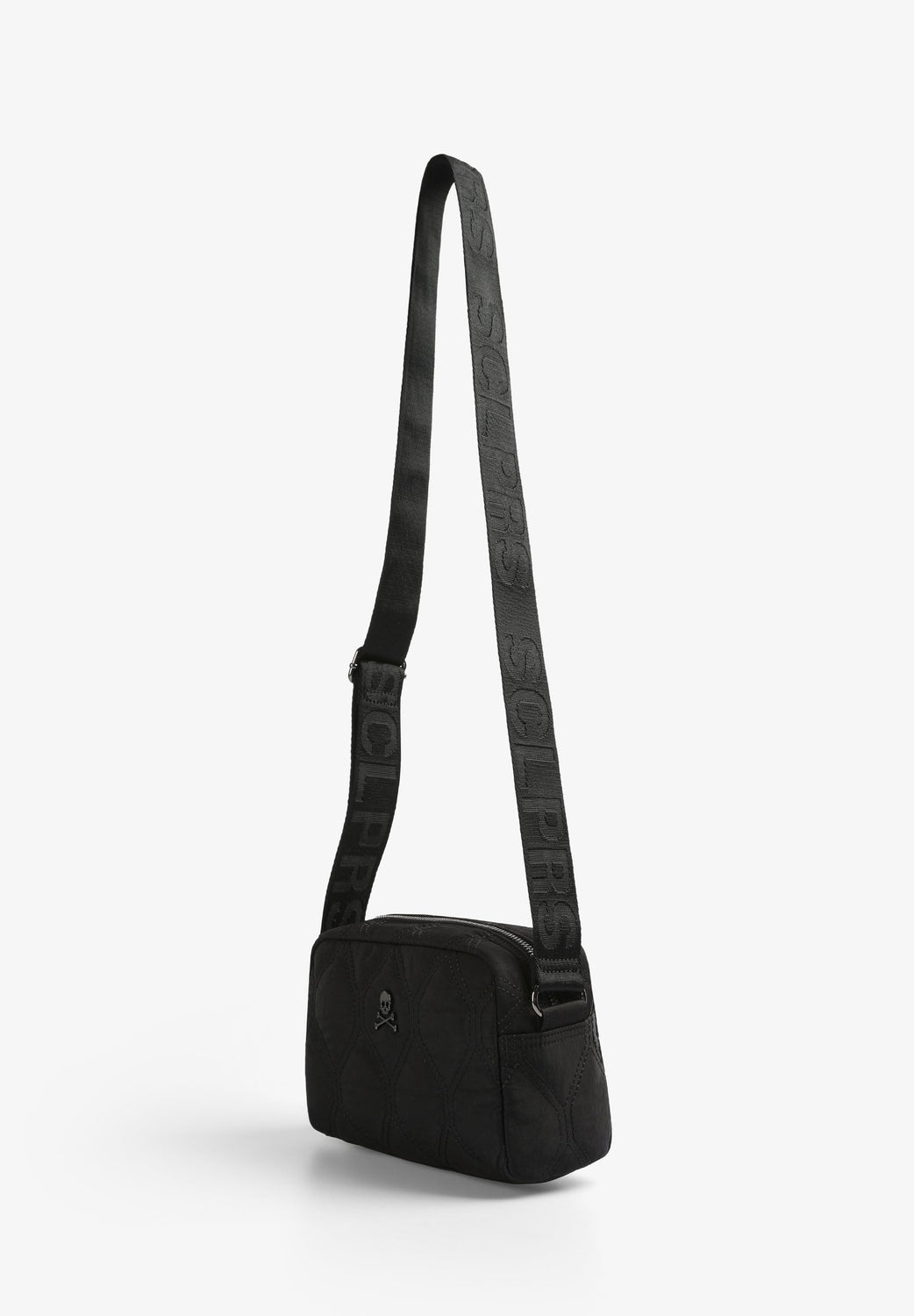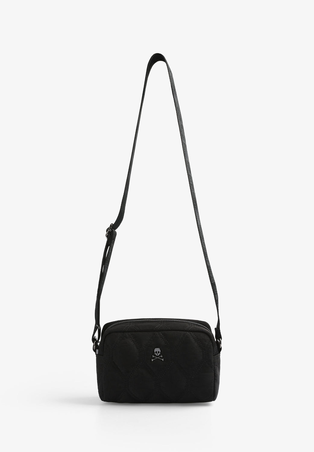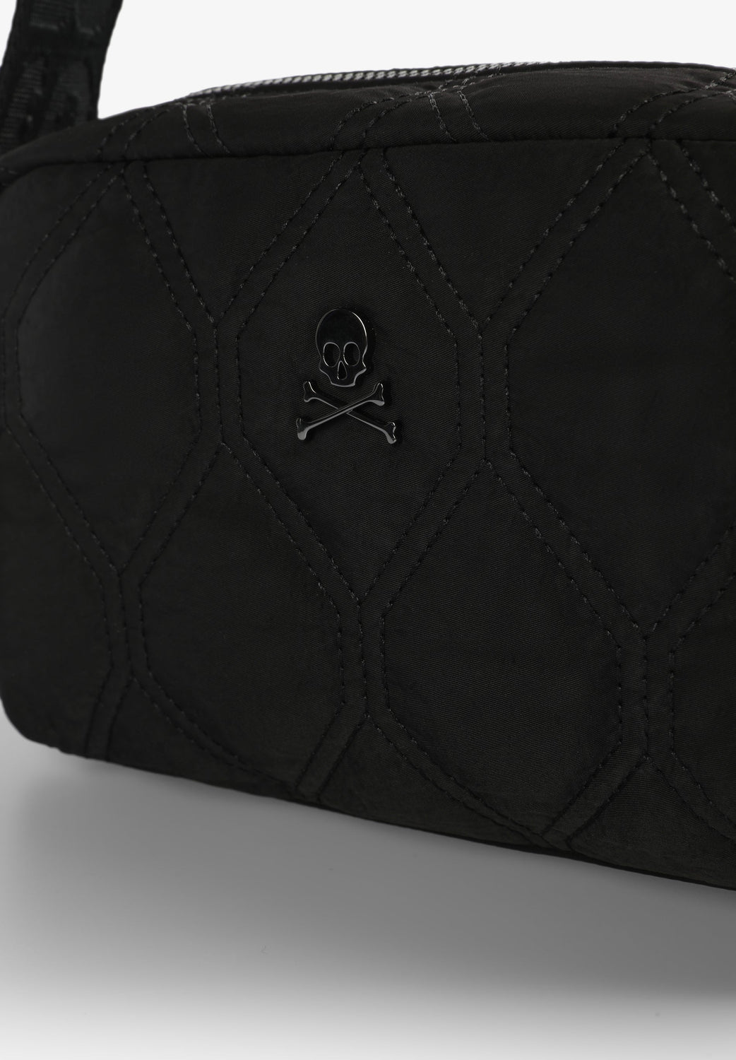 Bolso acolchado metalizado confeccionado en nylon. Asa larga ajustable y cierre con cremallera. Calavera metálica.