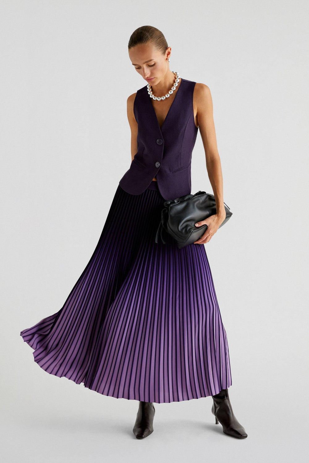 Falda midi plisada confeccionada en tejido fluido. Regular fit, cierre con cremallera.