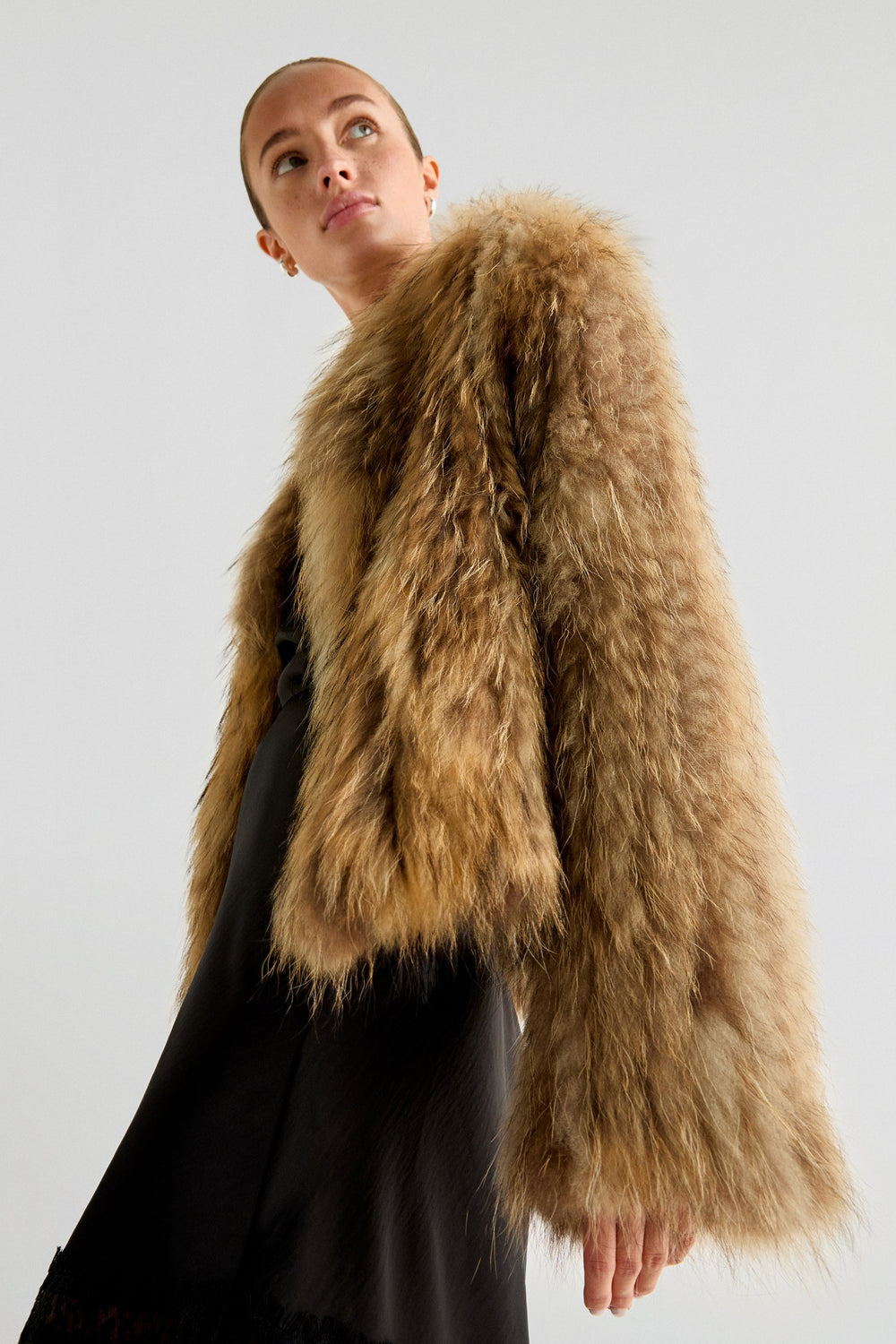 Abrigo premium confeccionada en 100% pelo. Regular fit, escote cerrado y cierre con corchetes. Manga larga.