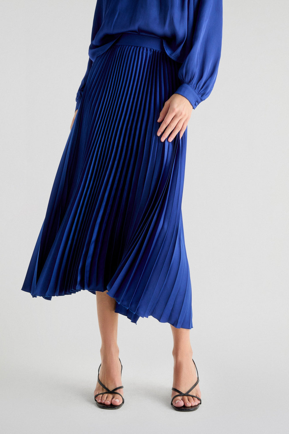 Falda midi con tablas confeccionada en tejido fluido. Regular fit, cierre con cremallera y bajo asimétrico.