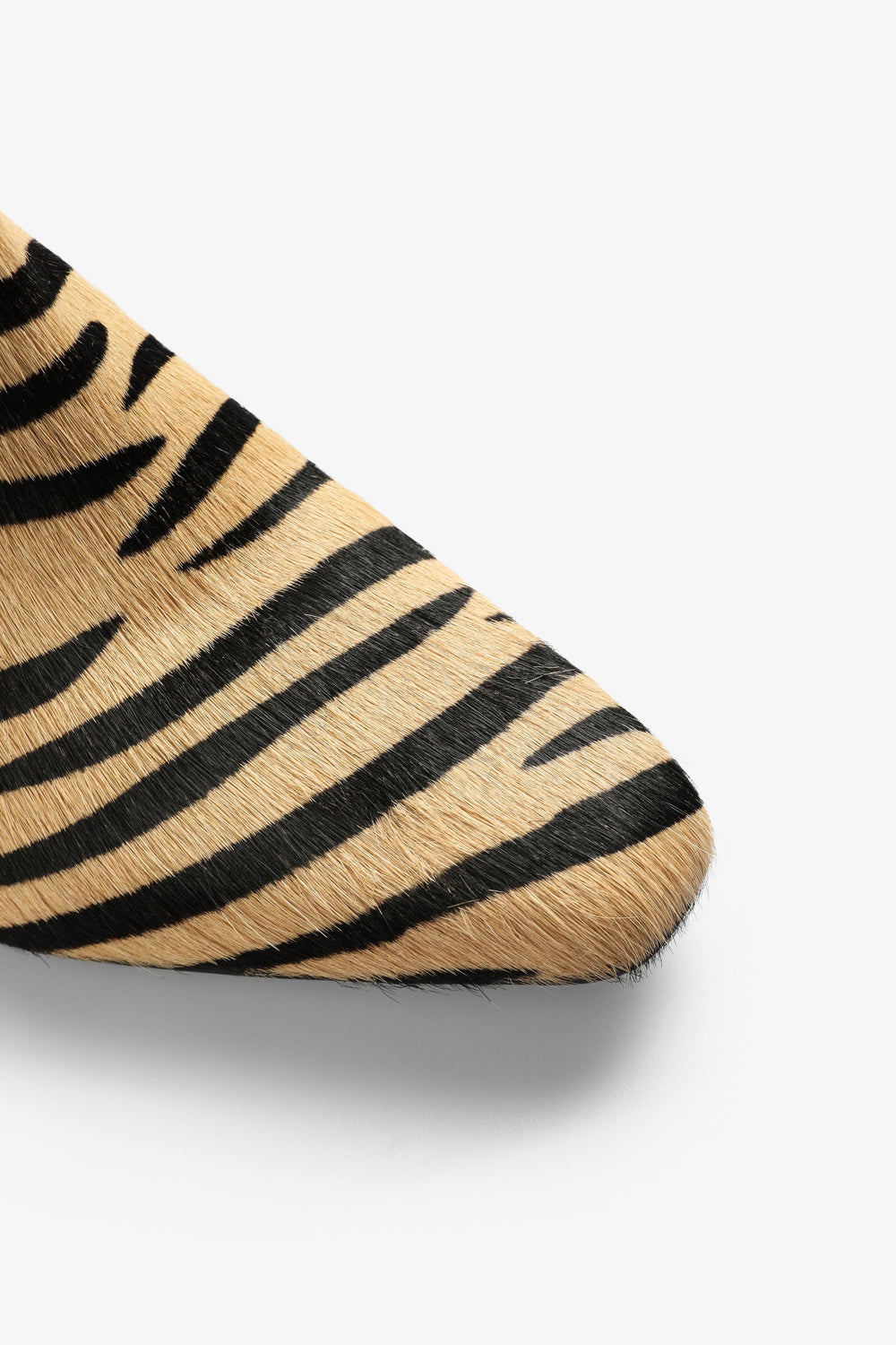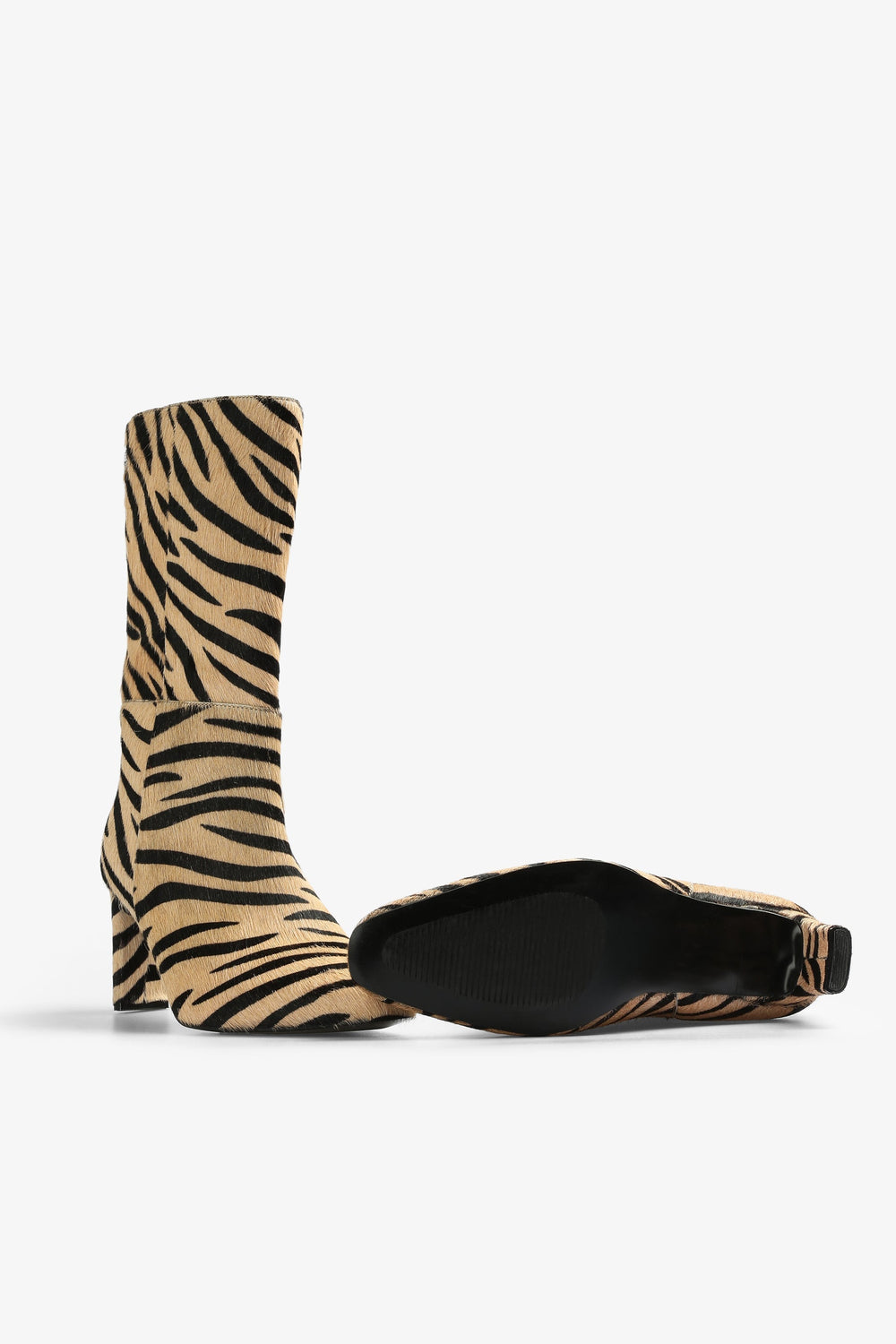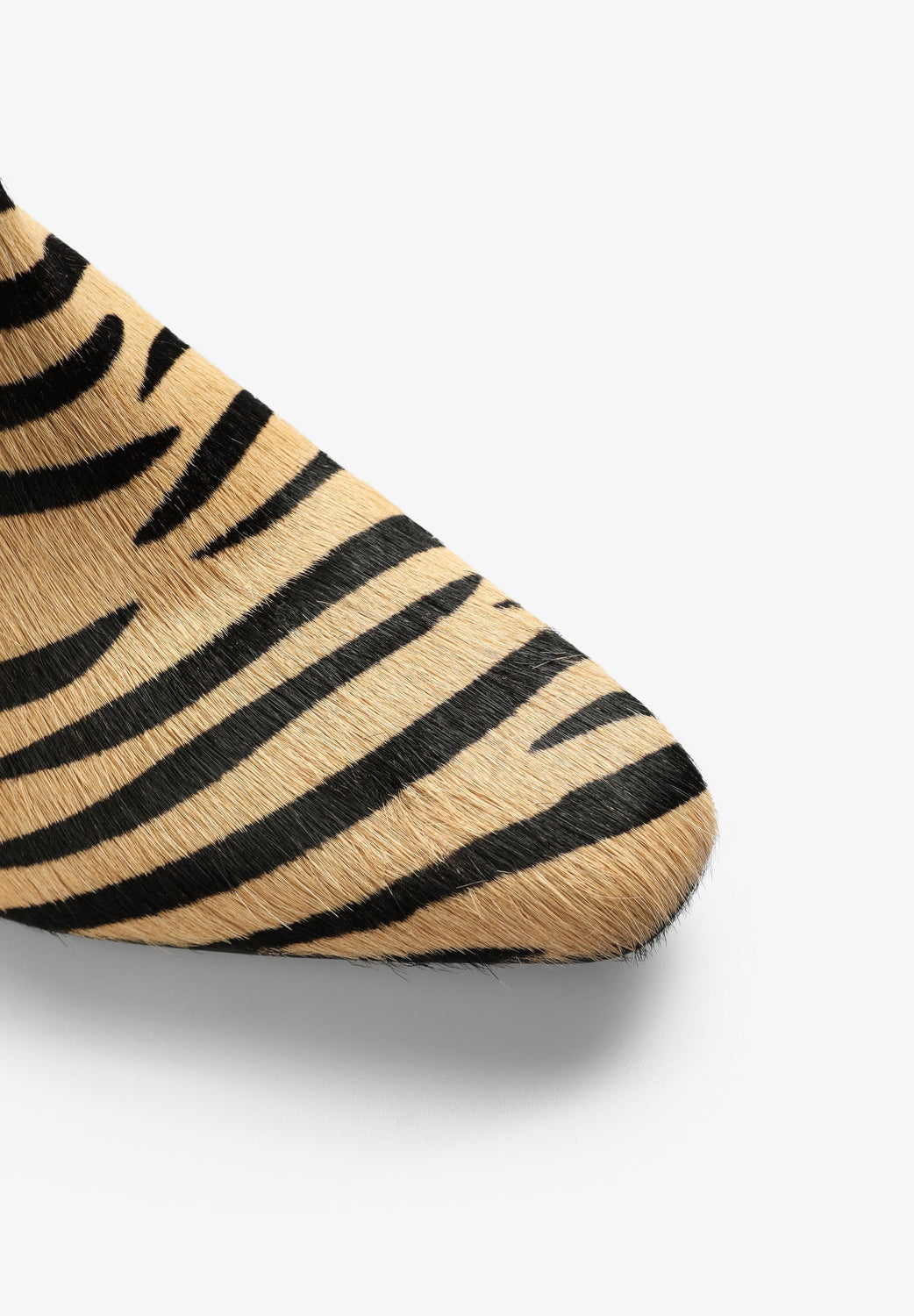 Botas de inspiración de cebra confeccionadas en 100% piel. Caña media, tacón alto y detalle de calavera metálica.