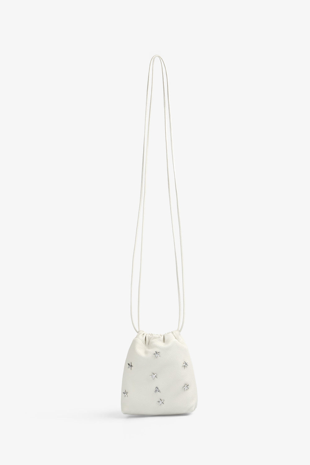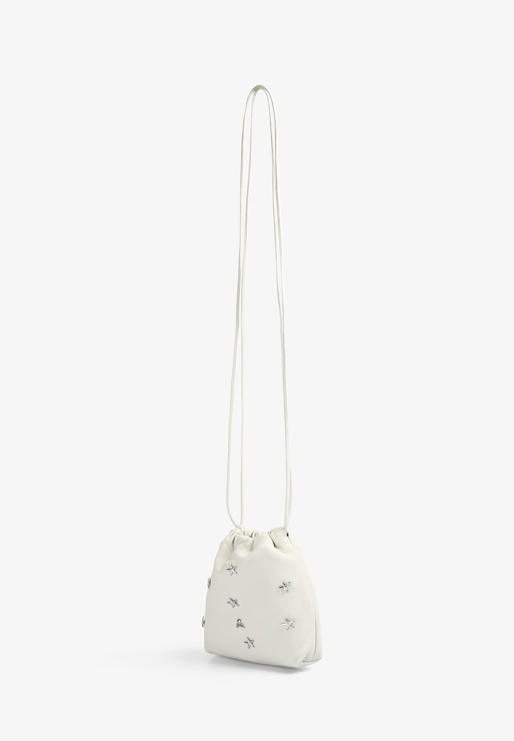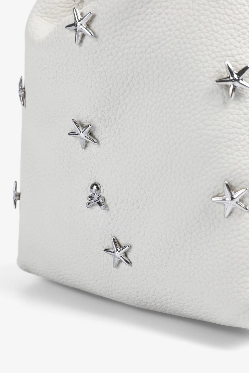Bolso tipo saco bandolera de tamaño pequeño. Confeccionado en 100% piel. Cierre ajustable mediante asa. Doble asa larga. Logo grabado en parte trasera. Detalle frontal de tachuelas de calavera y estrellas.