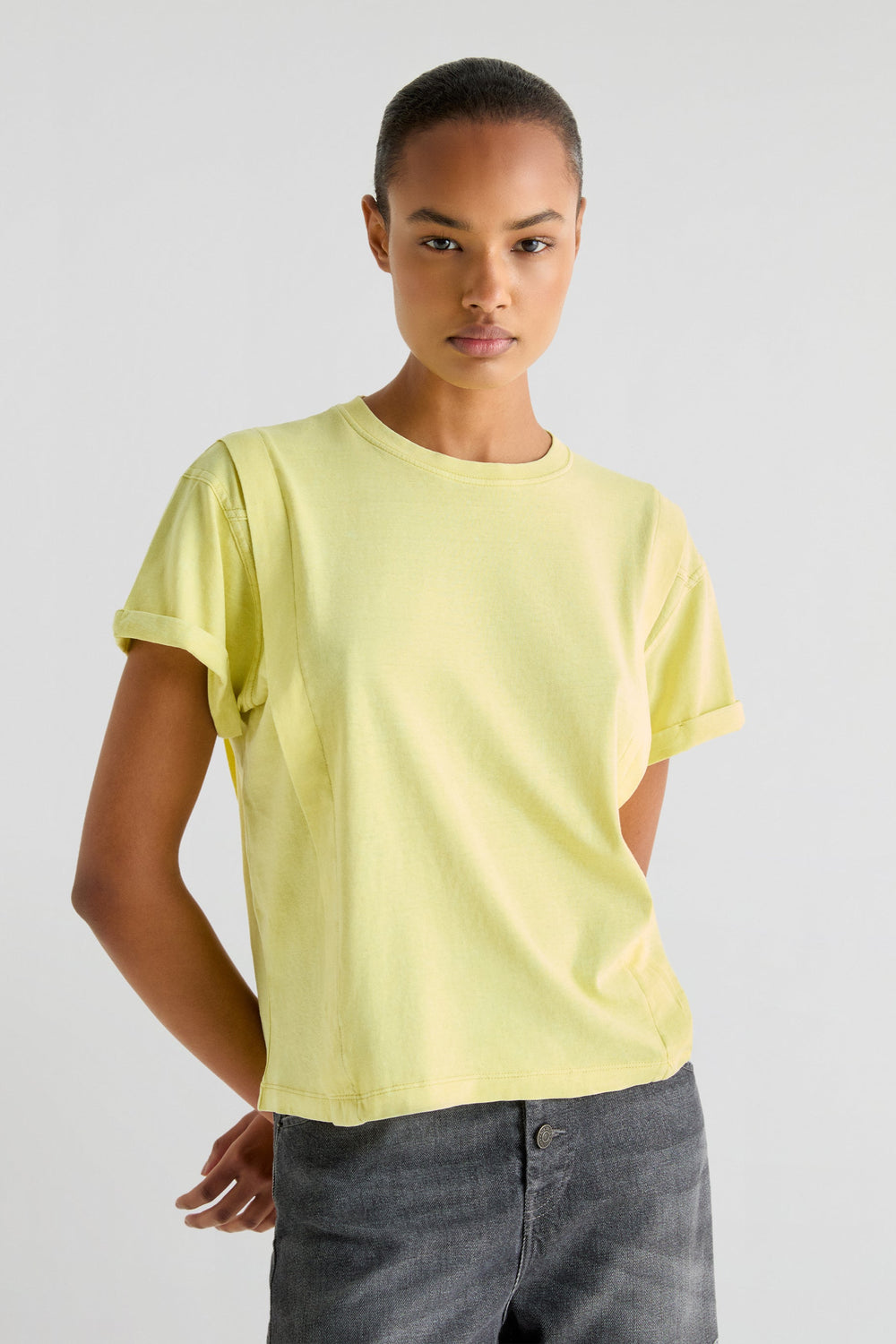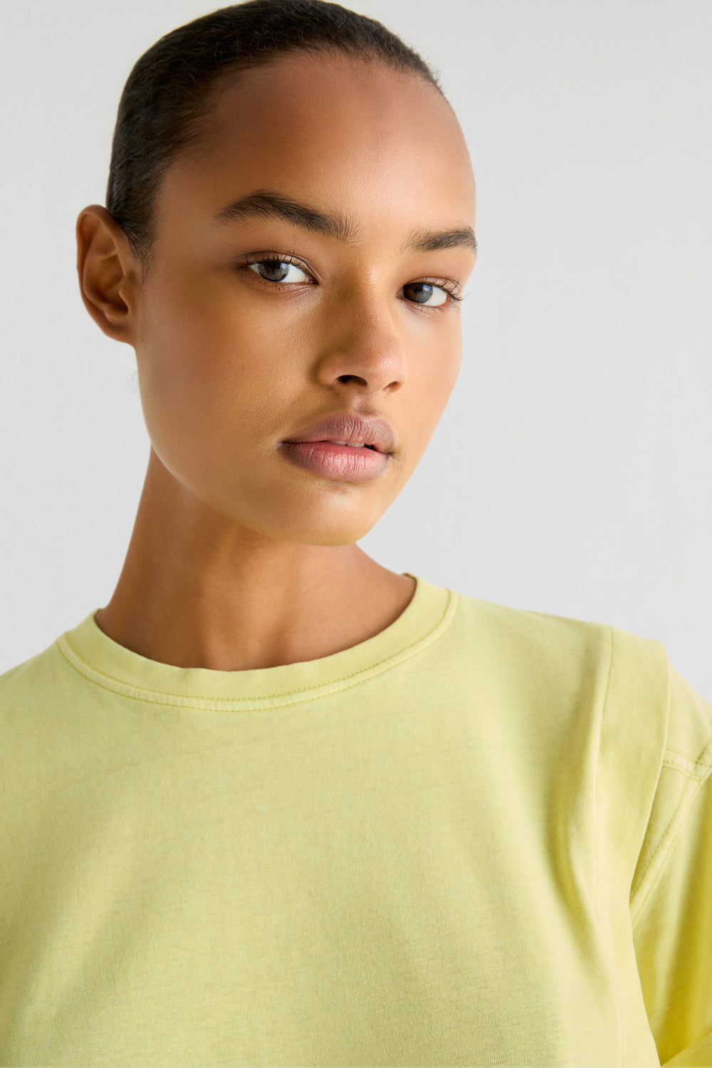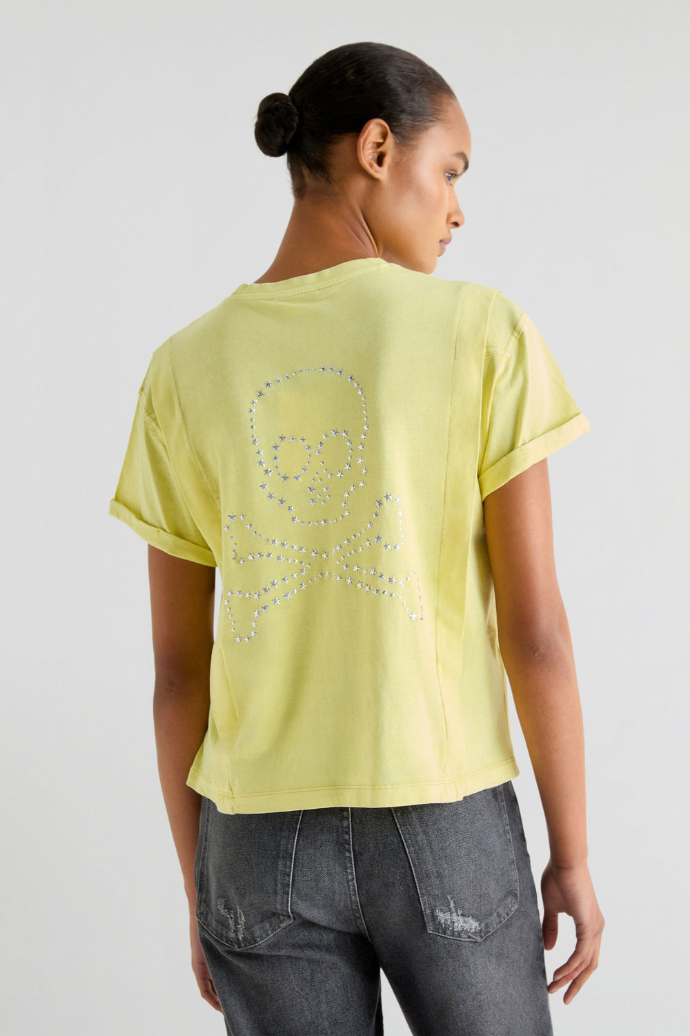 Camiseta lavada confeccionada en 100% algodón BCI. Regular fit, cuello redondo y manga corta. Calavera trasera con cristales y detalle de pliegues.