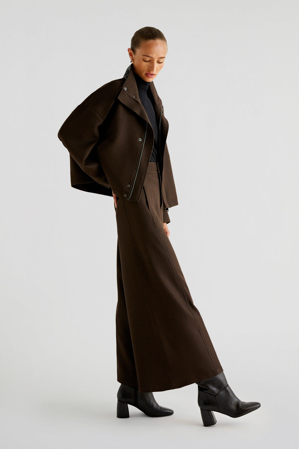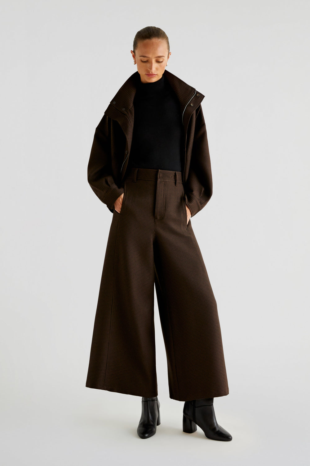 Pantalón confeccionado en tejido de pata de gallo. Culotte ancho, cierre con cremallera y corchete y trabillas en cintura. Bolsillos laterales.