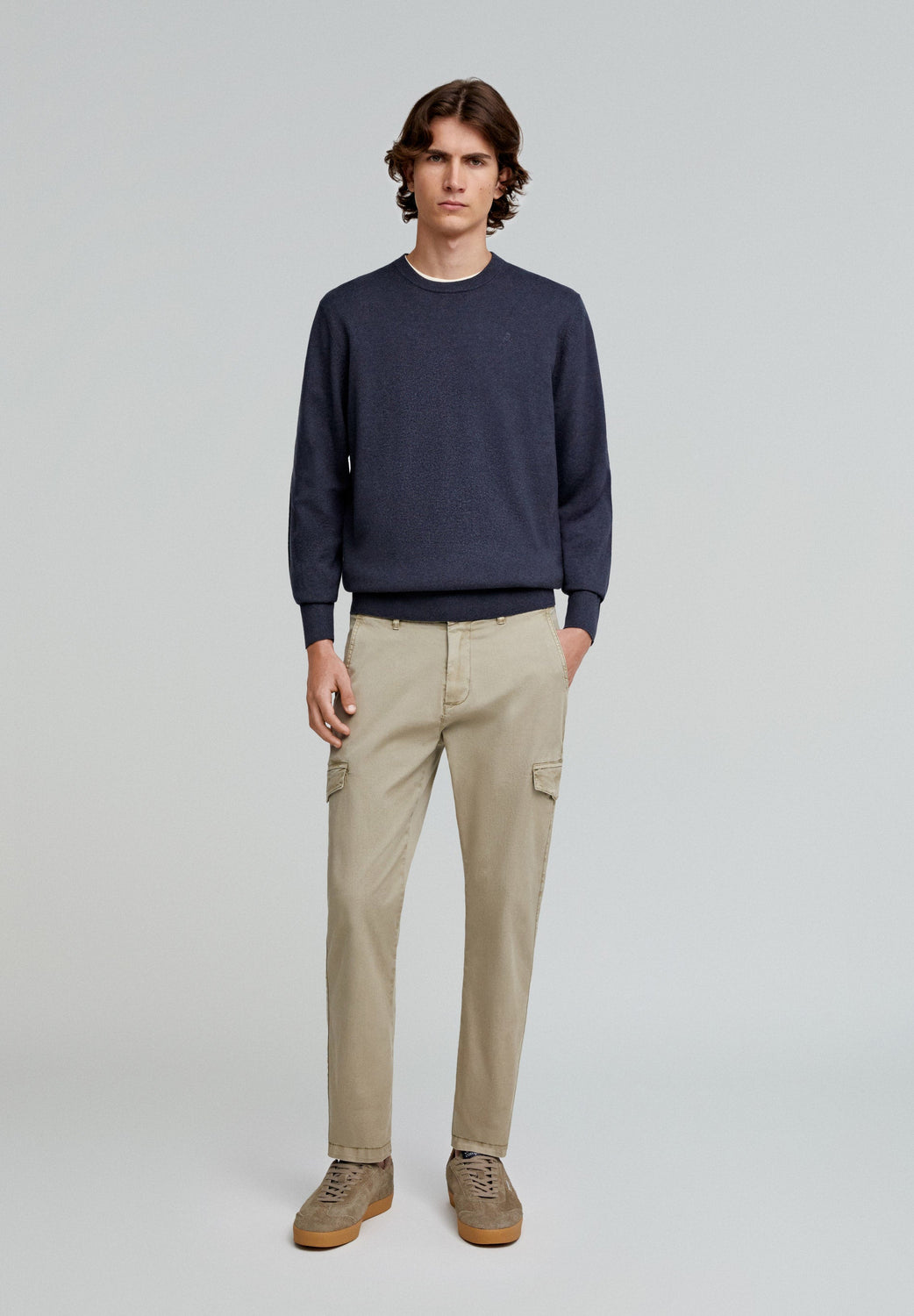 Pantalón cargo confeccionado en tejido de algodón ligeramente elástico. Regular fit, cierre con botón y cremallera. Trabillas en cintura. Bolsillos en pernera.