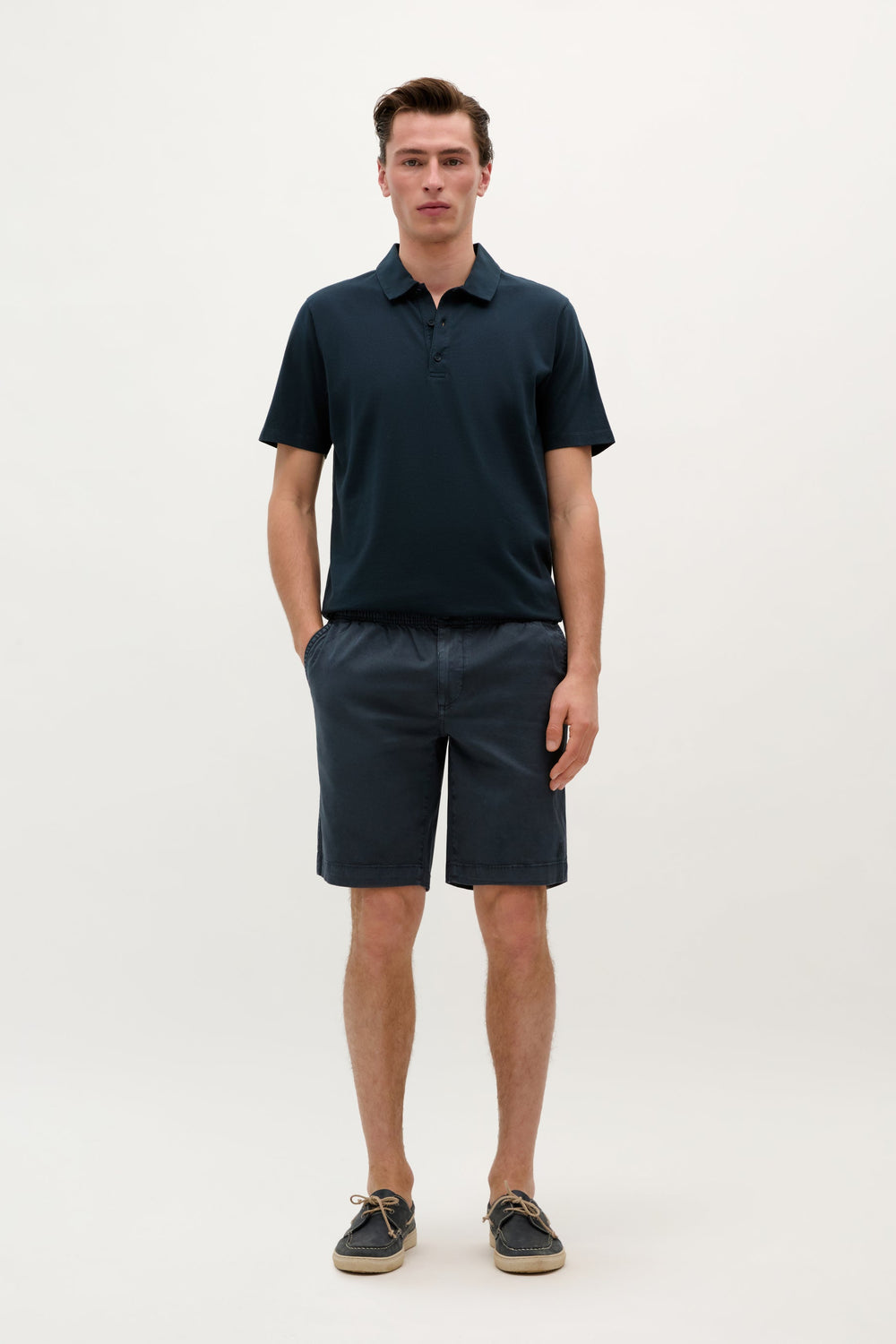 Bermuda confeccionada en Algodón Orgánico. Bolsillos laterales. Bolsillos en espalda con cierre por abotonadura. Cierre en frontal por cremallera y botón. Detalle de logo en espalda.
