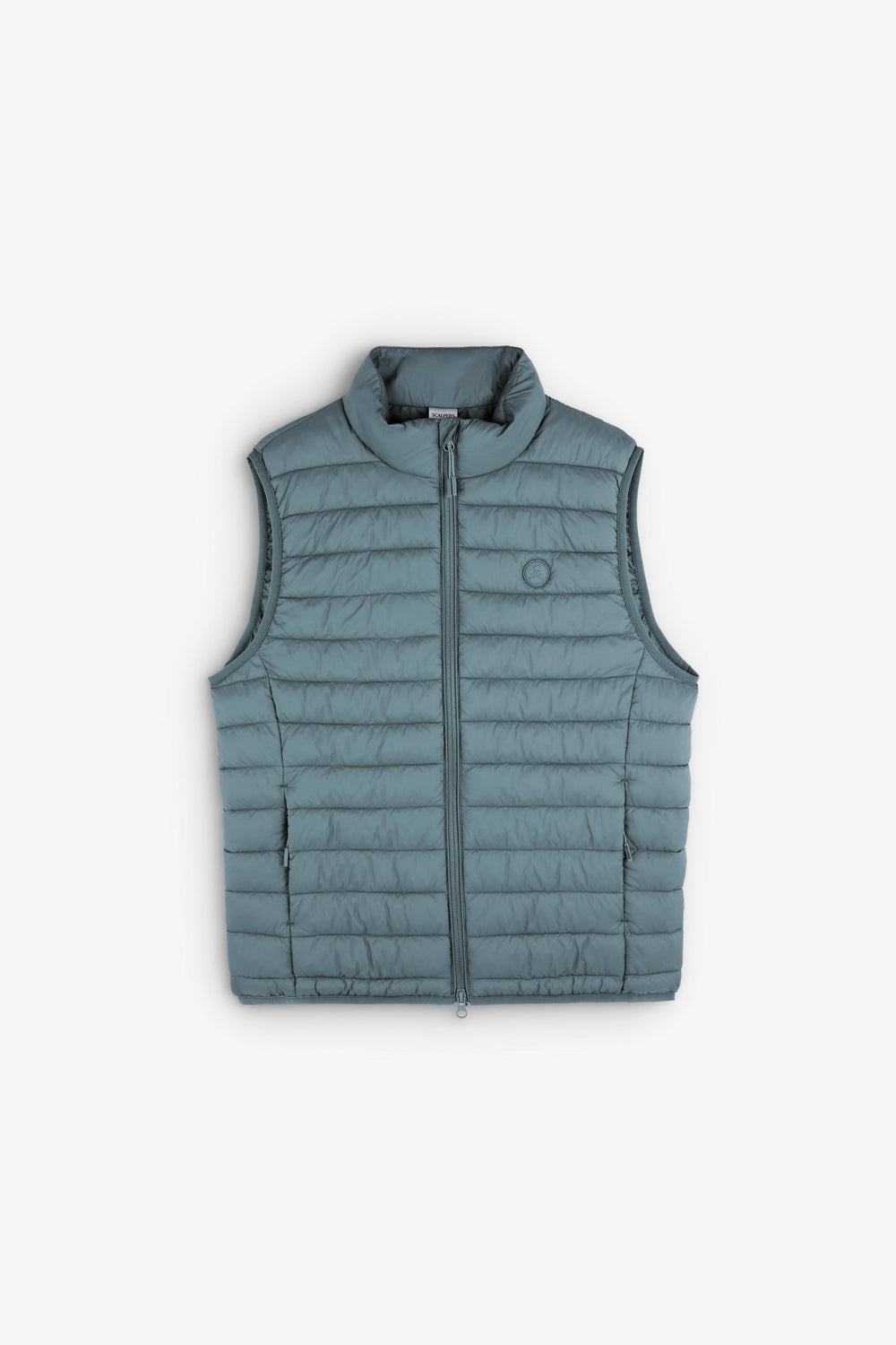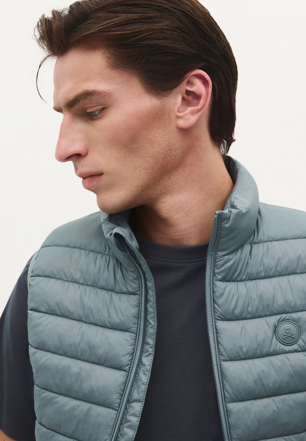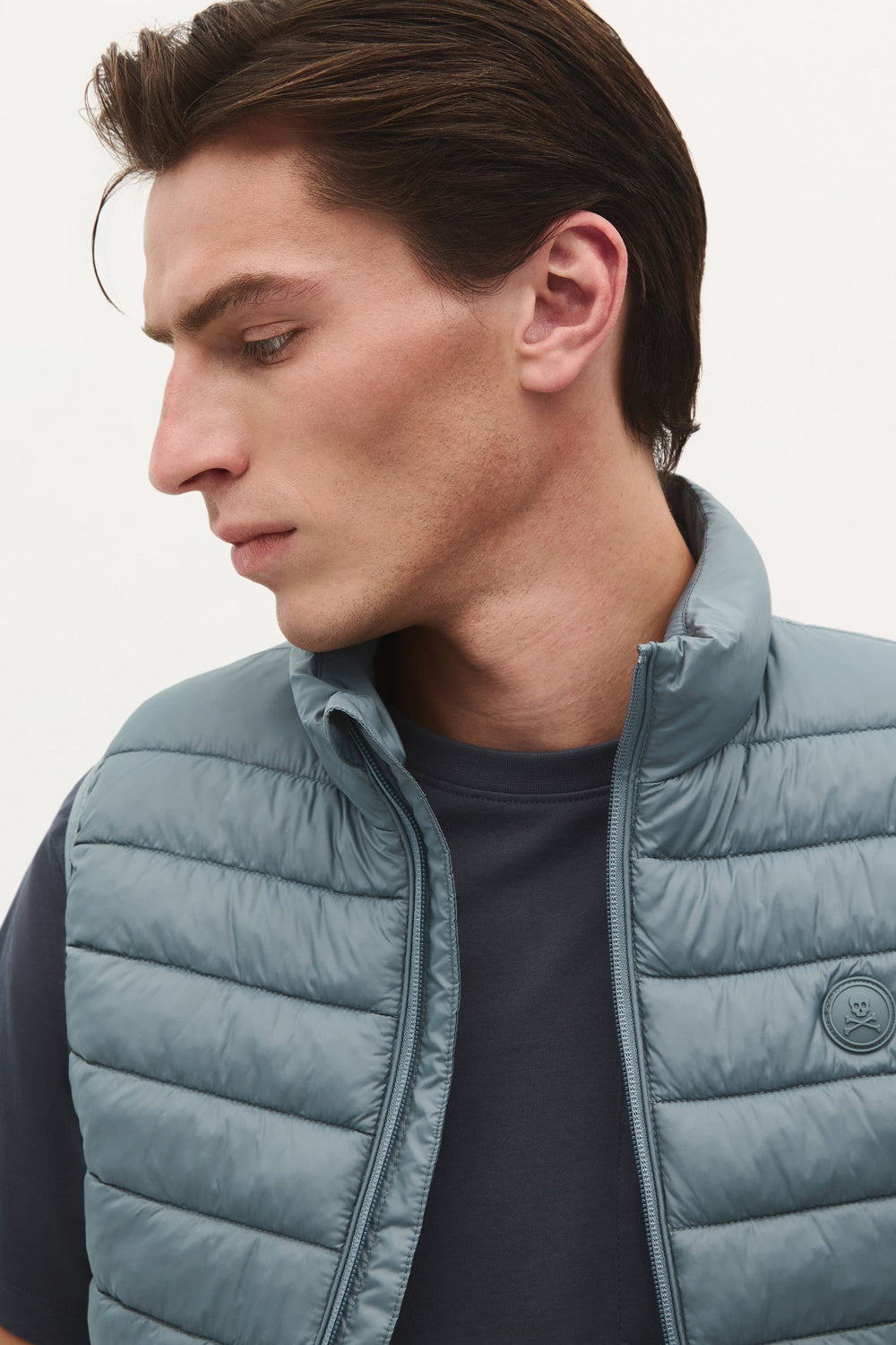 Chaleco acolchado confeccionado en tejido reciclado. Regular fit, cuello subido y cierre con cremallera de doble carro. Manga en sisa y bolsillos laterales con cremallera. Parche de calavera en pecho.
