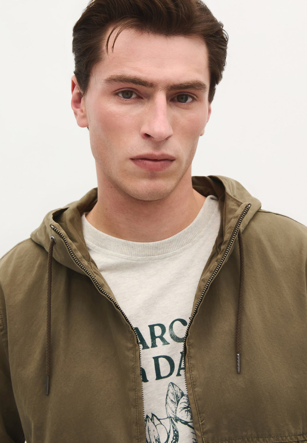 Chaqueta ligera confeccionada en 100% algodón BCI. Regular fit, cuello con capucha ajustable con cordón y cierre con cremallera. Manga larga terminada en elástico y bolsillos laterales con tapeta y snap.
