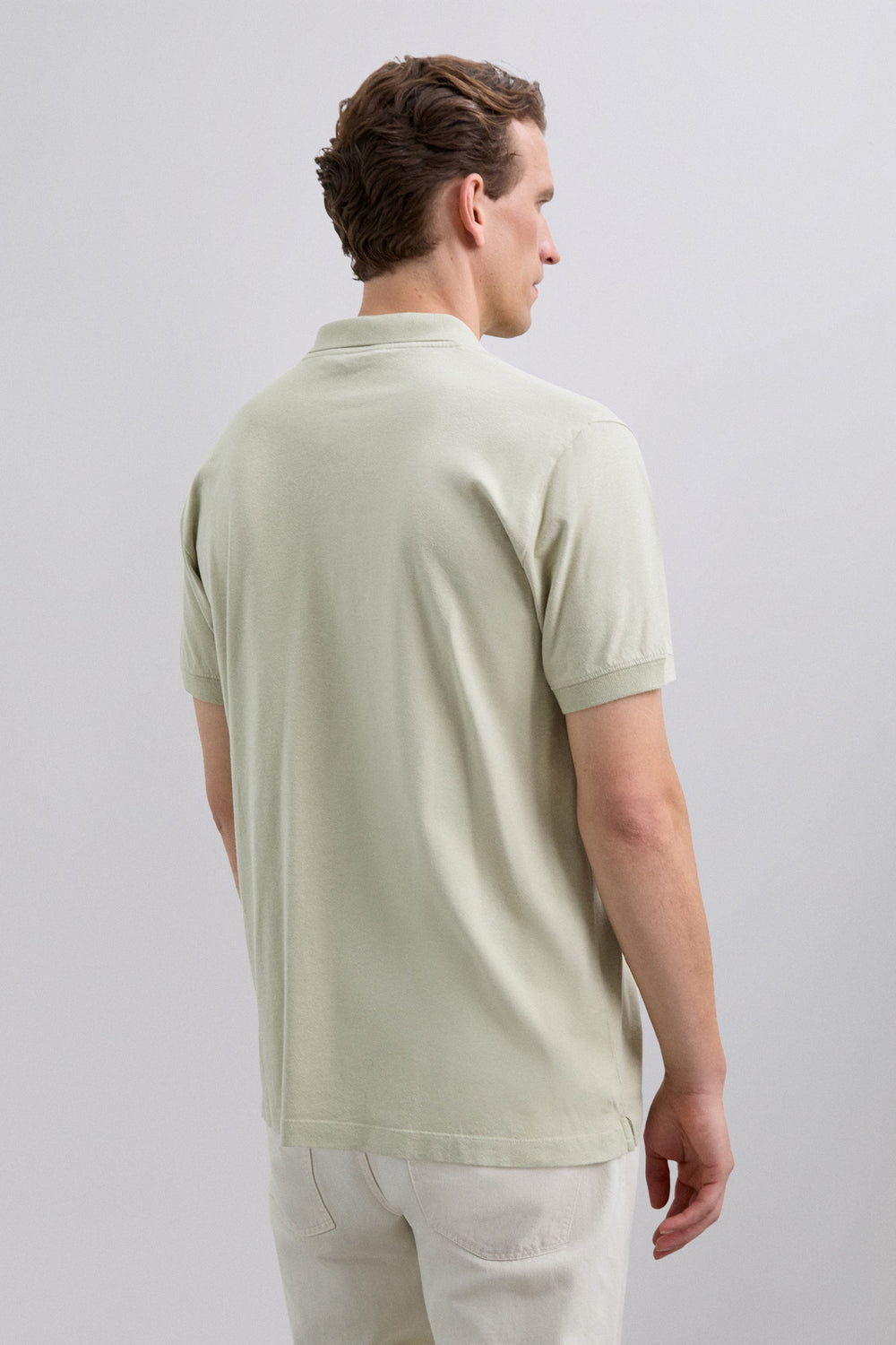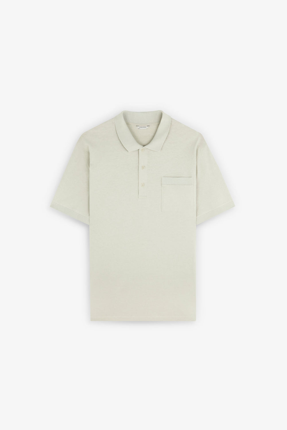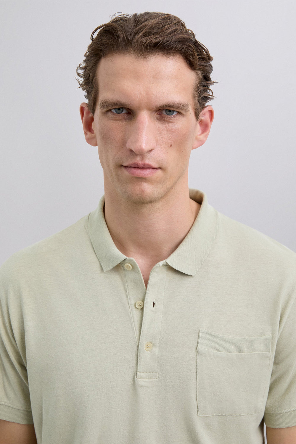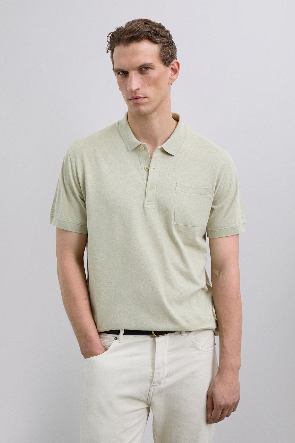 Polo confeccionado en mezcla de algodón y lino. Manga corta. Regular fit. Cuello con cierre de 3 botones. Detalle con bolsillo de parche de punto en el pecho.