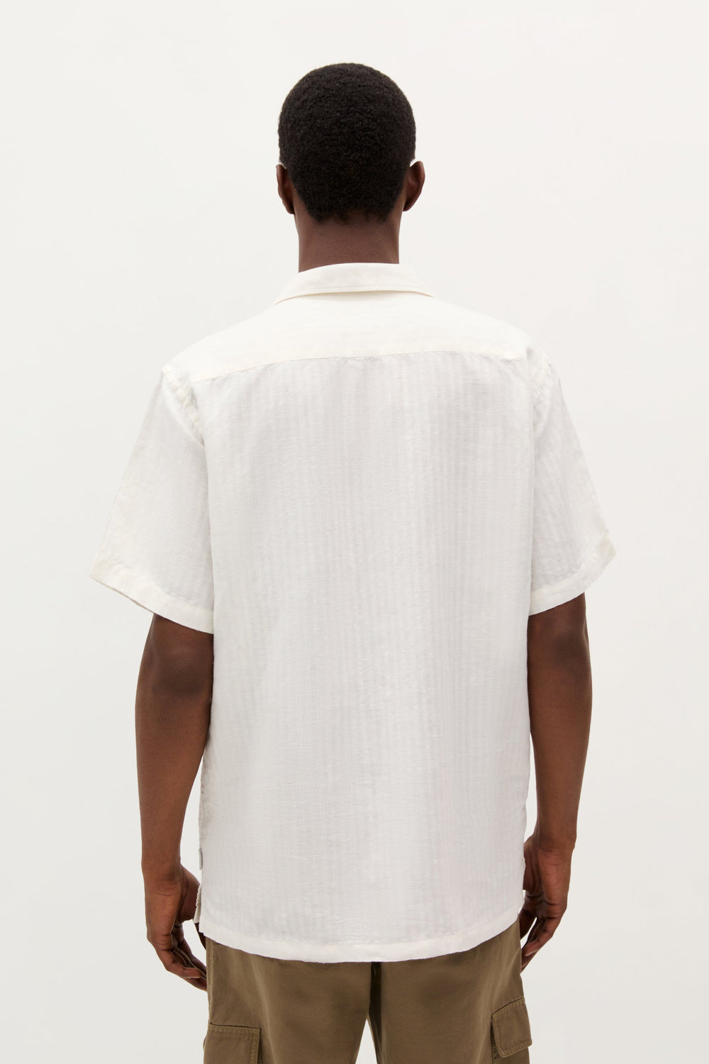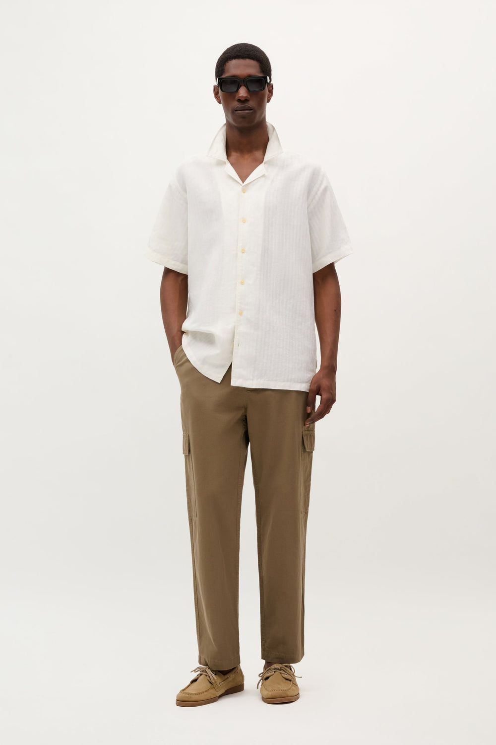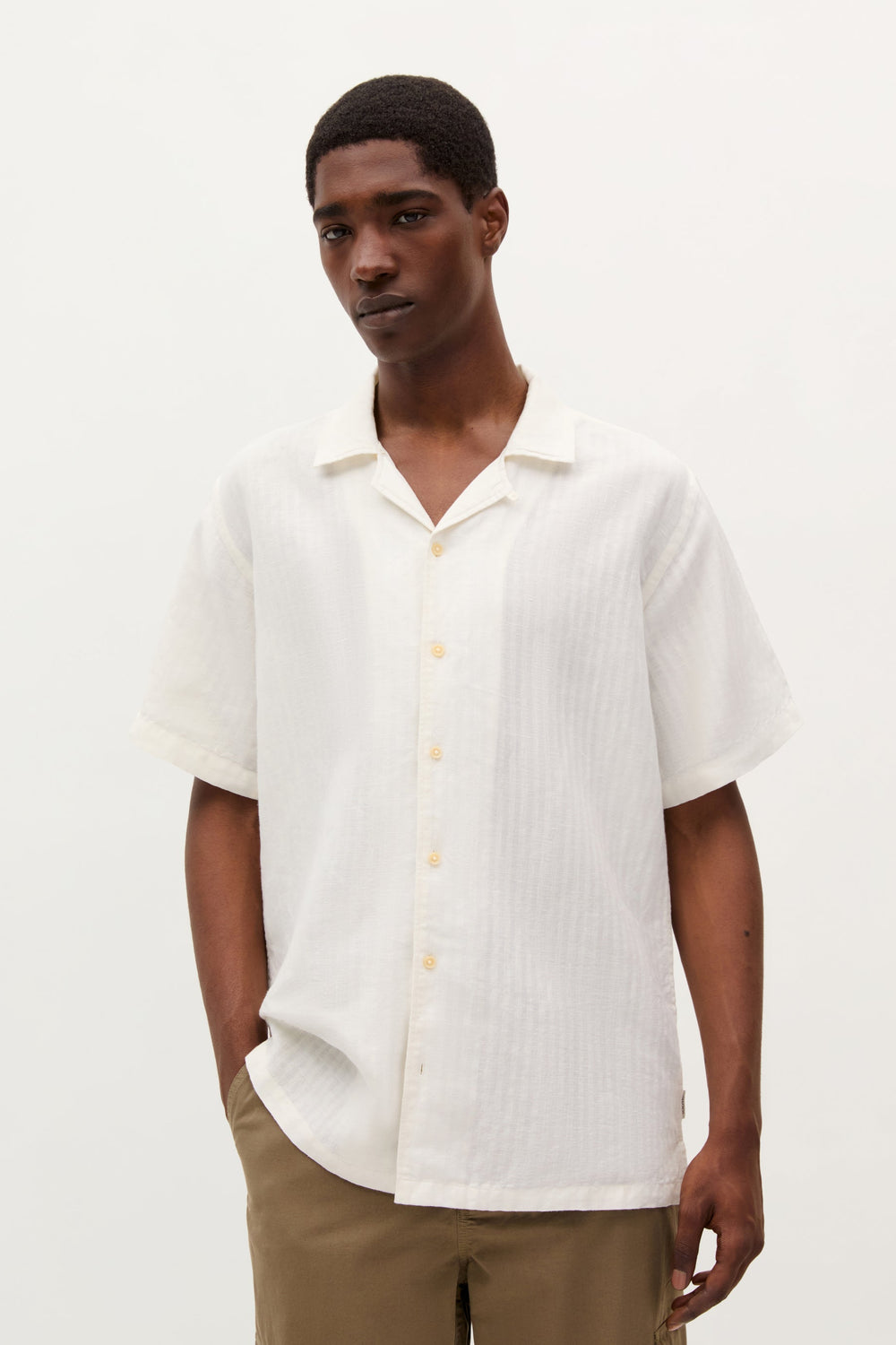 Camisa Resort confeccionada en mezcla de algodón y lino. Corte Regular Fit. Cuello pijamero. Cierre con botones. Manga corta.