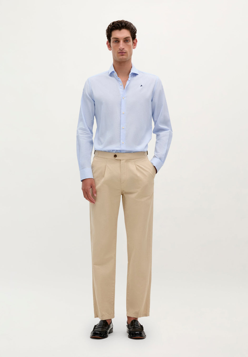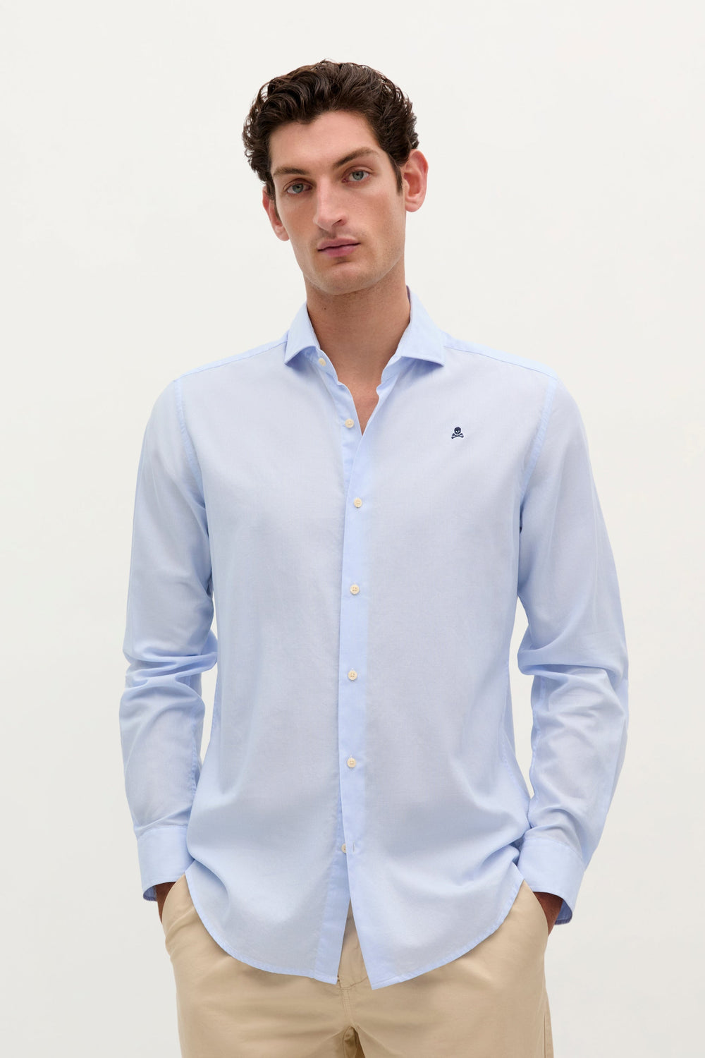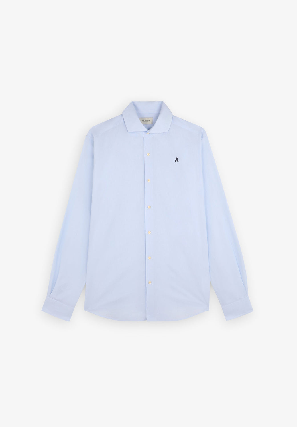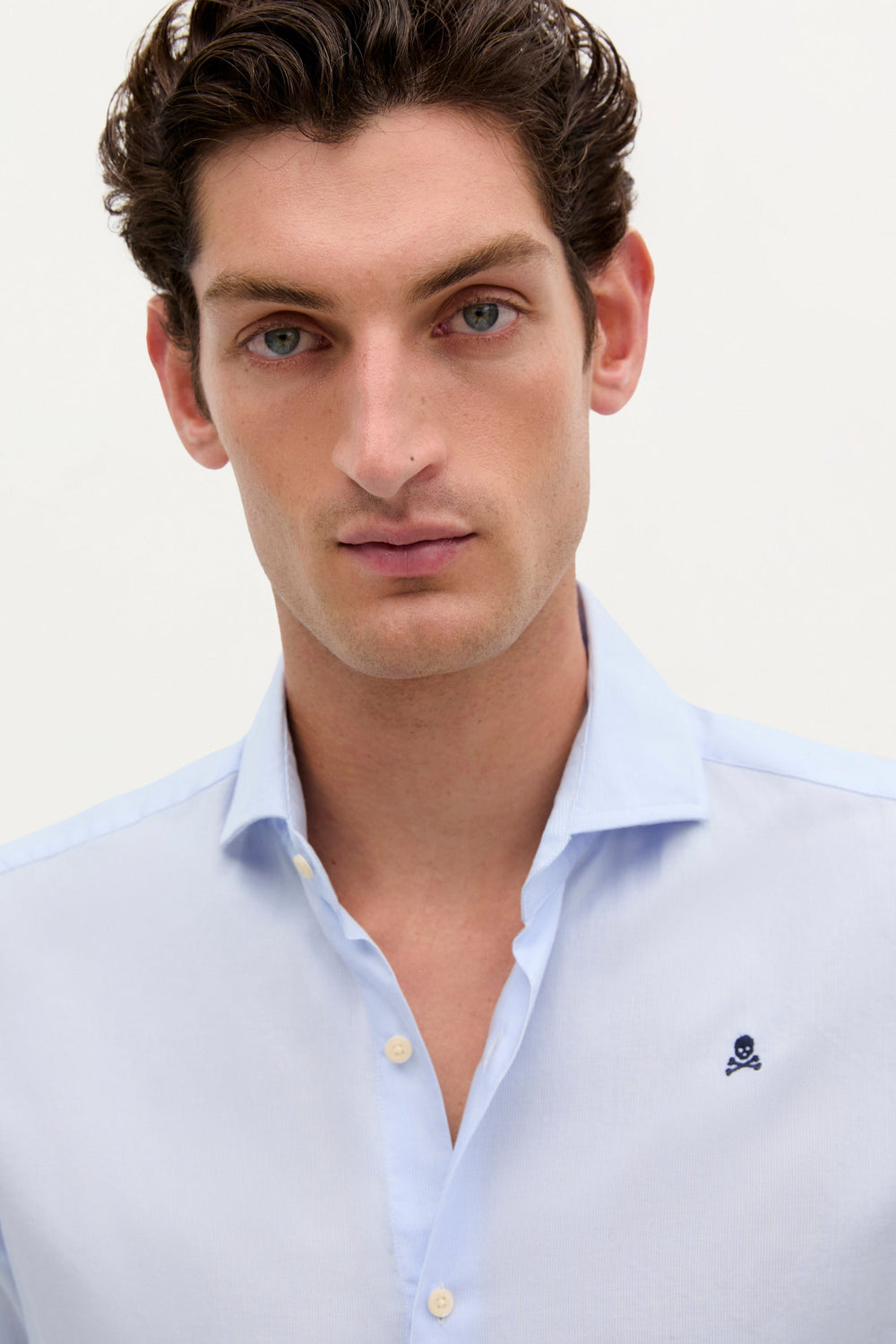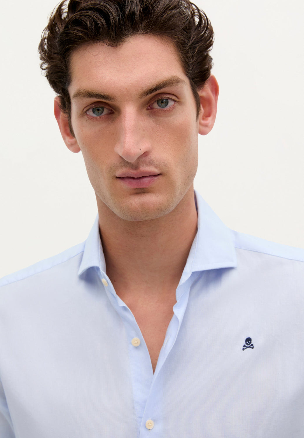 Camisa de rayas confeccionada en 100% algodón. Regular fit, cuello italiano y cierre con botones. Manga larga terminada en puño con botones.