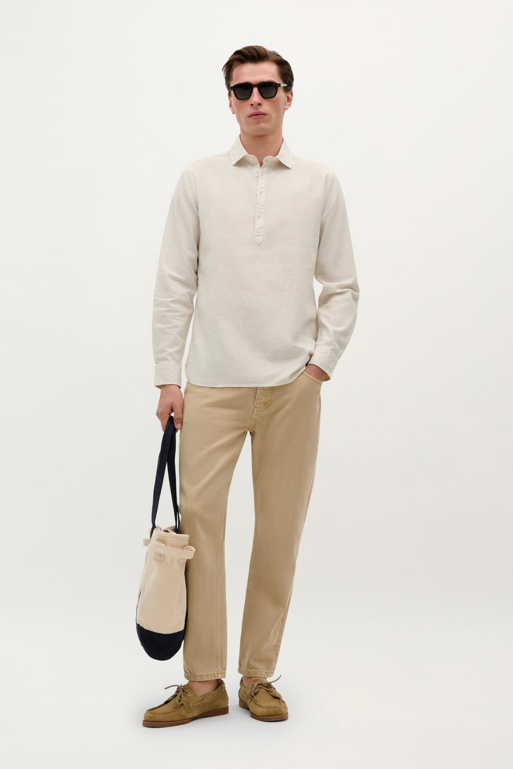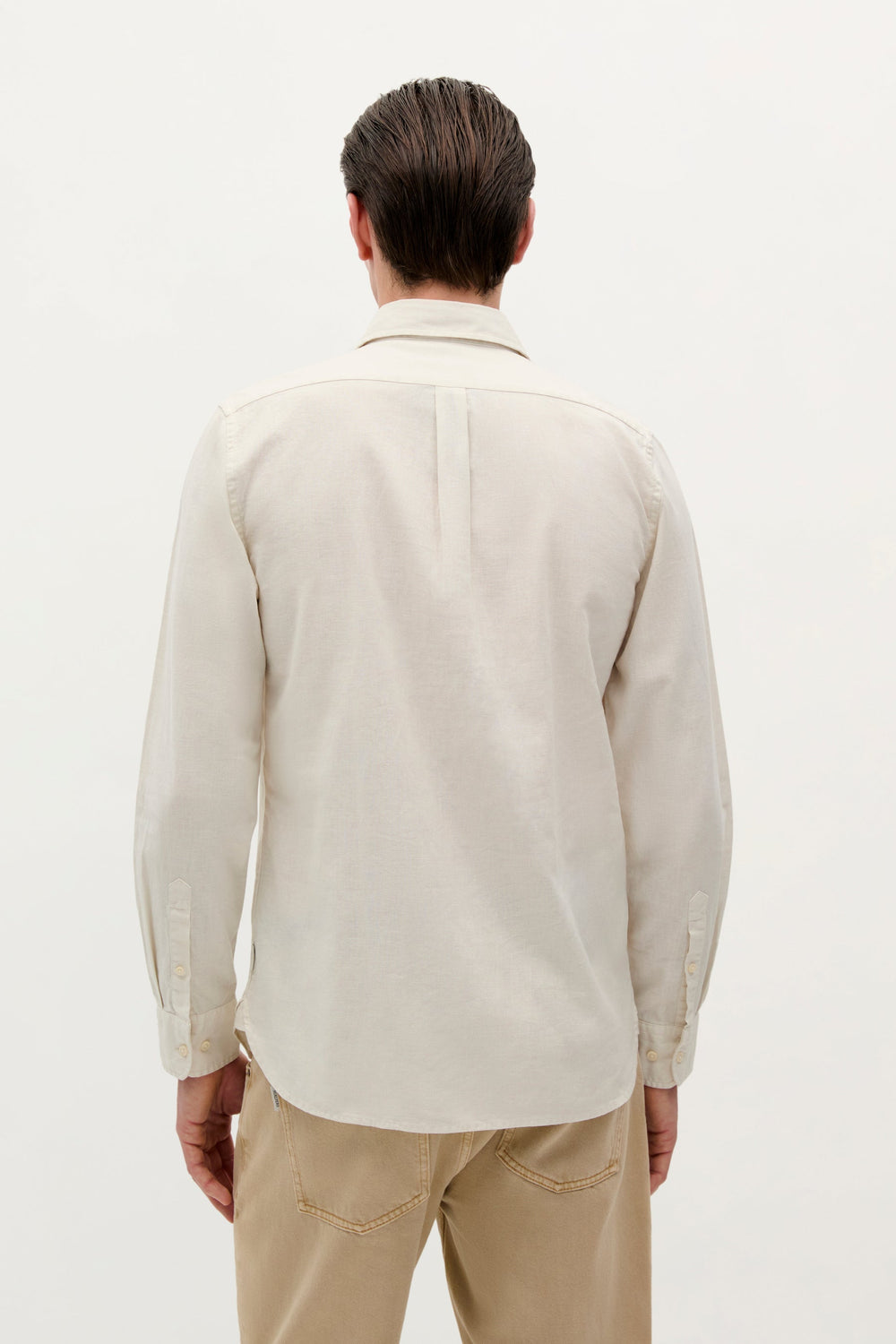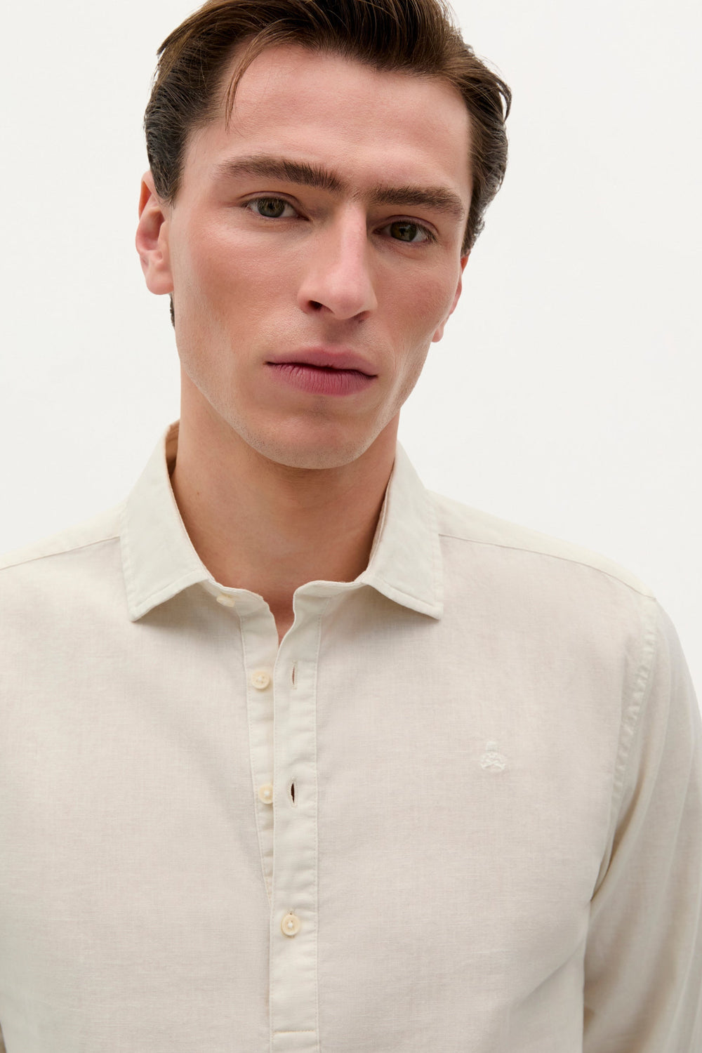 Camisa confeccionada en Algodón y Lino. Cerradura abotonada estilo polo. Manga Larga. Cierre en puños ajustable mediante botón. Monograma bordado a tono en parte frontal.